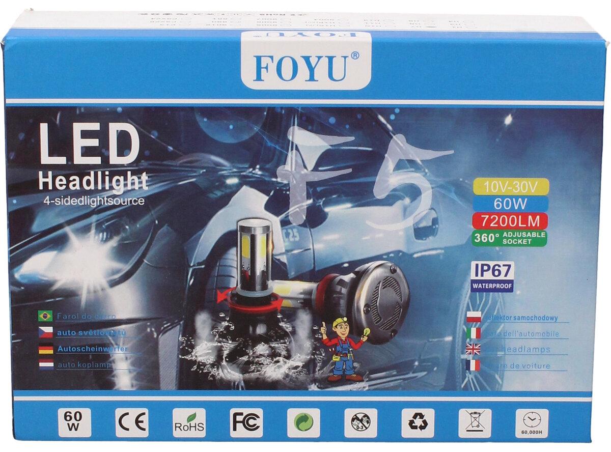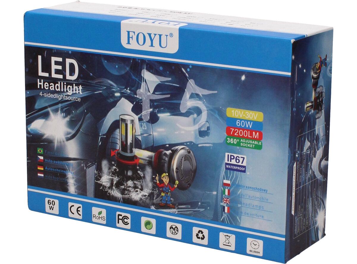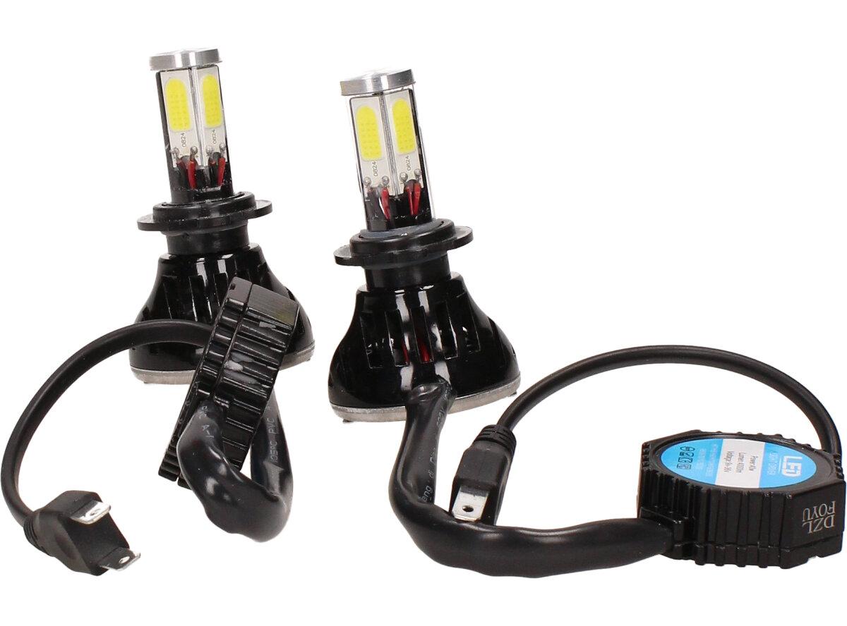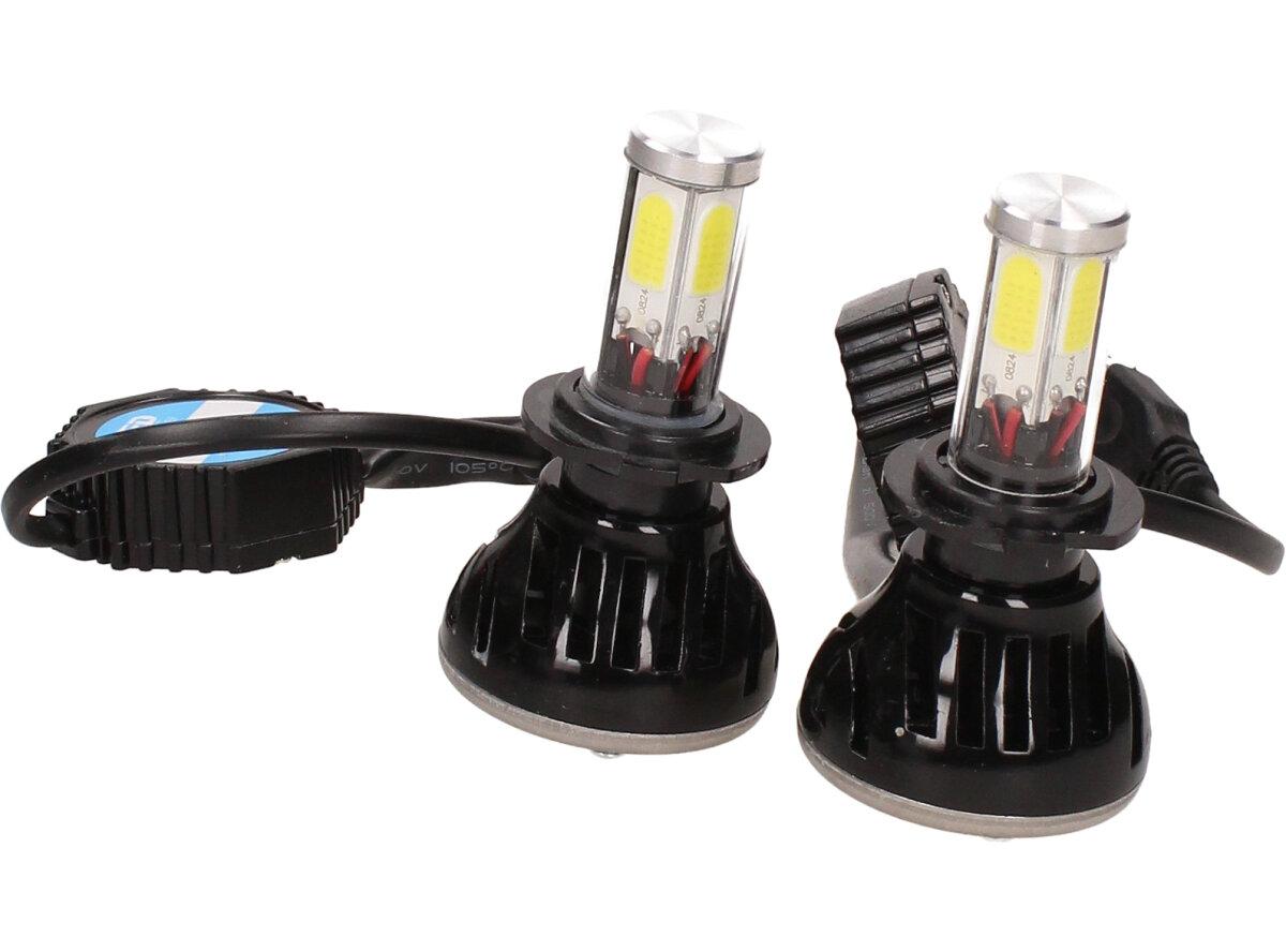 Velice výkonná a odolná LED H7 F5 žárovka s barvou světla 6000K (studená bílá) sada 2 kusy do světlometu do auta na 12V, 24V jako náhrada za klasickou nevýkonou žárovku H7. Tato žárovka je opravdu výkonná, protože místo dvou chipů má dvojnásobný počet a to 4 a svítí tak 360° kolem dokola.