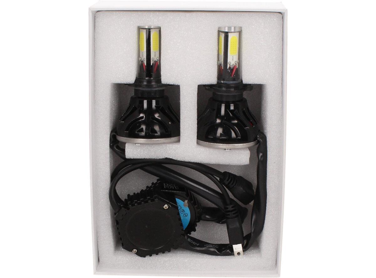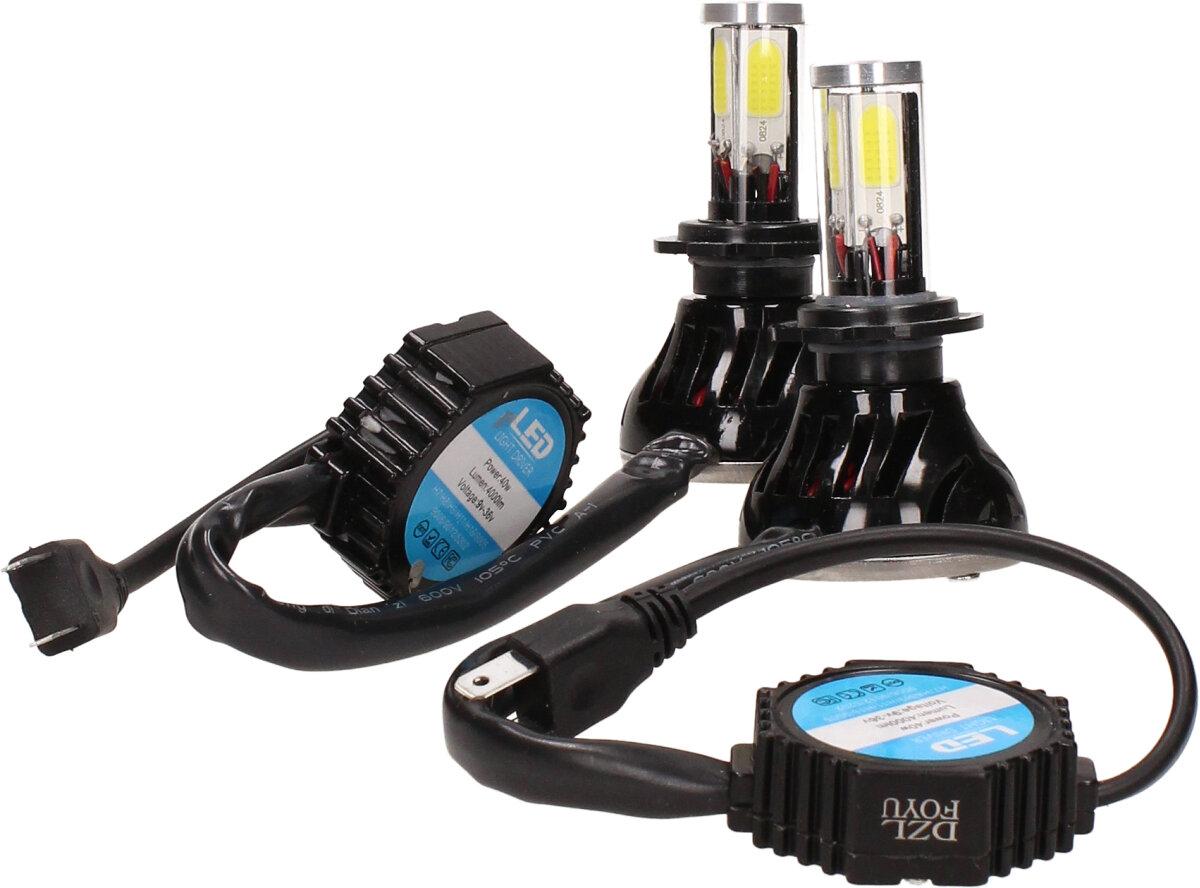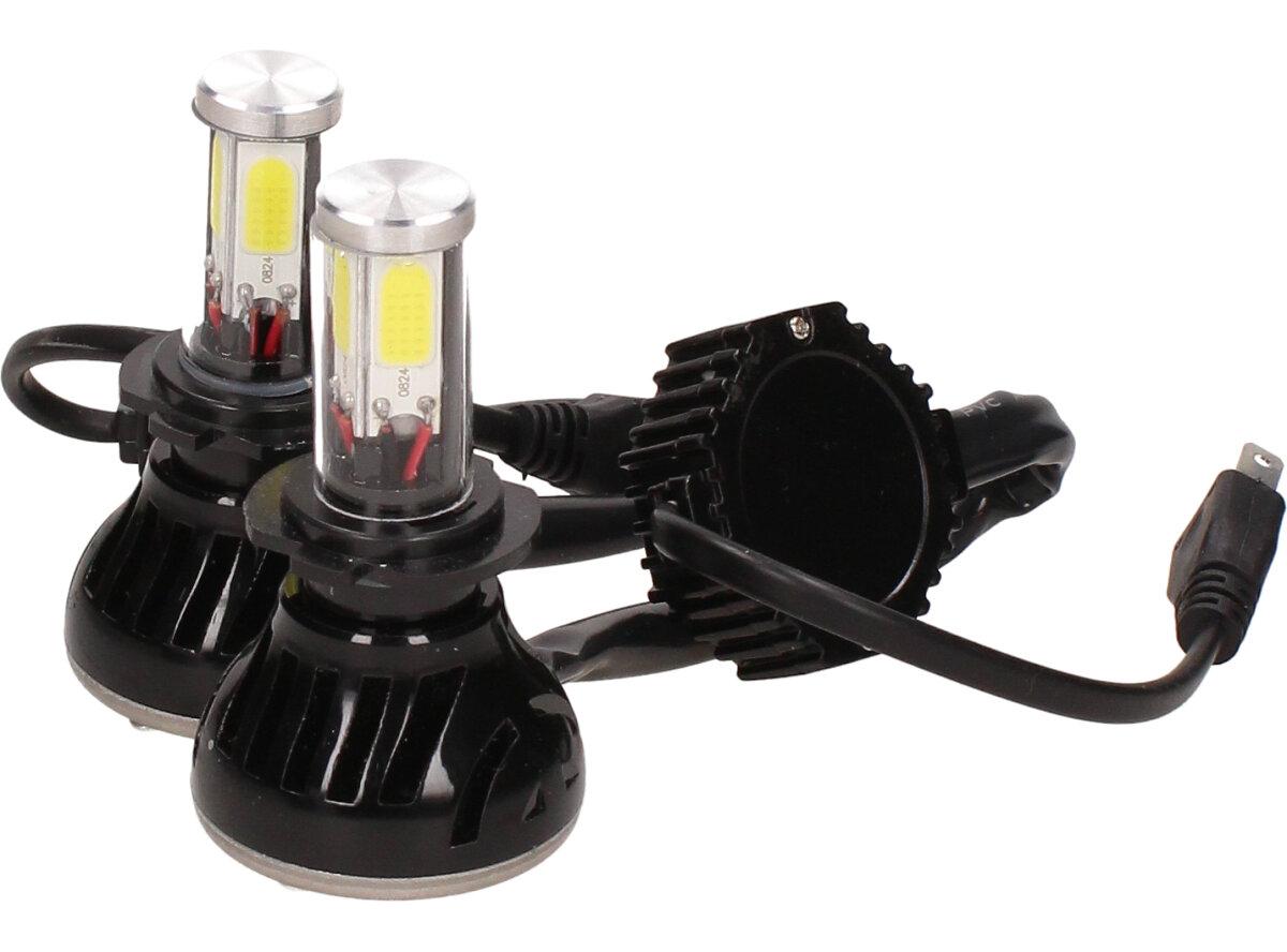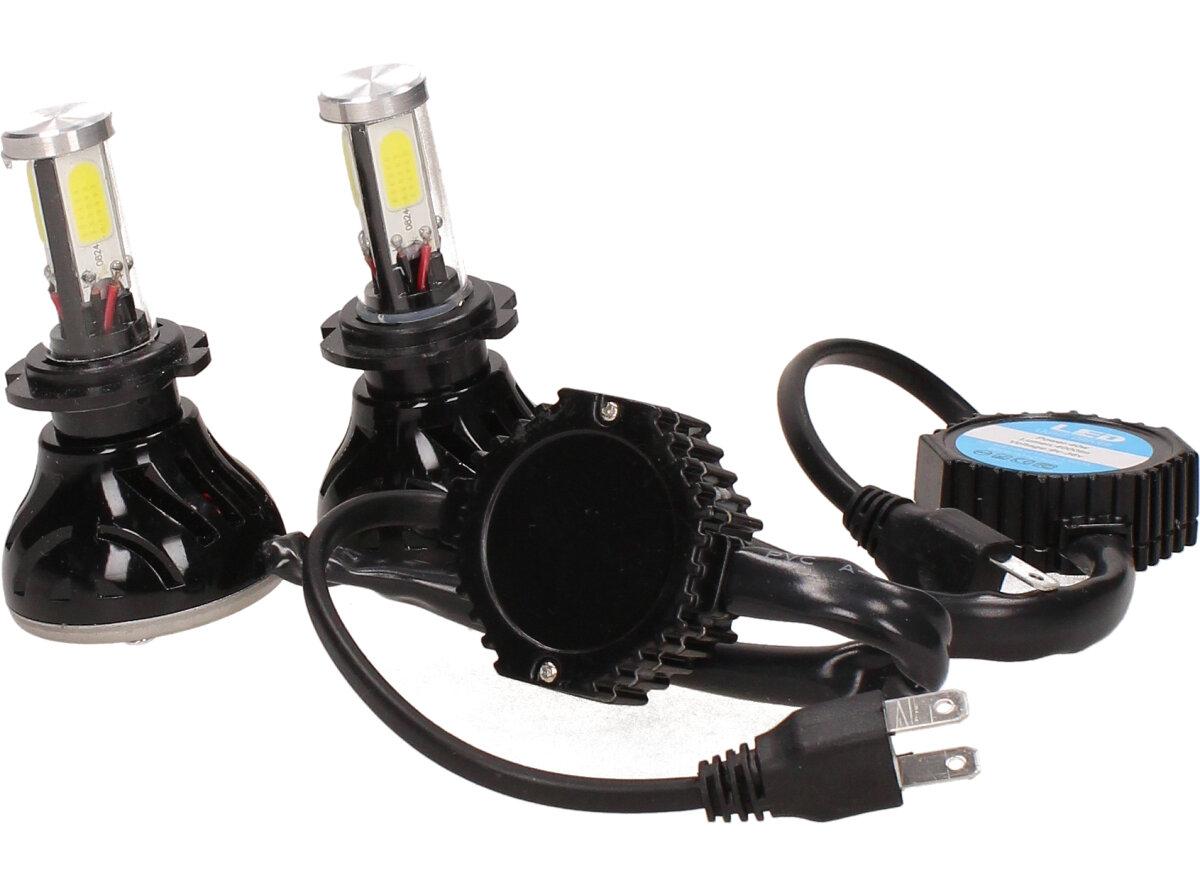 Velice výkonná a odolná LED H7 F5 žárovka s barvou světla 6000K (studená bílá) sada 2 kusy do světlometu do auta na 12V, 24V jako náhrada za klasickou nevýkonou žárovku H7. Tato žárovka je opravdu výkonná, protože místo dvou chipů má dvojnásobný počet a to 4 a svítí tak 360° kolem dokola.