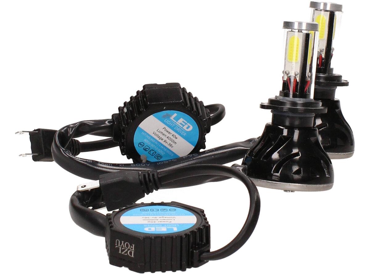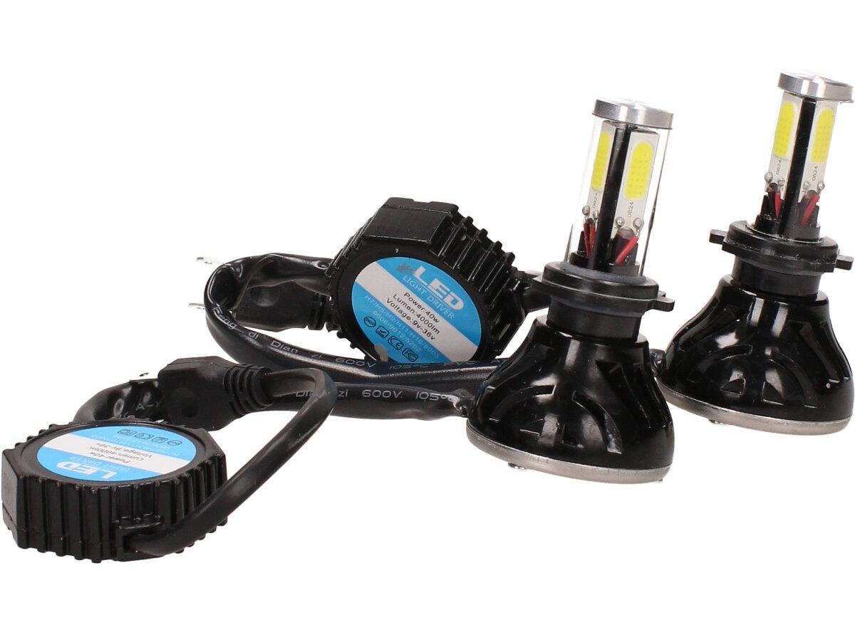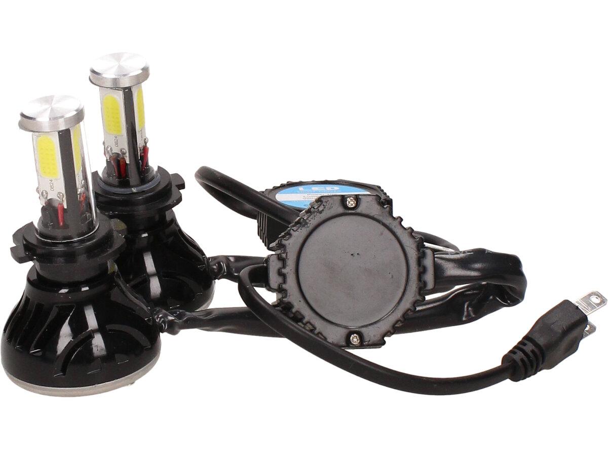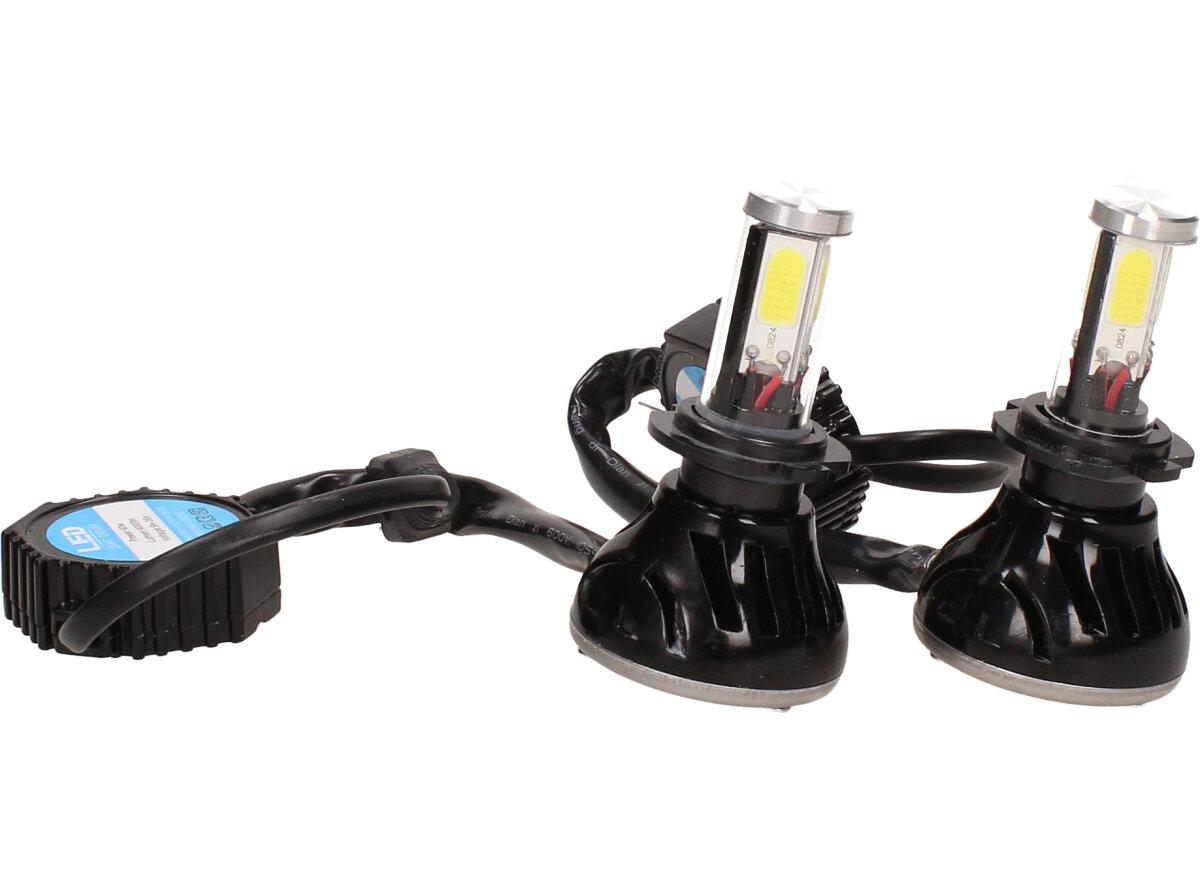 Velice výkonná a odolná LED H7 F5 žárovka s barvou světla 6000K (studená bílá) sada 2 kusy do světlometu do auta na 12V, 24V jako náhrada za klasickou nevýkonou žárovku H7. Tato žárovka je opravdu výkonná, protože místo dvou chipů má dvojnásobný počet a to 4 a svítí tak 360° kolem dokola.