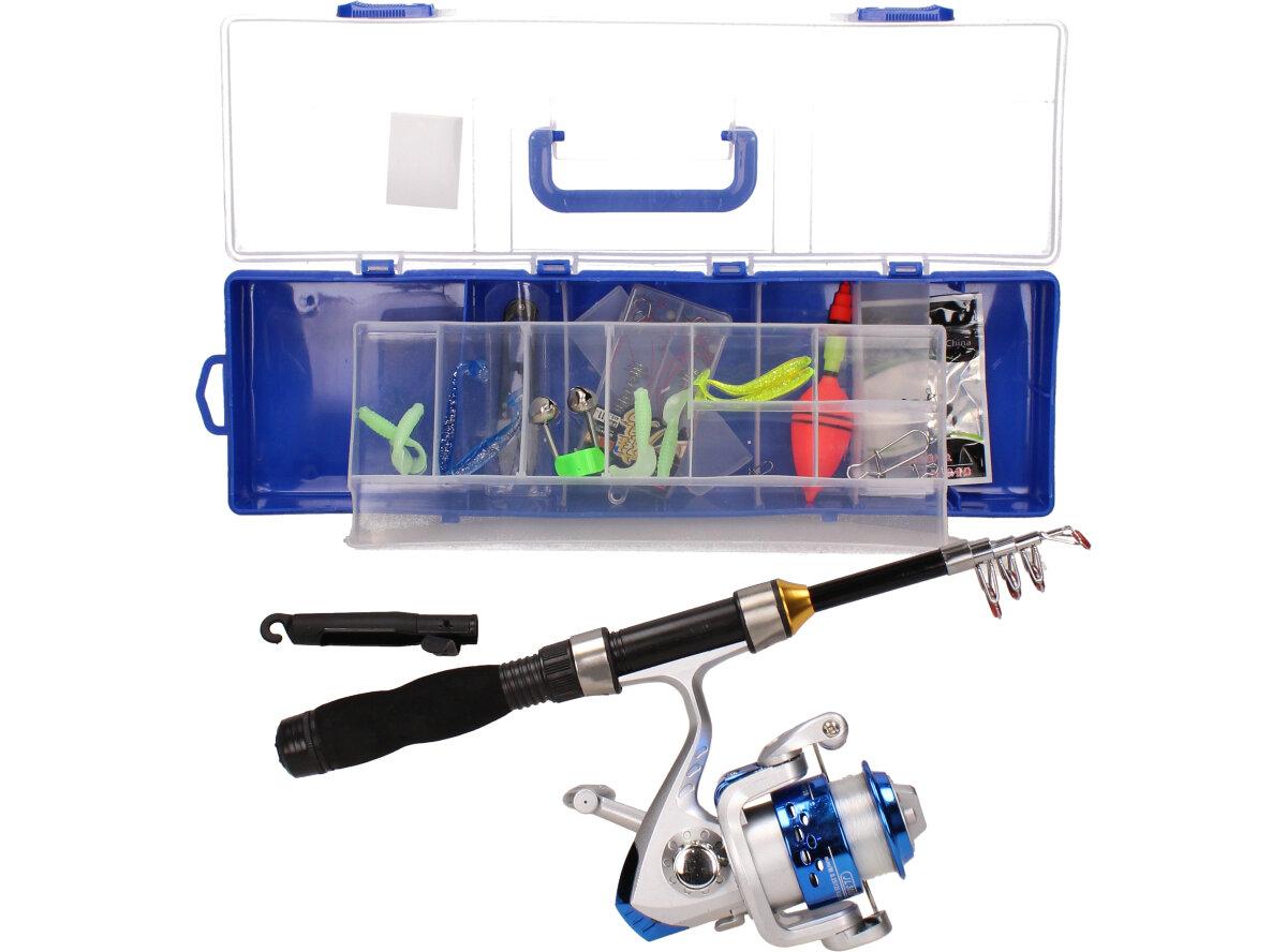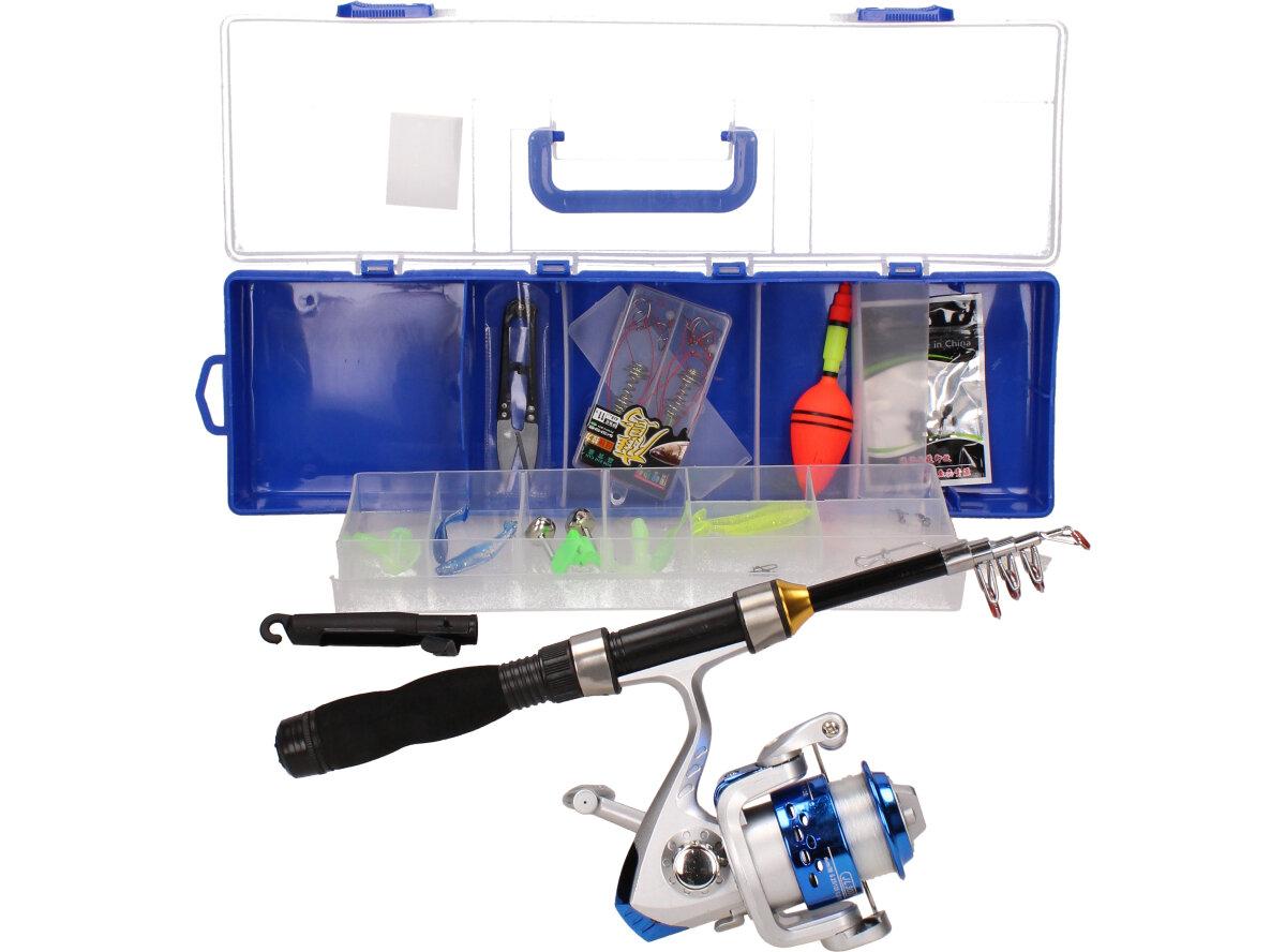 Rybářská sada 21v1 je velmi skladná, obsahuje plnohodnotný prut o délce 1m, naviják 3000 včetně vlasce a příslušenství. Součástí jsou krmítka, olůvka, kačena, karabinky, červy, prut, nůžky na vlasec