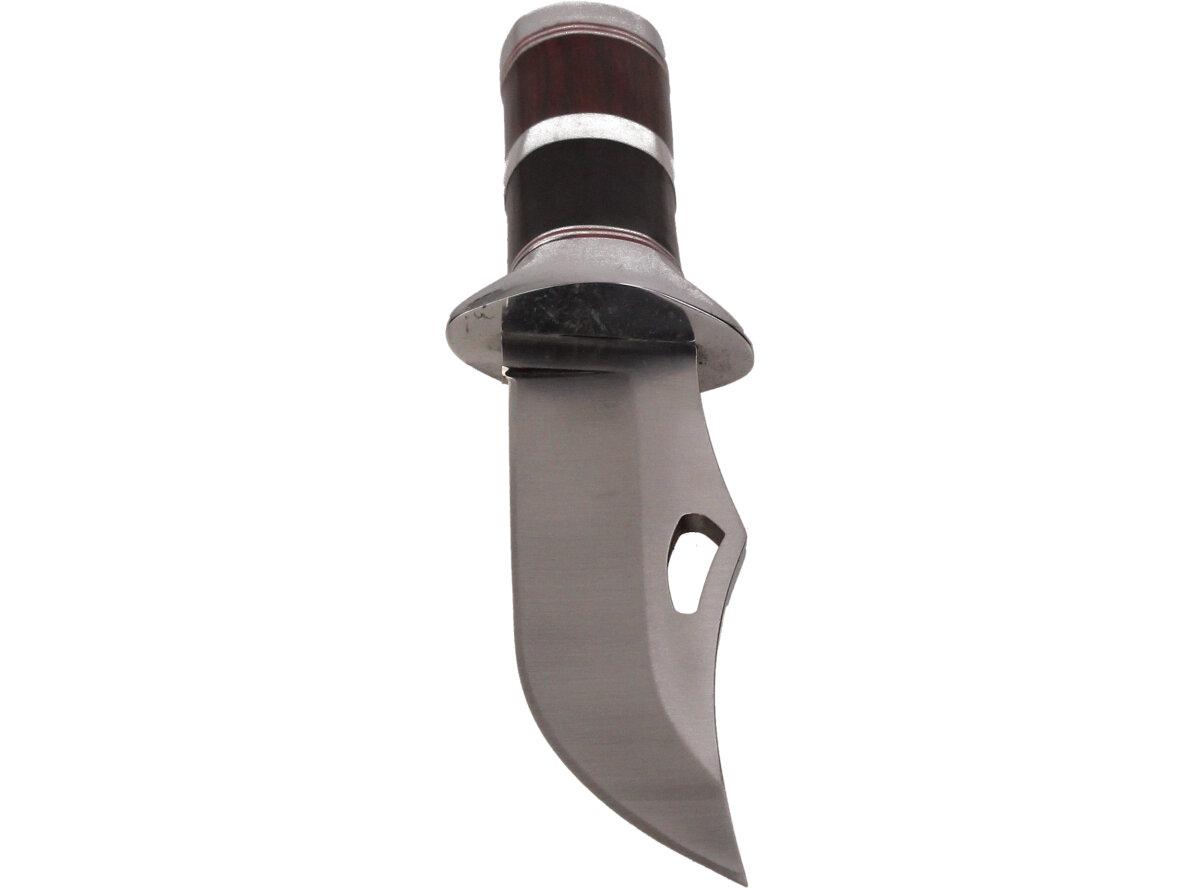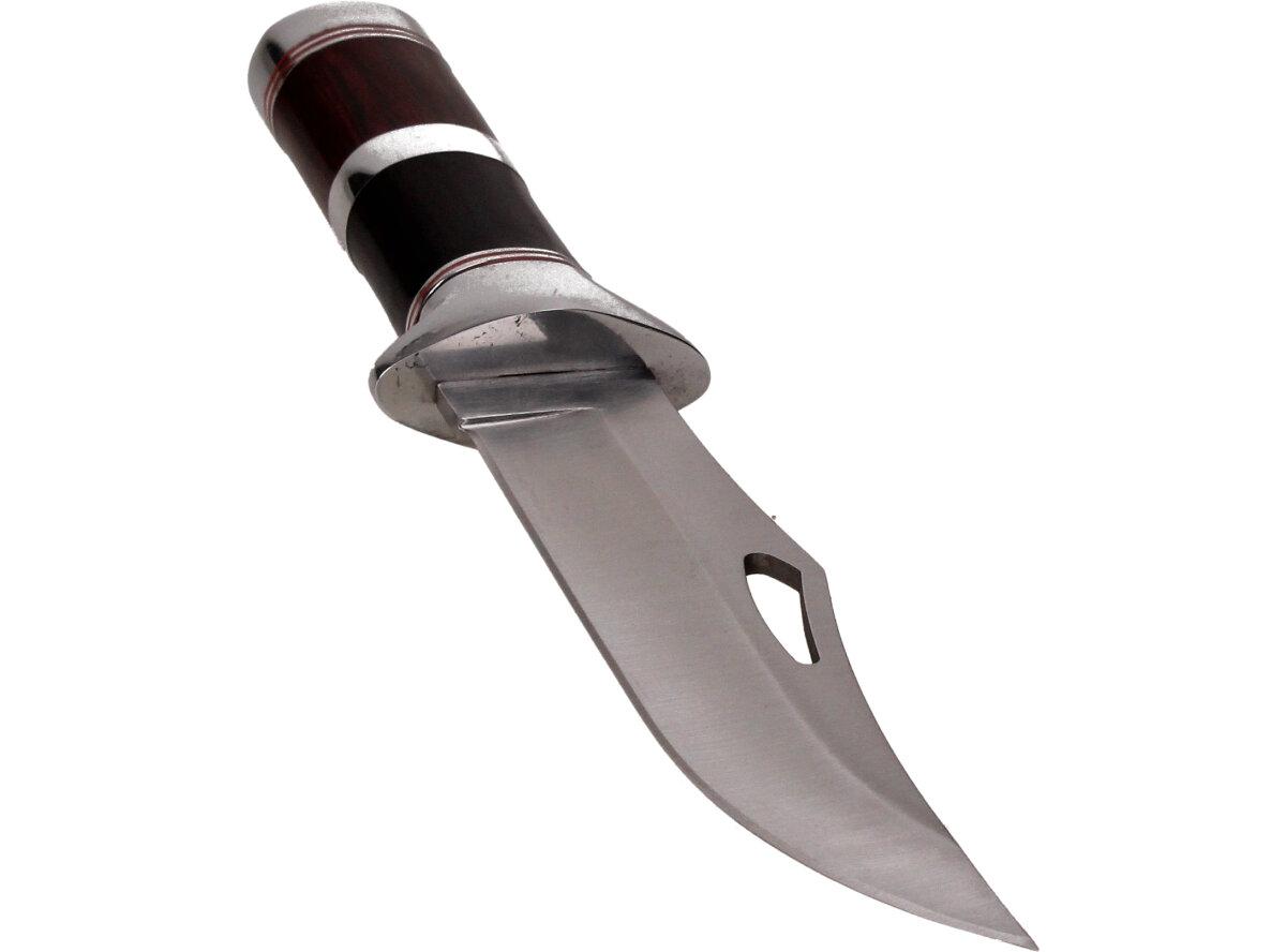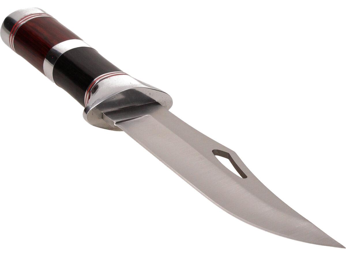 Hobby lovecký nůž s s dírou v čepeli o délce 28cm s pouzdrem na opasek je ideální pro všechny druhy zálib, jako je rybaření, grilování a houbaření. Velmi odolné ostří a čepel proti otupení a poškrábání. Dřevěný design, kovový s pouzdrem.