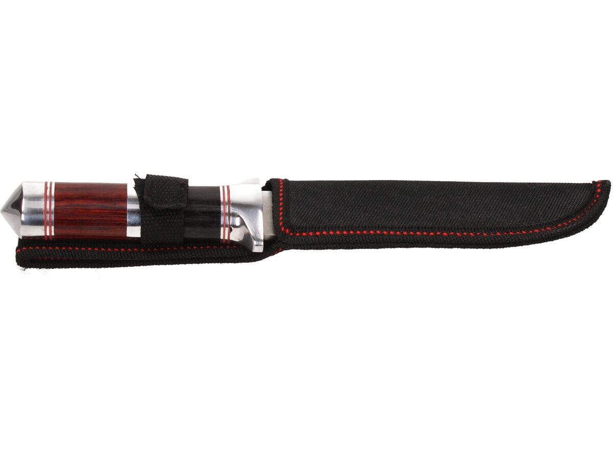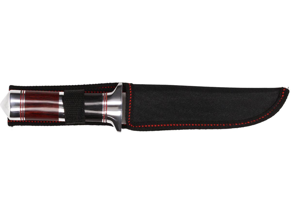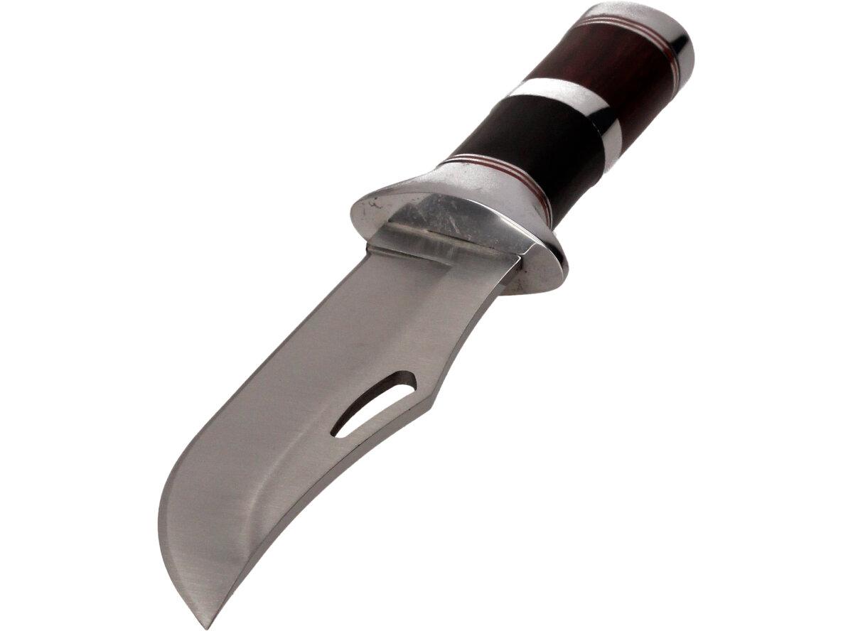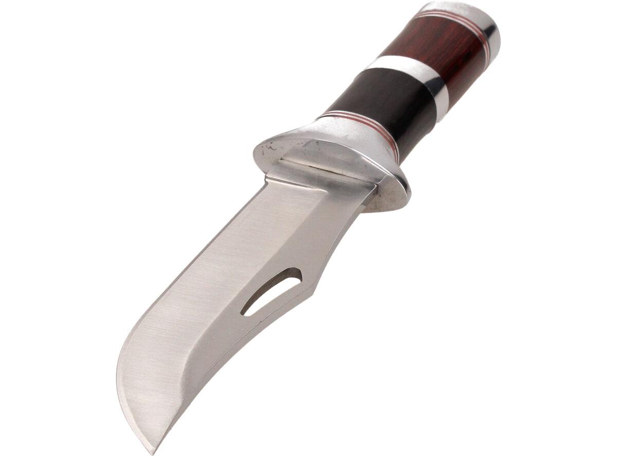 Hobby lovecký nůž s s dírou v čepeli o délce 28cm s pouzdrem na opasek je ideální pro všechny druhy zálib, jako je rybaření, grilování a houbaření. Velmi odolné ostří a čepel proti otupení a poškrábání. Dřevěný design, kovový s pouzdrem.