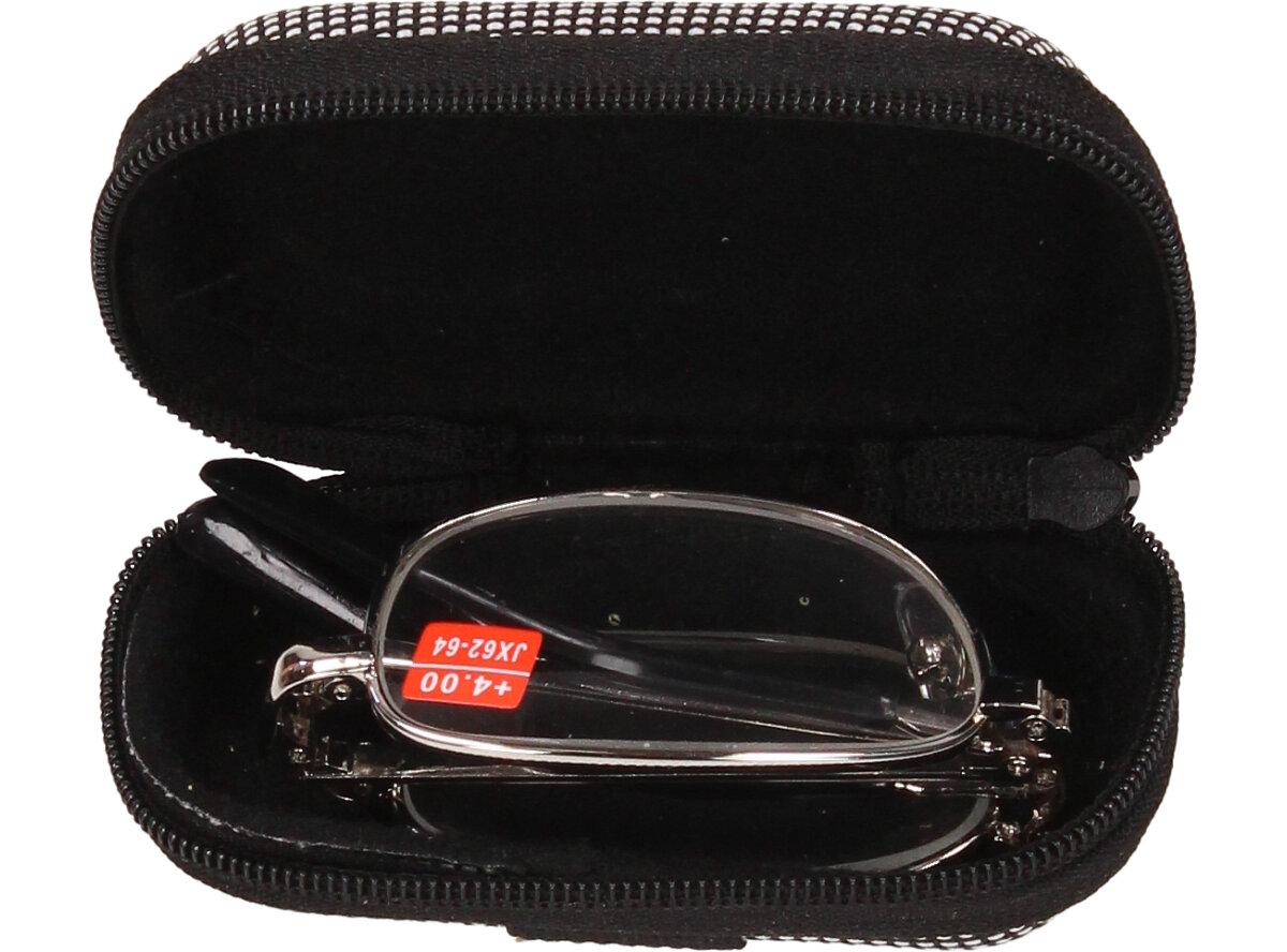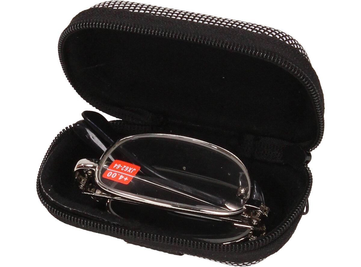 Skládací brýle v pouzdře +4.00 velmi praktické ve chvílích, kdy brýle potřebujete jen občas a nechce se Vám nosit rozměrné pouzdro. Kovové skládací dioptrické brýle snadno složíte do malého, pevného pouzdra, které je součástí dodávky. Brýle jsou a velmi precizně zpracovány, tudíž jsou méně náchylné na vylomení či zlomení. Brýle mají +1.50 dioptrií, lehká skleněná skla a jednoduchý design, který bude slušet všem ženám i mužům. Pouzdro je ze spodní strany opatřeno gumou, díky které si brýle můžete chtit za pásek nebo připevnit na klíče. Tyto brýle jsou vhodné např.: do garáží, dílen, zahrad, na nákup, prostě tam, kde si nechcete ničit svoje drahé brýle od optika.