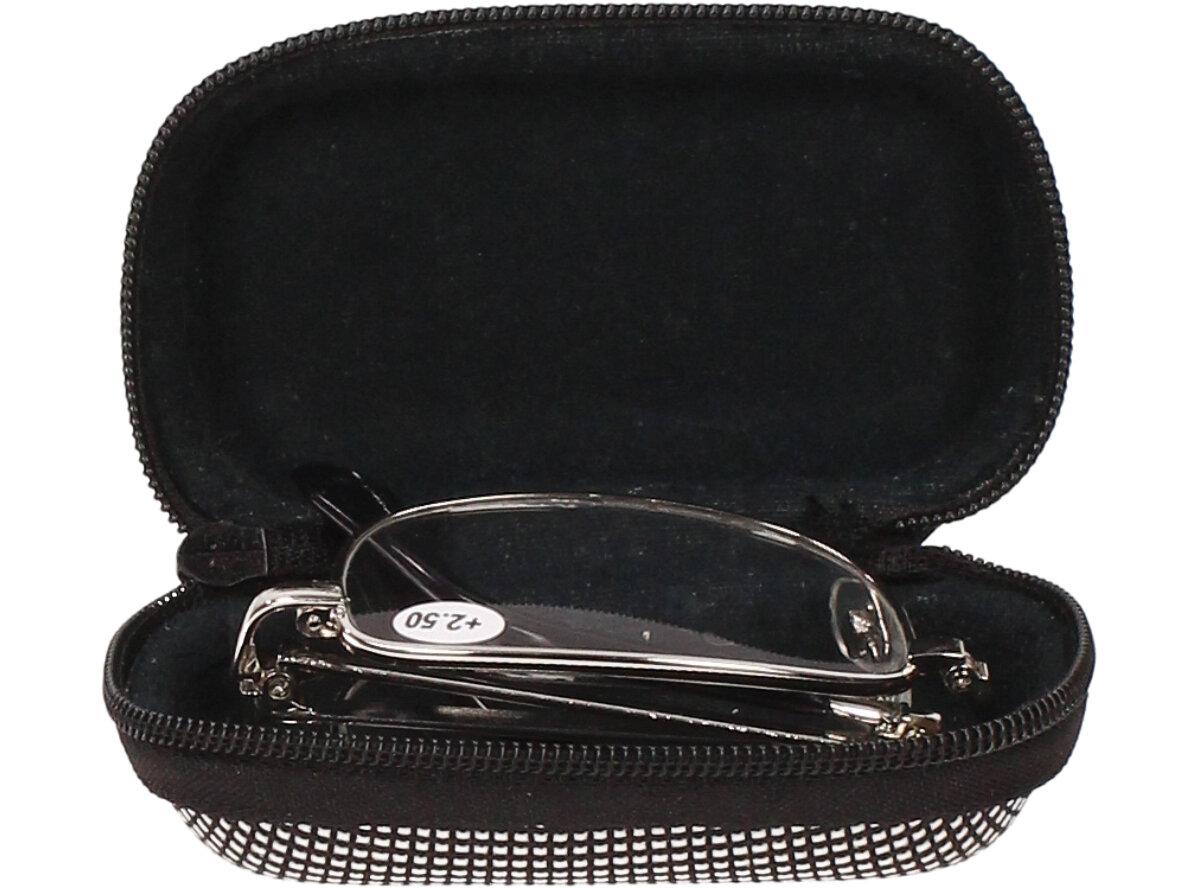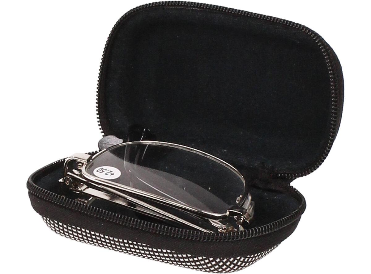 Skládací brýle v pouzdře +2.50 velmi praktické ve chvílích, kdy brýle potřebujete jen občas a nechce se Vám nosit rozměrné pouzdro. Kovové skládací dioptrické brýle snadno složíte do malého, pevného pouzdra, které je součástí dodávky. Brýle jsou a velmi precizně zpracovány, tudíž jsou méně náchylné na vylomení či zlomení. Brýle mají +1.50 dioptrií, lehká skleněná skla a jednoduchý design, který bude slušet všem ženám i mužům. Pouzdro je ze spodní strany opatřeno gumou, díky které si brýle můžete chtit za pásek nebo připevnit na klíče. Tyto brýle jsou vhodné např.: do garáží, dílen, zahrad, na nákup, prostě tam, kde si nechcete ničit svoje drahé brýle od optika.