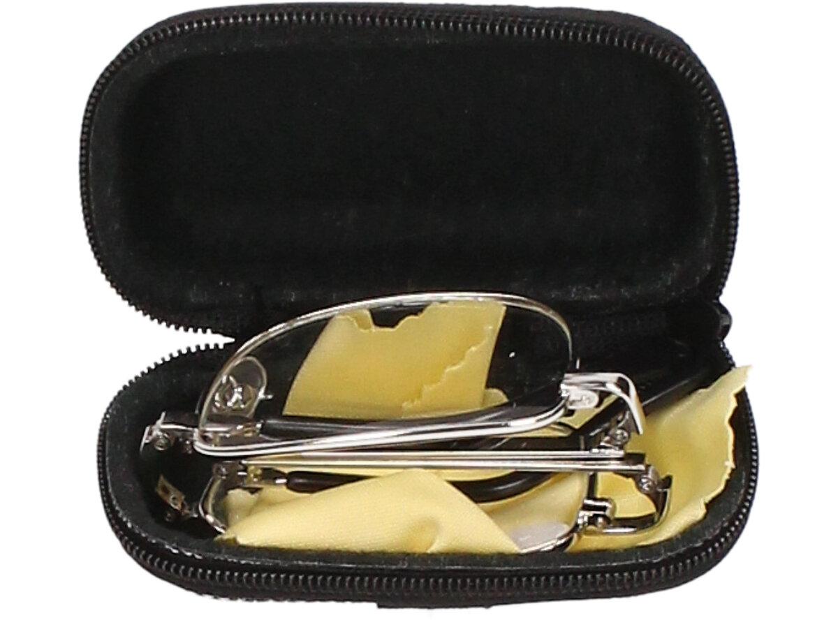 Skládací brýle v pouzdře +2.00 velmi praktické ve chvílích, kdy brýle potřebujete jen občas a nechce se Vám nosit rozměrné pouzdro. Kovové skládací dioptrické brýle snadno složíte do malého, pevného pouzdra, které je součástí dodávky. Brýle jsou a velmi precizně zpracovány, tudíž jsou méně náchylné na vylomení či zlomení. Brýle mají +1.00 dioptrií, lehká skleněná skla a jednoduchý design, který bude slušet všem ženám i mužům. Pouzdro je ze spodní strany opatřeno gumou, díky které si brýle můžete chtit za pásek nebo připevnit na klíče. Tyto brýle jsou vhodné např.: do garáží, dílen, zahrad, na nákup, prostě tam, kde si nechcete ničit svoje drahé brýle od optika.