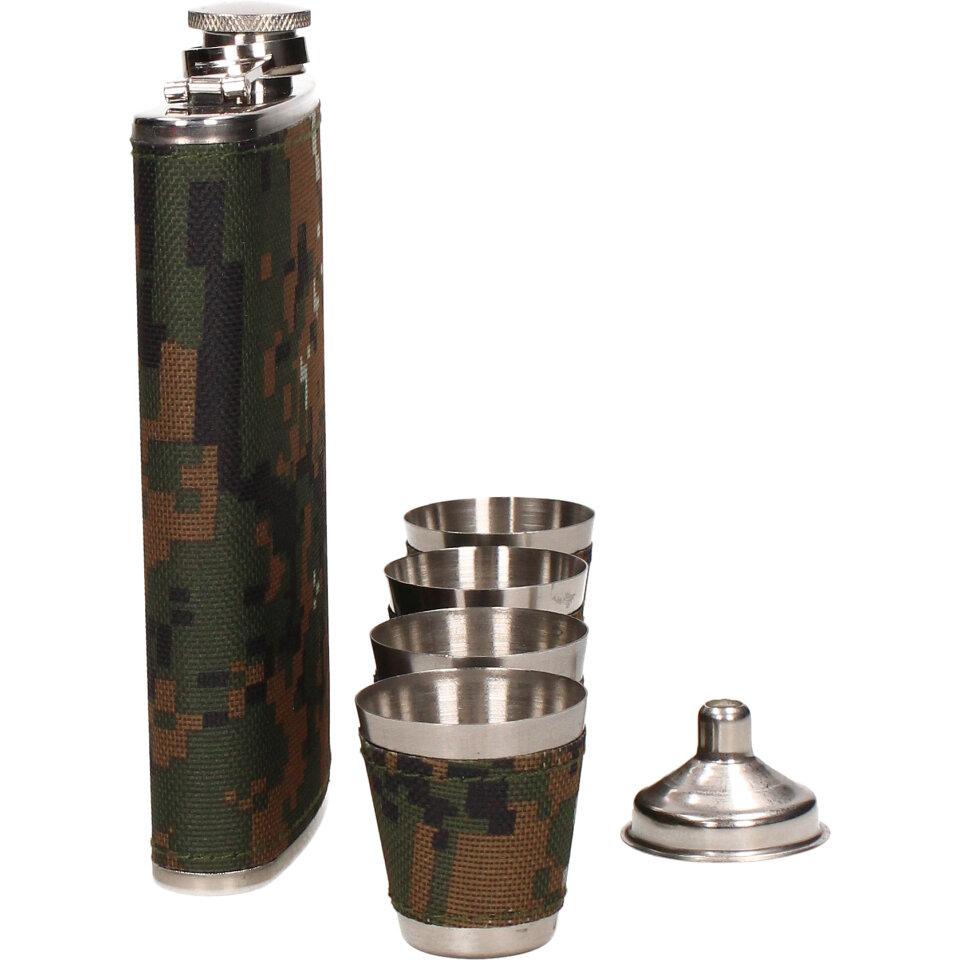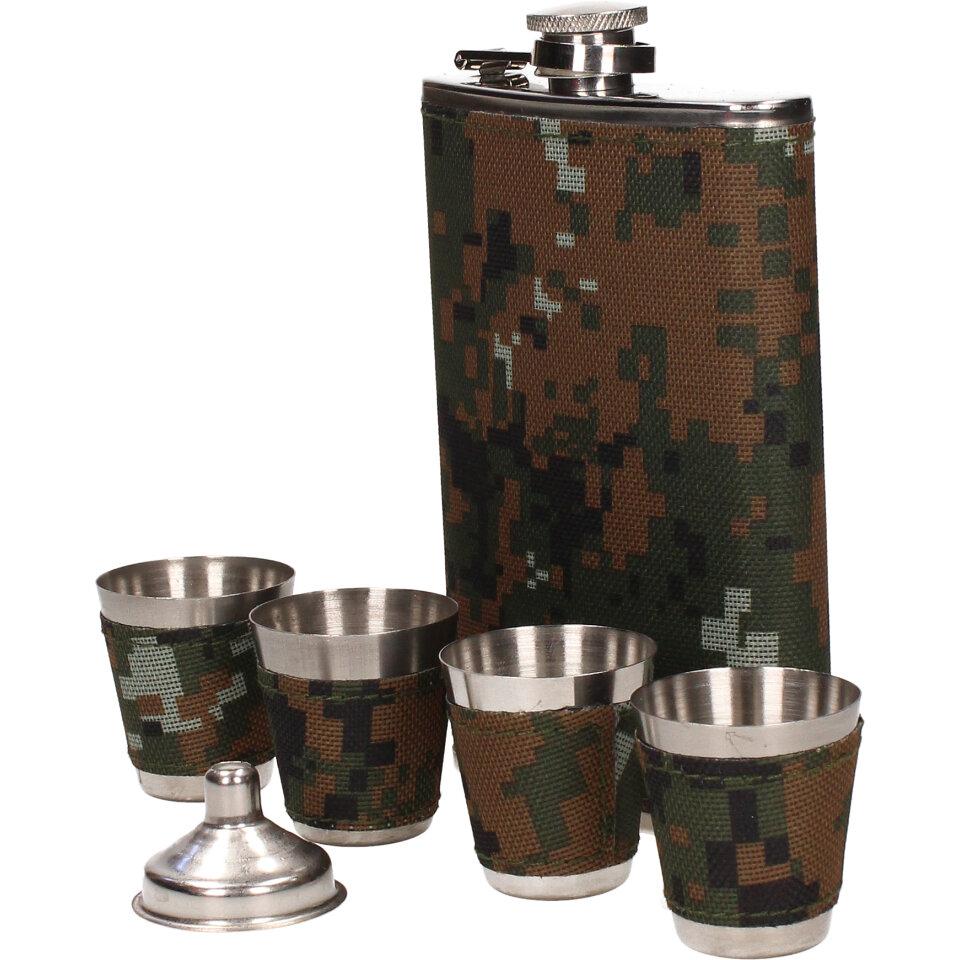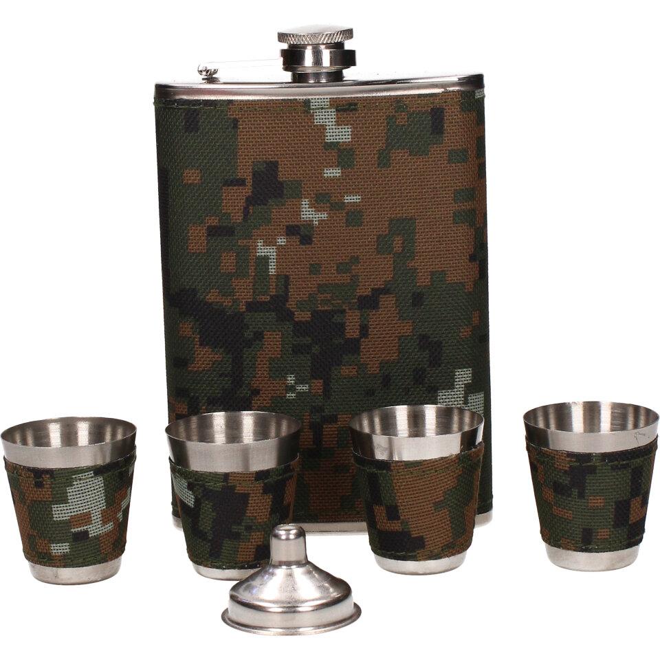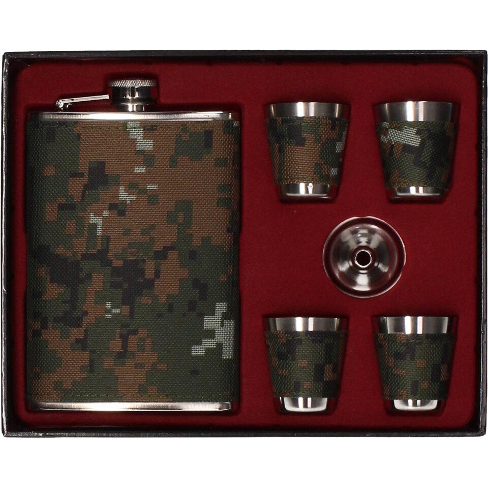 Dárková sada placatka khaki, čtyřmi panáky a nákevkou je vyrobena z nerezového materiálu a je vhodná jako vkusný dárek.
