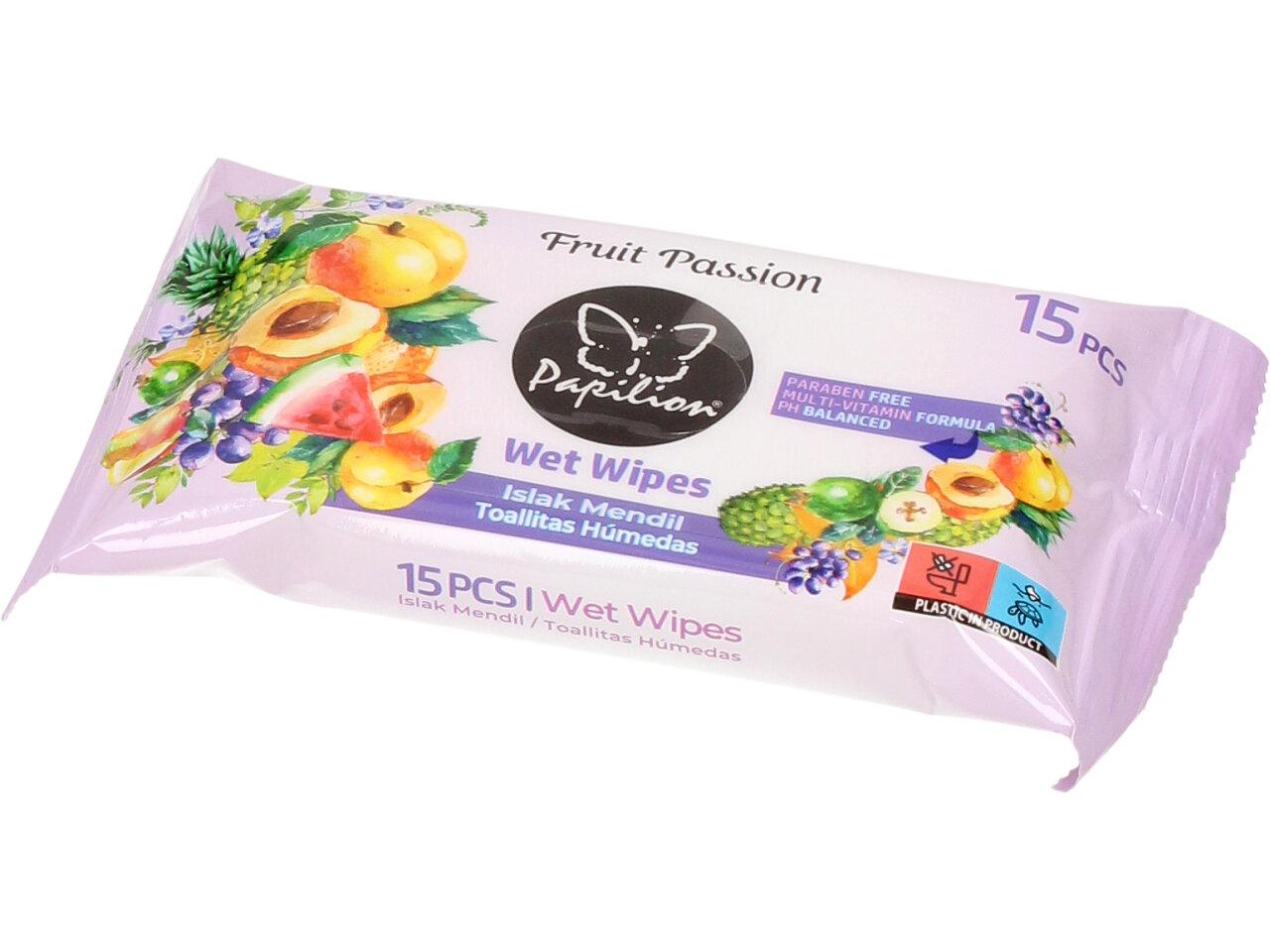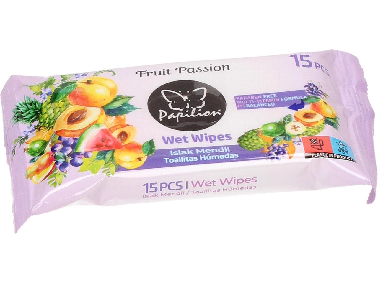 Papilion vlhčené ubrousky 15ks Multi-vitamín, pružné vlhké ubrousky, které neobsahují alkohol, jsou hygienické, čistí, hydratují a vyživují pokožku. Papilion vlhčené ubrousky jsou extra pevné, sametové, měkké s příjemnou vůní květin. Díky malým rozměrům balení, můžete mít ubrousky vždy po ruce. Vhodné k použití na tvář i celé tělo.