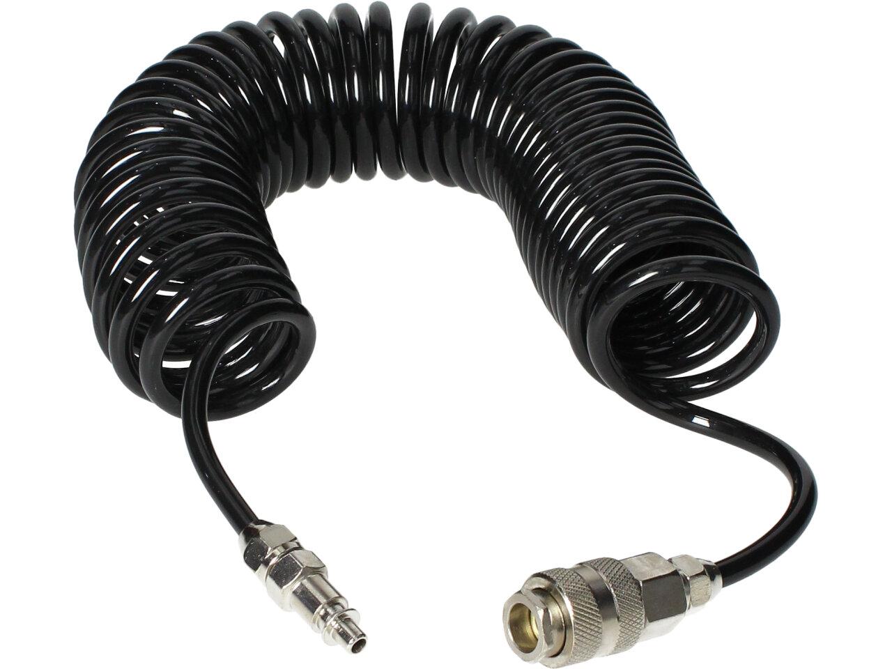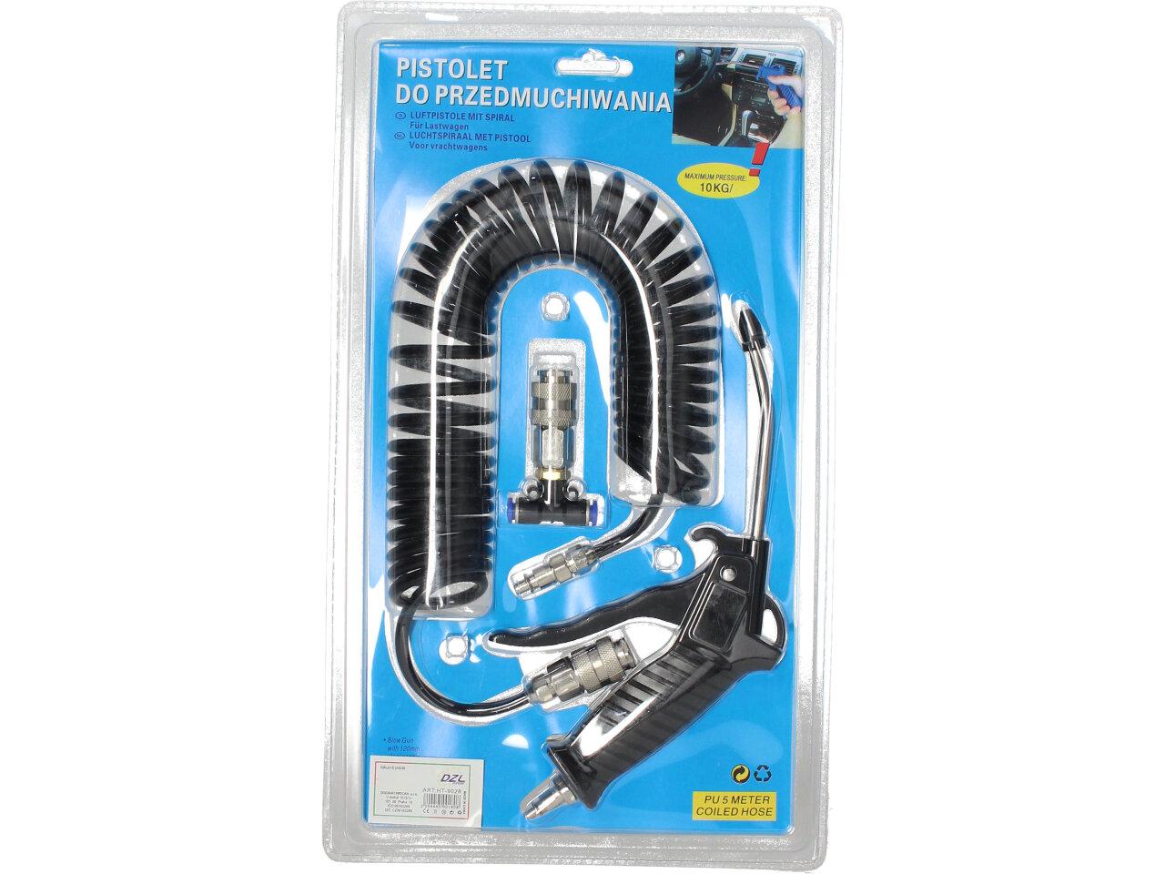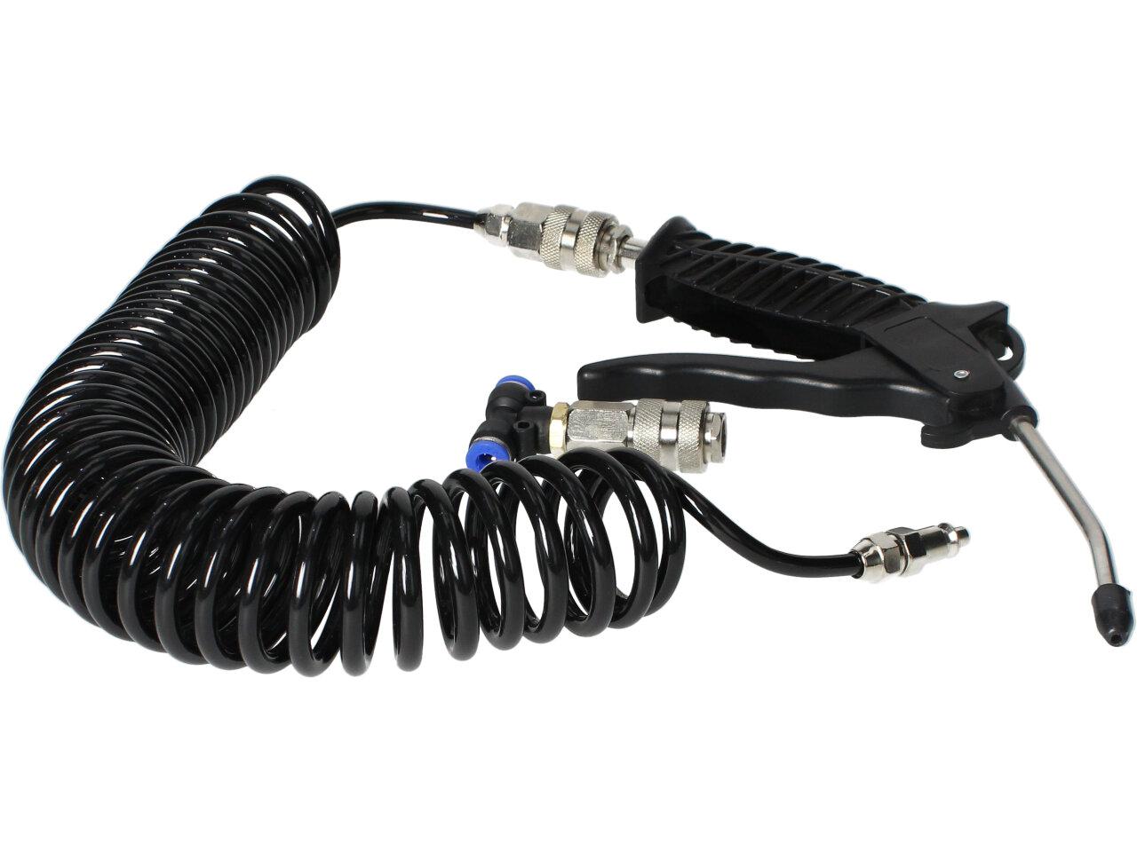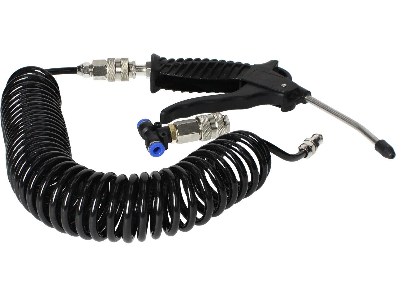 Ofukovací pistole s flexibilní spirální hadicí součástí je i T rozbočovač, v černé barvě. Délka hadice 5 metrů s maximálním tlakem 10 Barů.