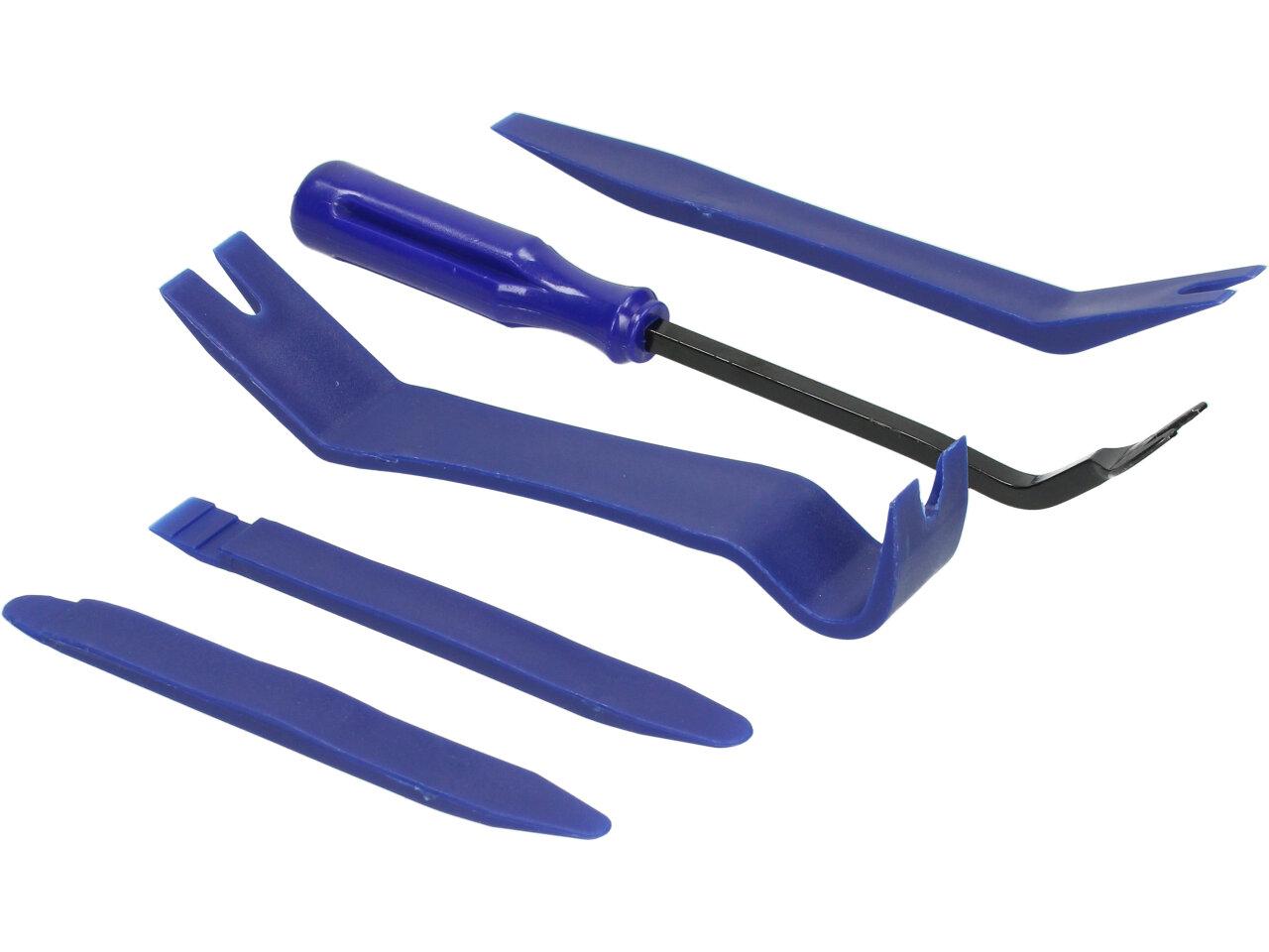 Nástroje v sadě zahrnují plastové páčidlo, univerzální háček, široký plastový nástroj, úzký plastový nástroj a drátěný háček. Plastové nástroje jsou navrženy tak, aby se snadno vkládaly a vyjímaly různé díly interiéru vozidla, jako jsou dveře, palubní deska, strop a další.