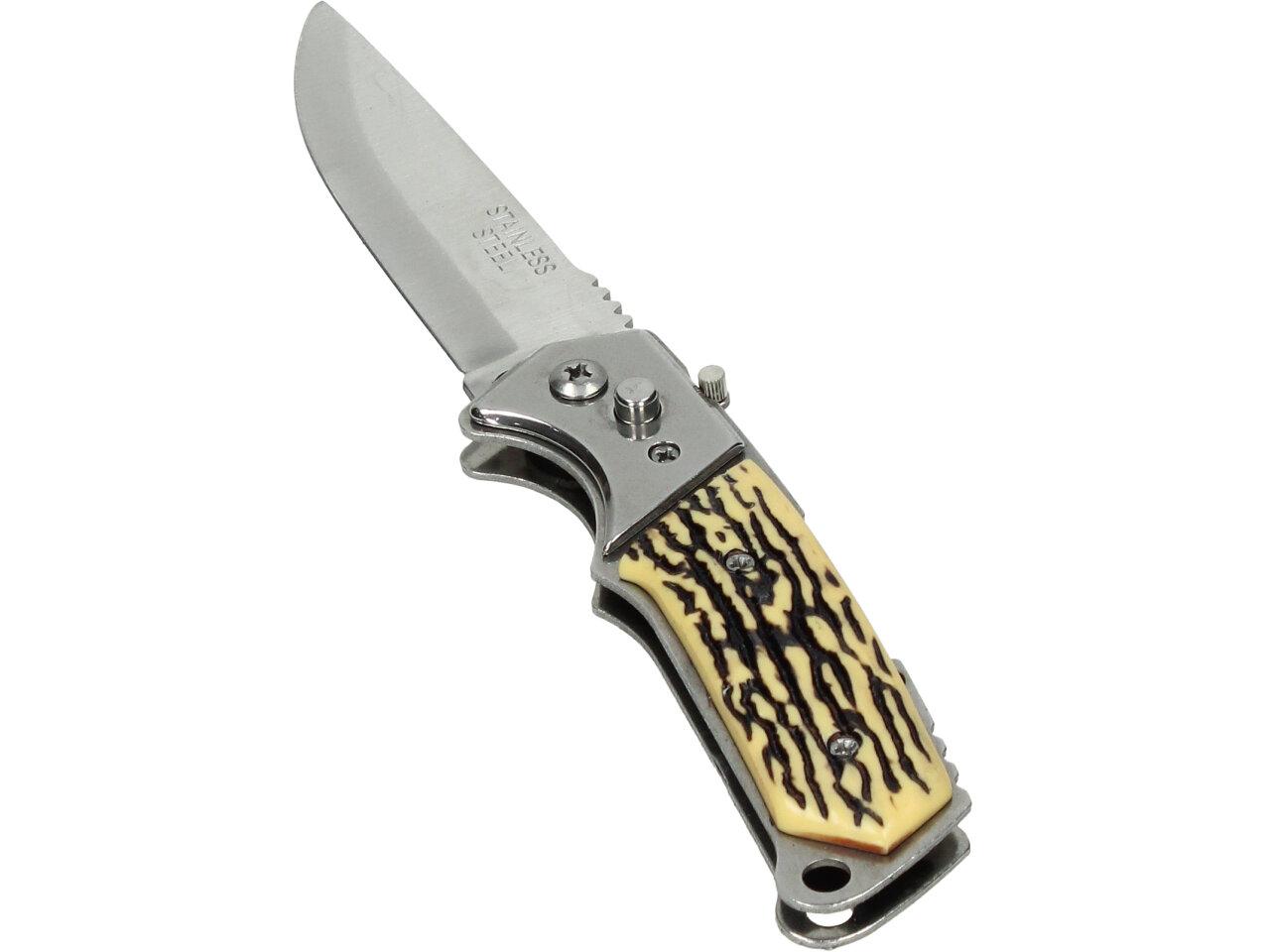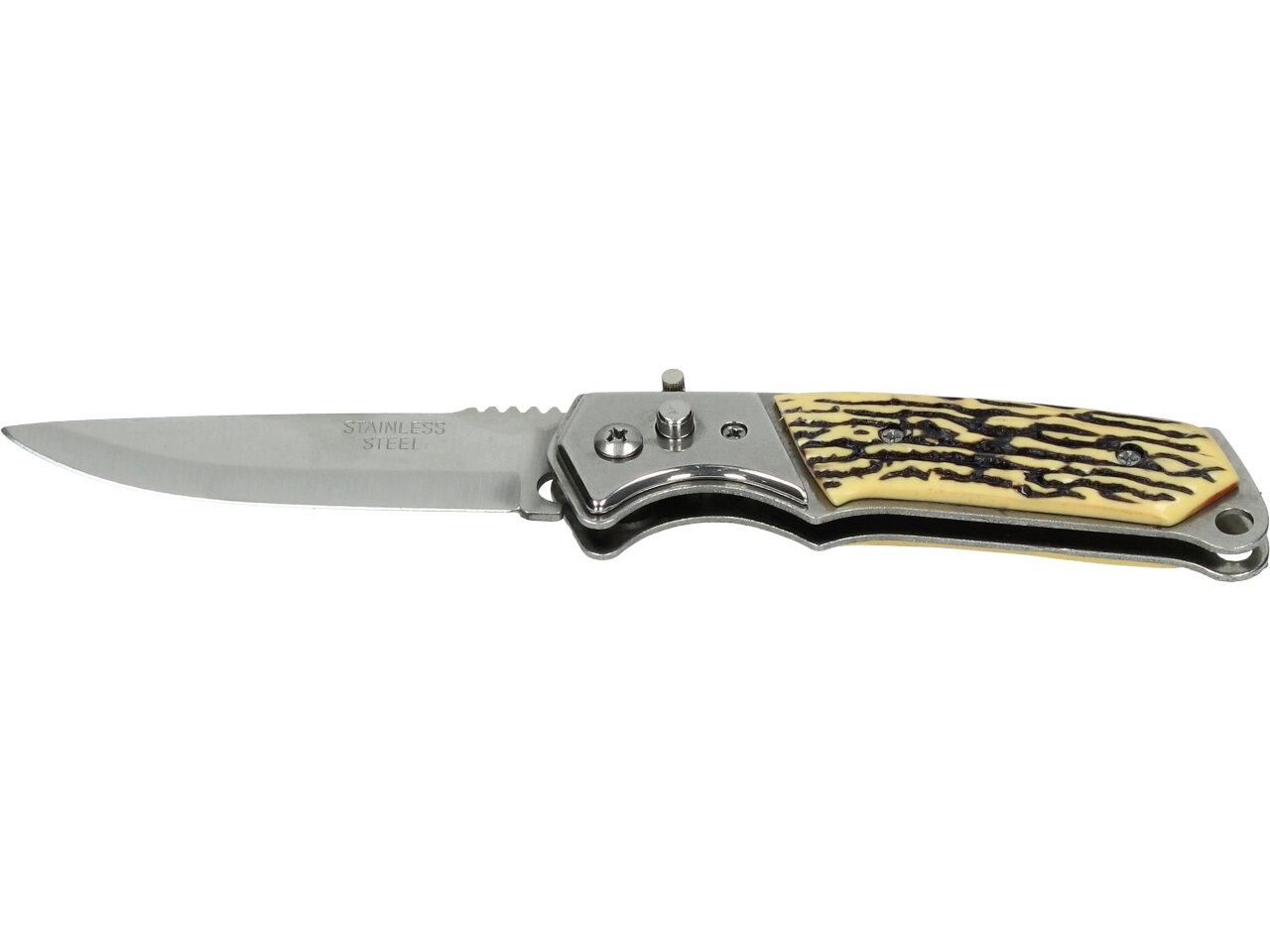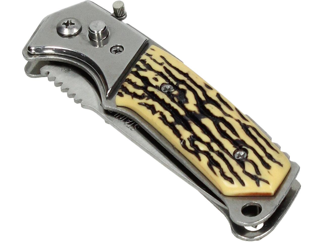Špičkový vystřelovací nůž s hnědou střenkou a černými pruhy o délce 20 cm v rozloženém stavu, pojistkou a poutkem na přichycení. Tento kapesní skládací vystřelovací nůž disponuje s silnou vystřelovací pružinou a spouštěcím mechanismem (tlačítko), umístěným na jedné straně nože.