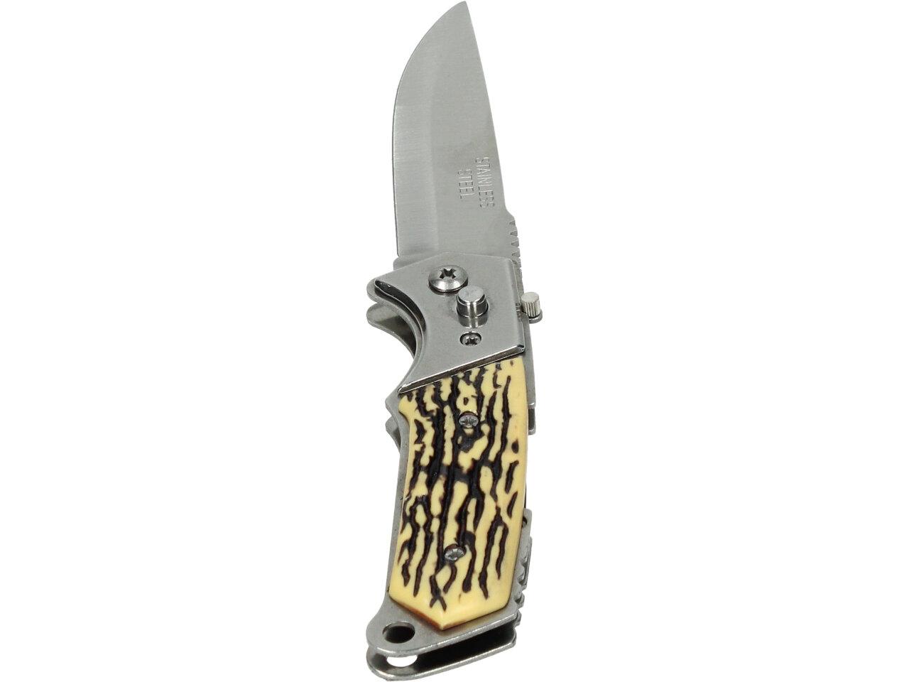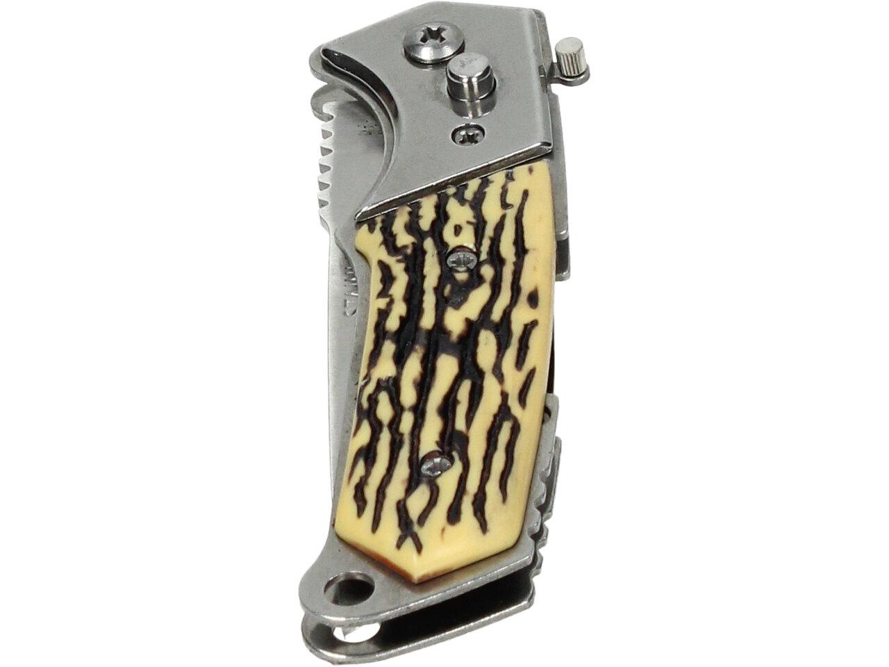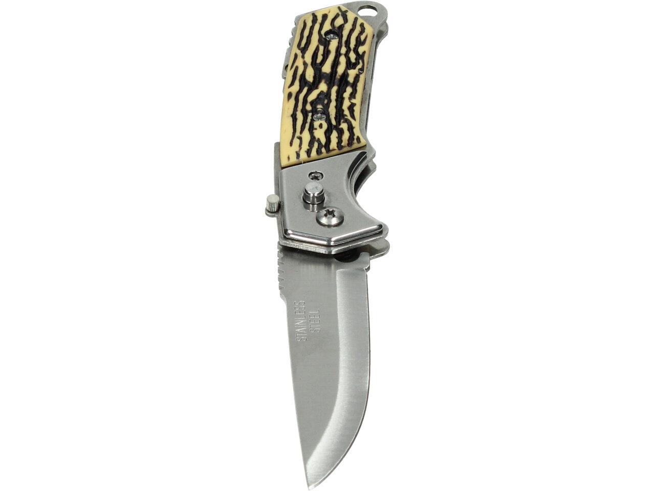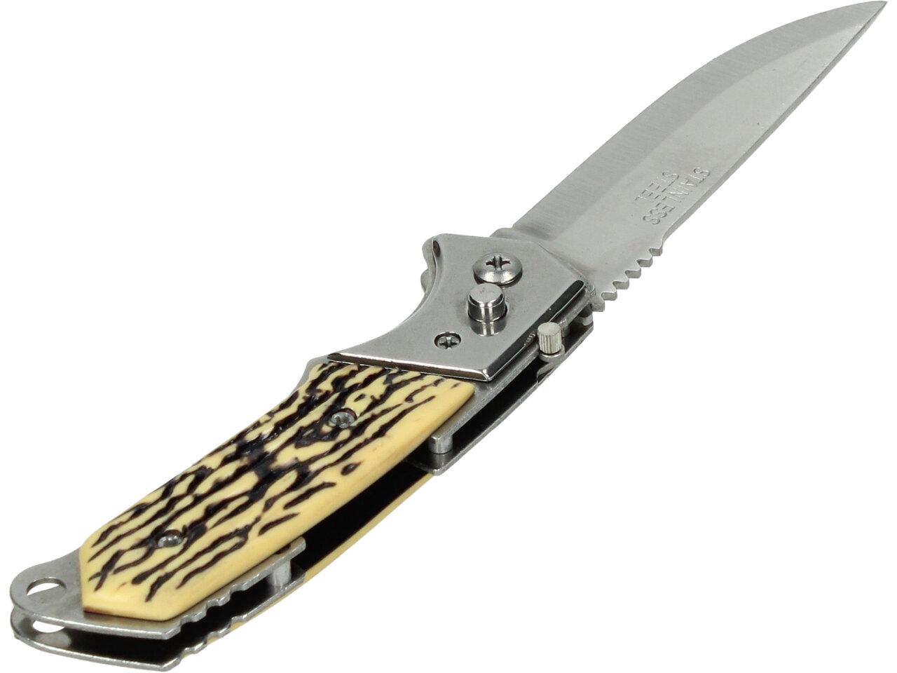 Špičkový vystřelovací nůž s hnědou střenkou a černými pruhy o délce 20 cm v rozloženém stavu, pojistkou a poutkem na přichycení. Tento kapesní skládací vystřelovací nůž disponuje s silnou vystřelovací pružinou a spouštěcím mechanismem (tlačítko), umístěným na jedné straně nože.