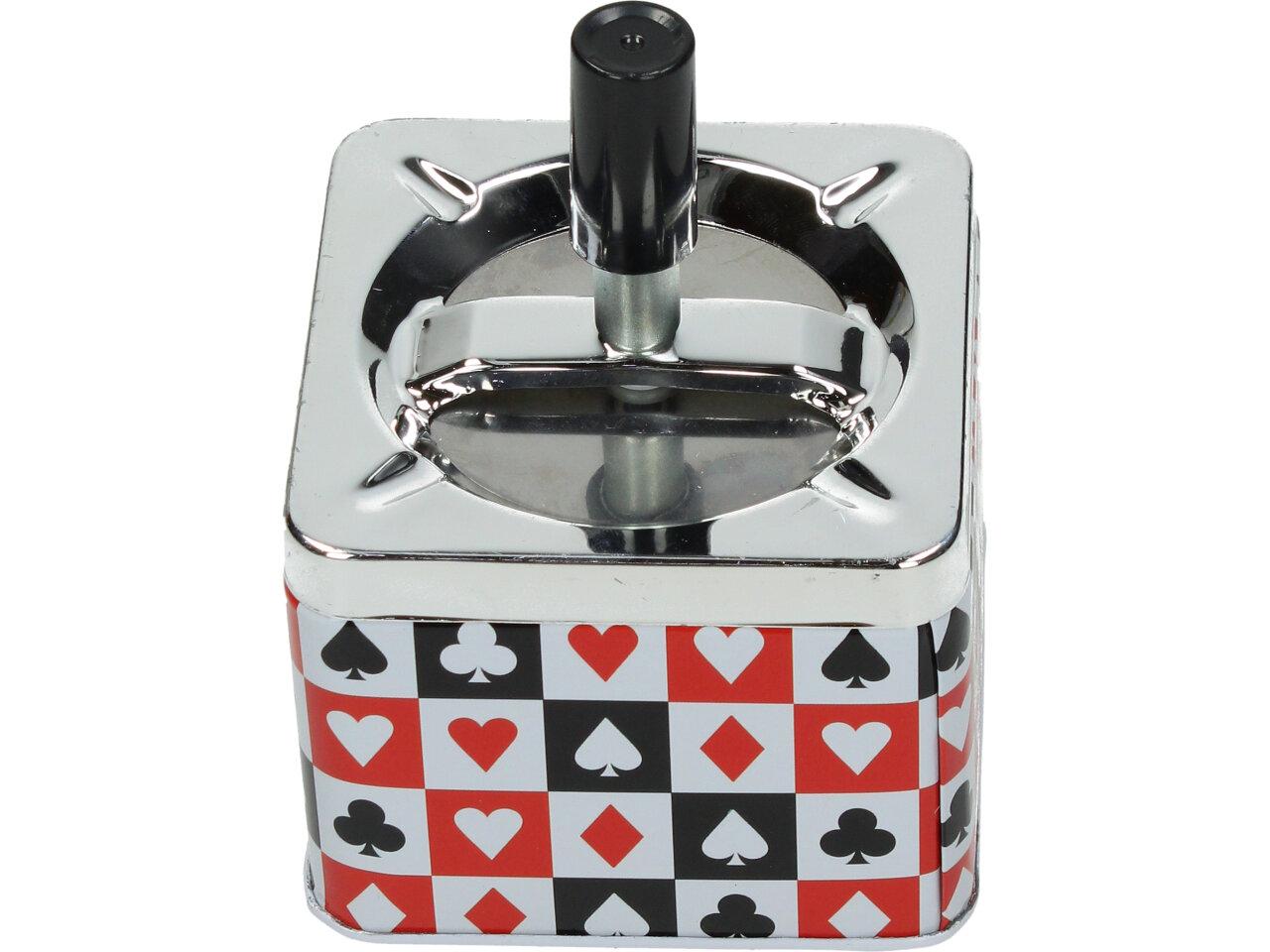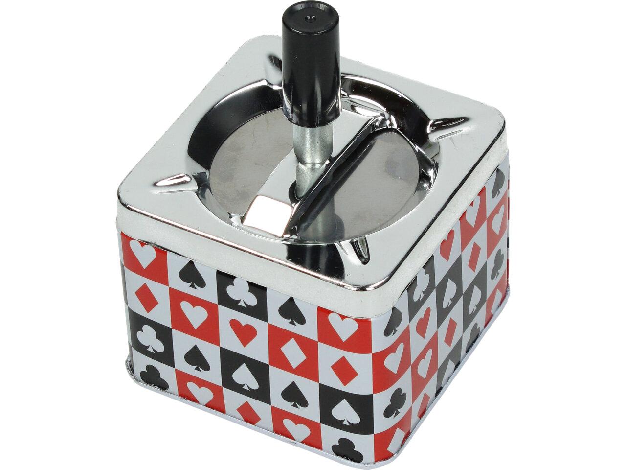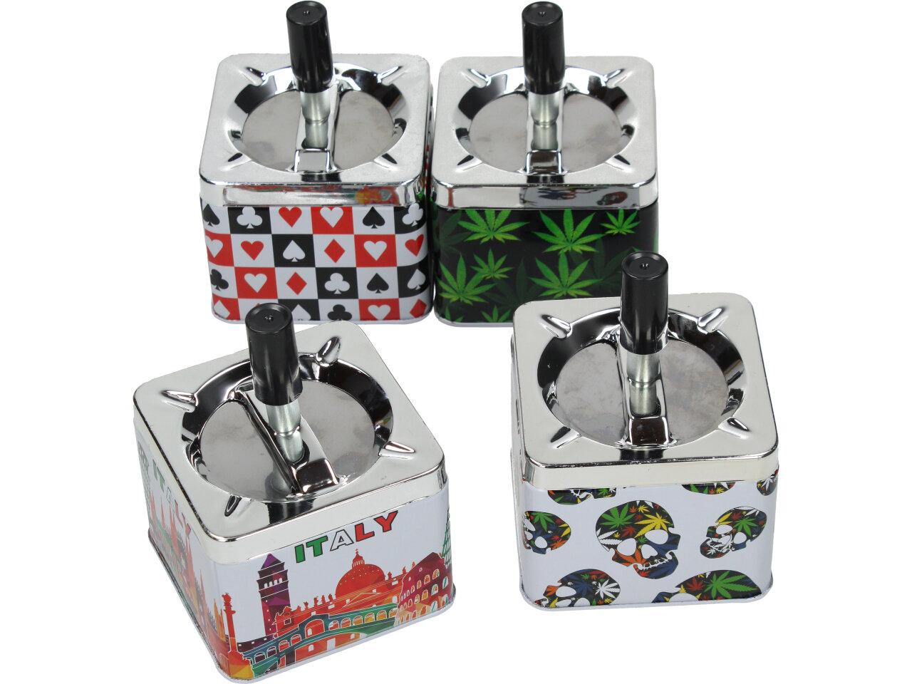 Krásný designový doplňek na stůl, pro kuřáky, nebo kuřácké návštěvy. Kovový popelník s veselým barevným motivem funguje na principu pístu. Po stlačení černé tyčky se popelník otevře a veškerý popel a nedopalky z cigaret se propadnou dovnitř do zásobníku. Po té co tyčku pustíte, popelník se sám zavře a utemní tak odpad z cigaret ve svých útrobách. Nic tak nikde nepadá, vítr nic nerozfouká a není nic cítit.
