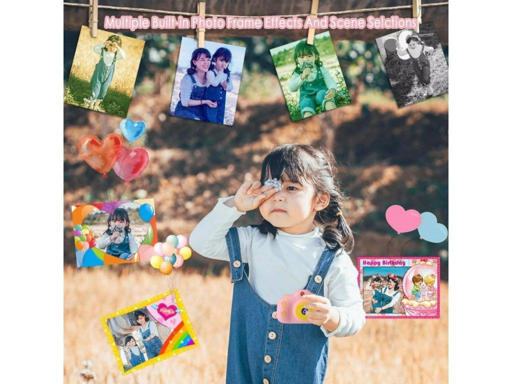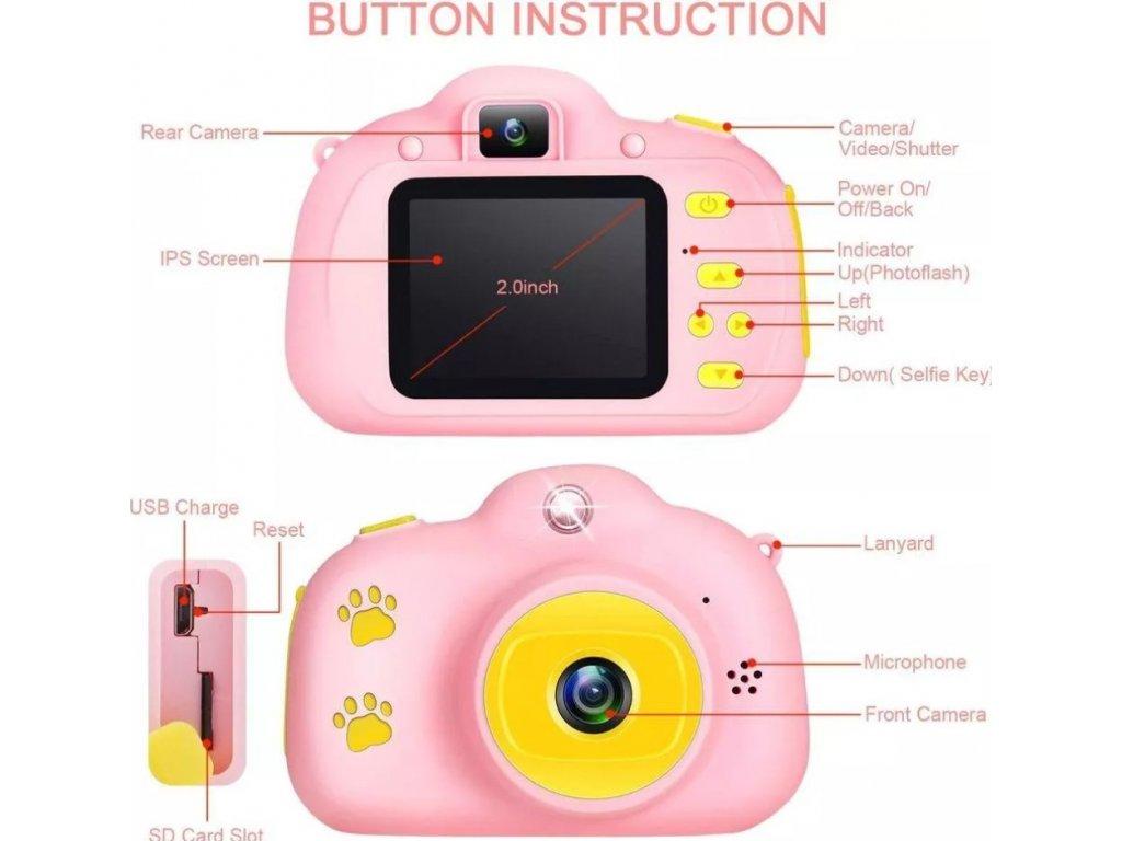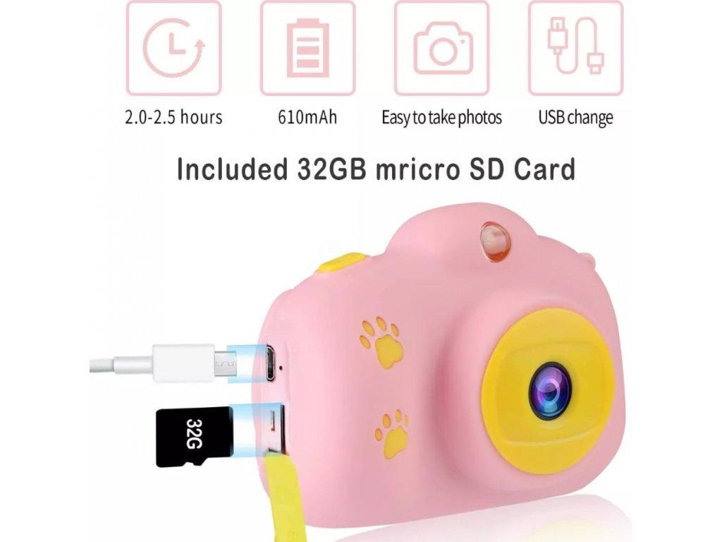 Pohodlná vyměnitelná paměťová karta SD, maximální podpora až 32GB SD karty (karta není součástí dodávky). Dětský digitální fotoaparát je hezký na pohled, má hezký design a dokáže upoutat pozornost dětí. Malý a lehký, snadno se přenáší. To je ten nejvhodnější dárek pro děti.