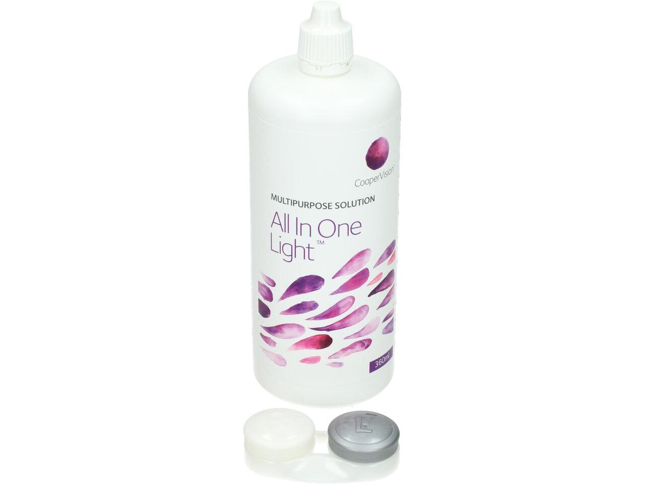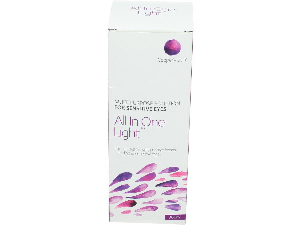 All In One Light je víceúčelový roztok od společnosti CooperVision určený ke komplexní péči o všechny druhy měkkých kontaktních čoček. Je doporučován zejména nositelům s citlivýma očima, jelikož nedráždí oči a nevyvolává alergické reakce. All In One Light čistí, dezinfikuje, lubrikuje, oplachuje, odstraňuje bílkoviny a slouží k bezpečnému uchovávání čoček. Speciální složení roztoku zaručí čočkám celodenní vlhkost a lubrikaci a tím je uživatelům kontaktních čoček zajištěn vysoký komfort nošení.