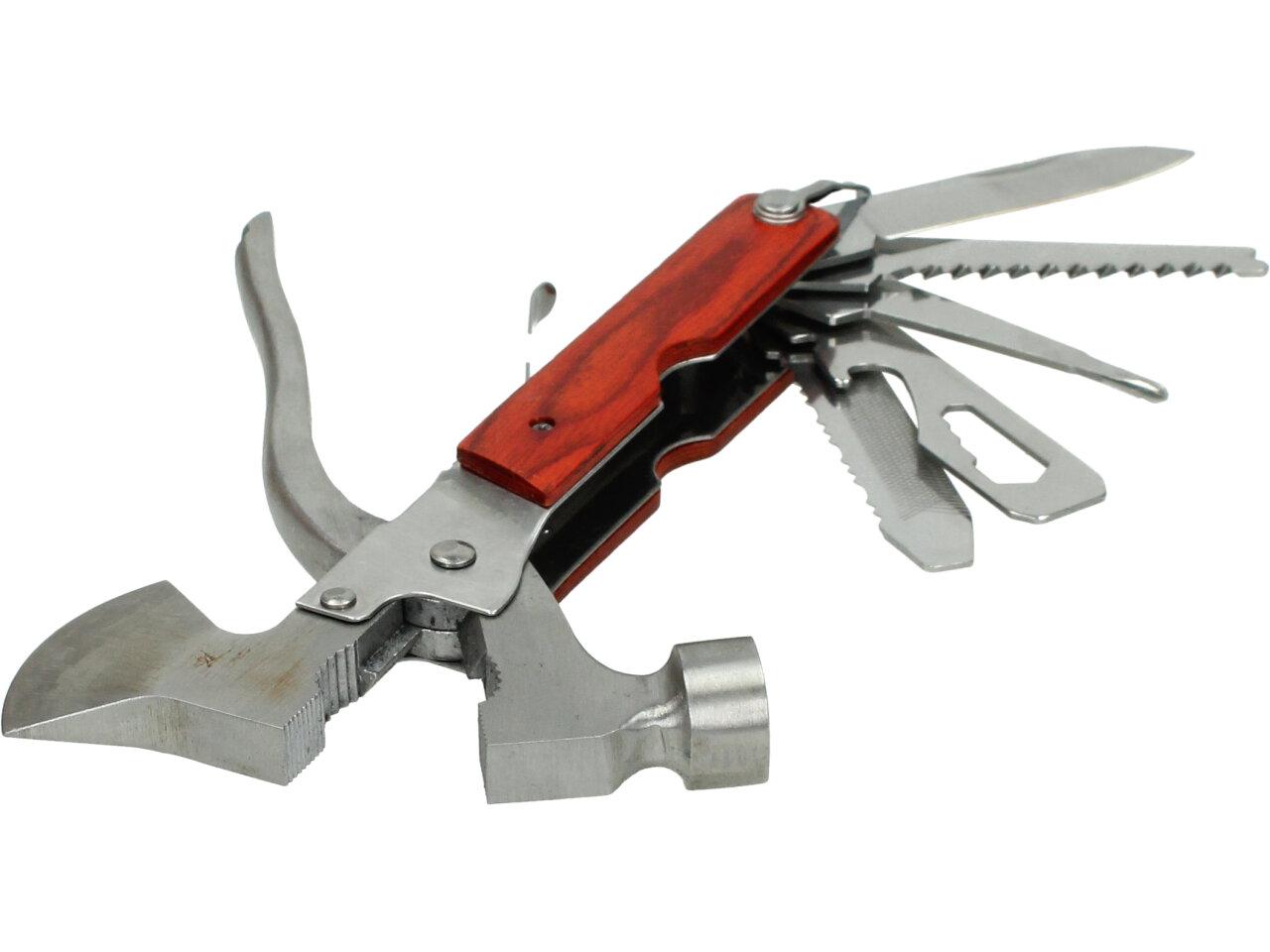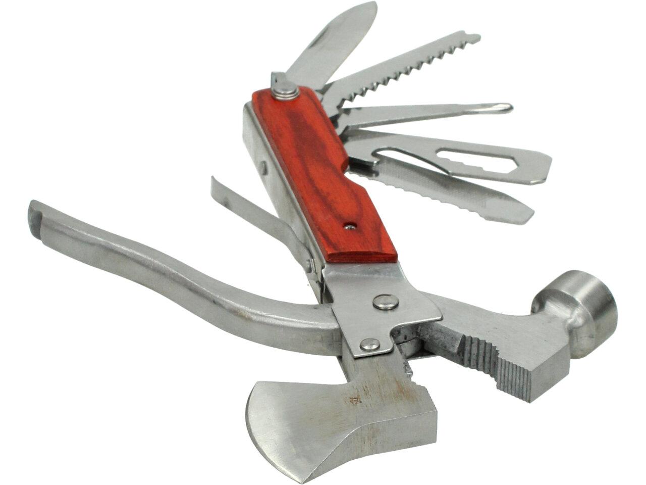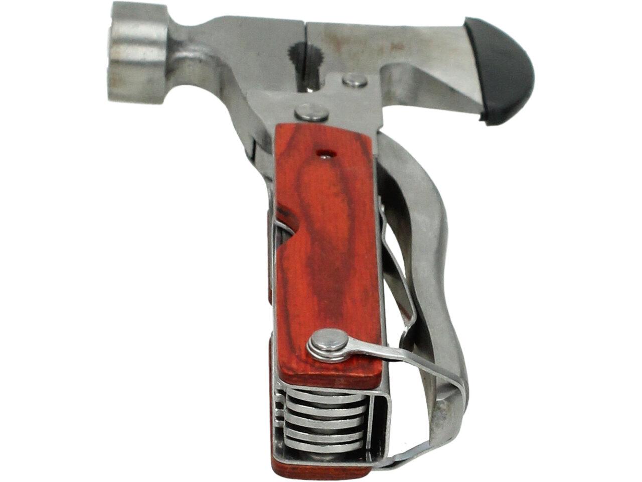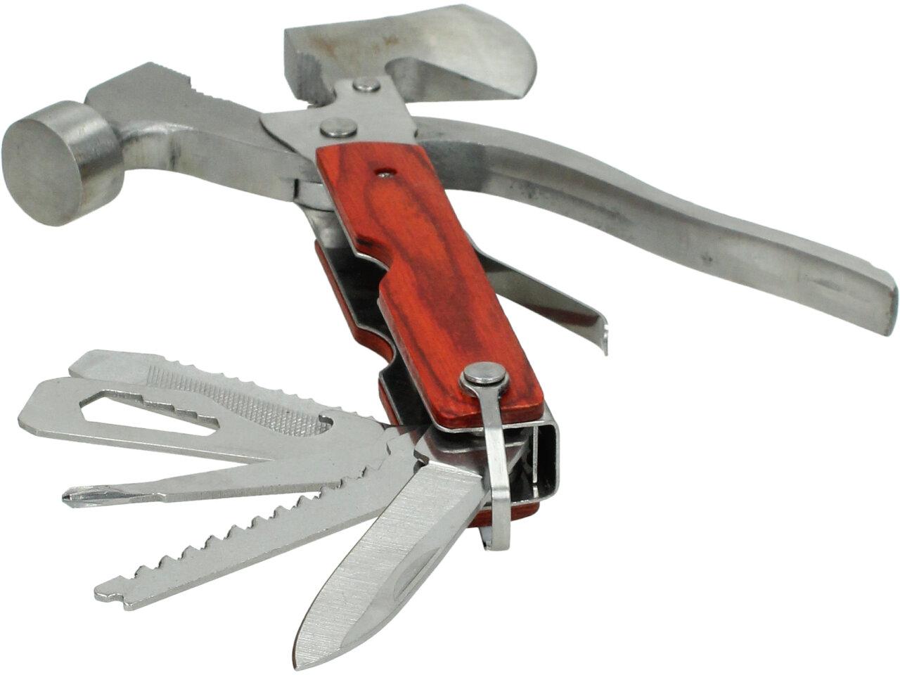 Multifunkční kladívko 18 v jednom - ocel. Povinnost pro každého dobrodruha, trempa, houbaře. Ideální i jako nouzová výbava do vašeho auta. Kladívko je zároveň i multifunkční Švýcarský nůž, tak jak ho všichni už dobře známe.Hodí se ke každé příležitosti, pokud si ho zabalíte cestou pod stan do batohu, nebudete muset zatloukat kolíky dřevem. Díky své kompaktní velikosti a přiměřené váze to není žádná přítěž. Pohodlný úchop díky plastové protiskluzové rukojeti. Obsahuje: kladivo, kleště, štípací kleště, sekerku, samozřejmě nůž, 3 druhy šroubováků, 2druhy pilky, 4 typy klíčů,pilník, páčidlo, otvírák apod.