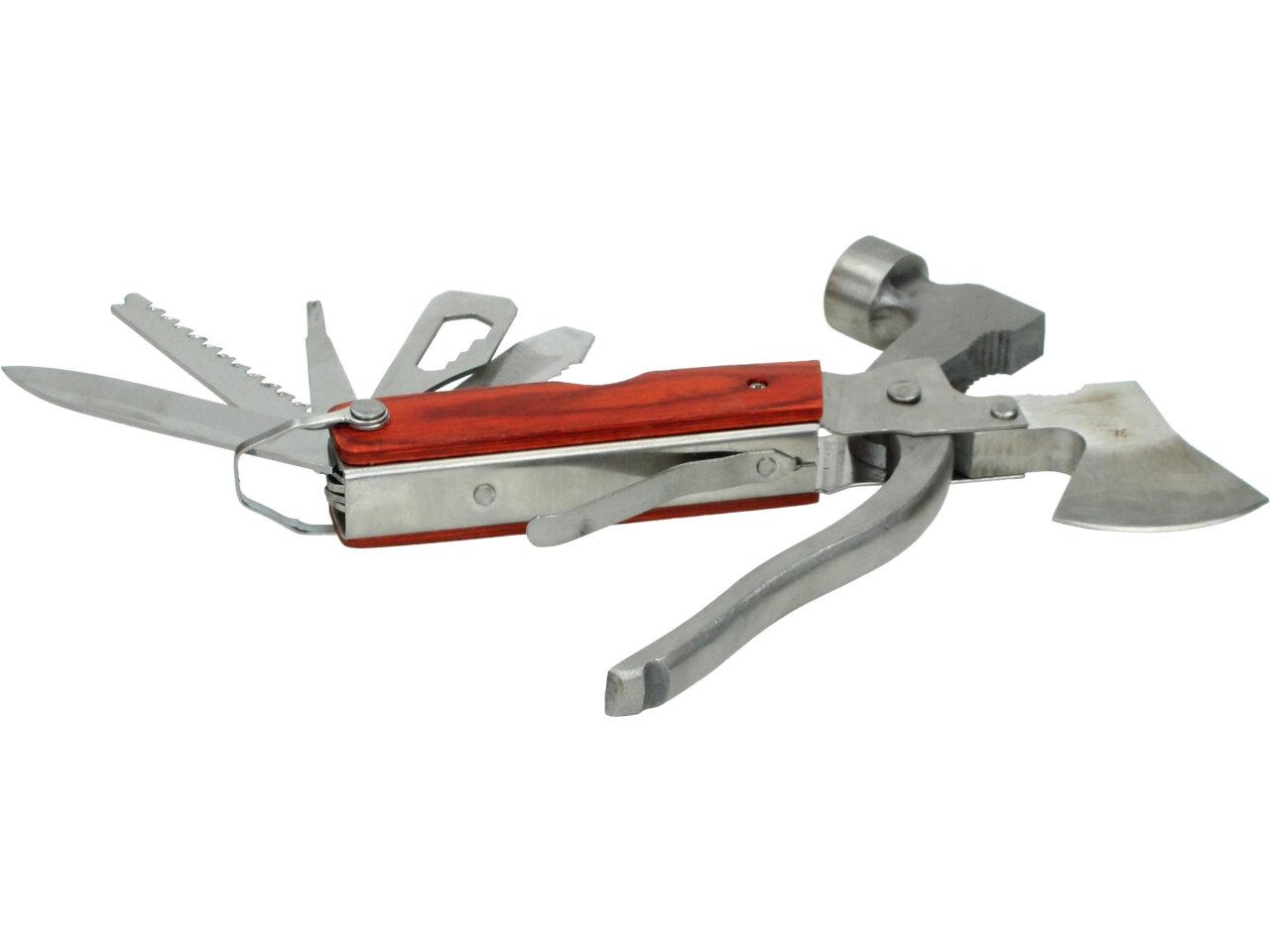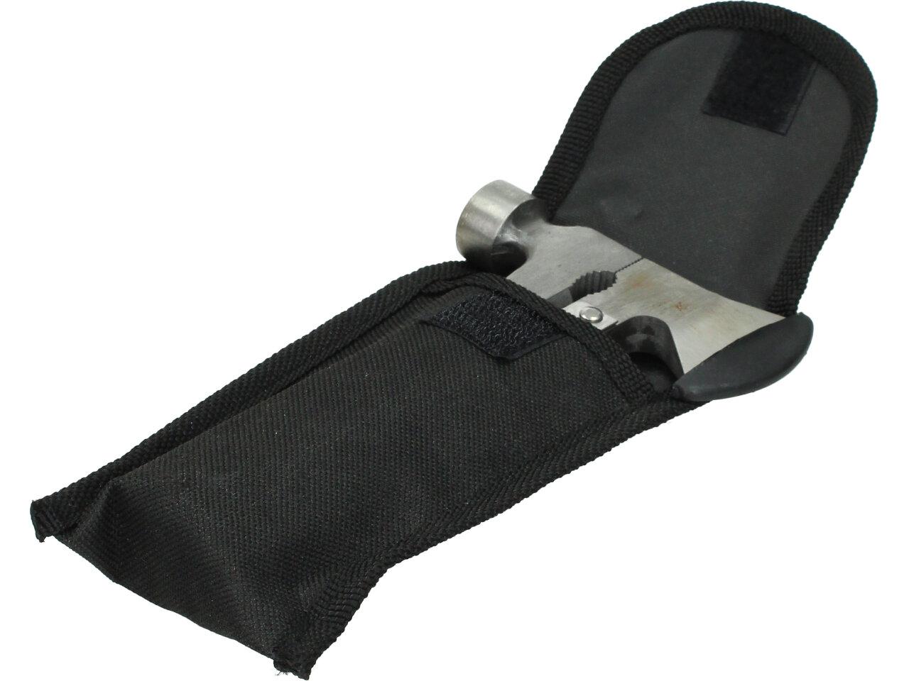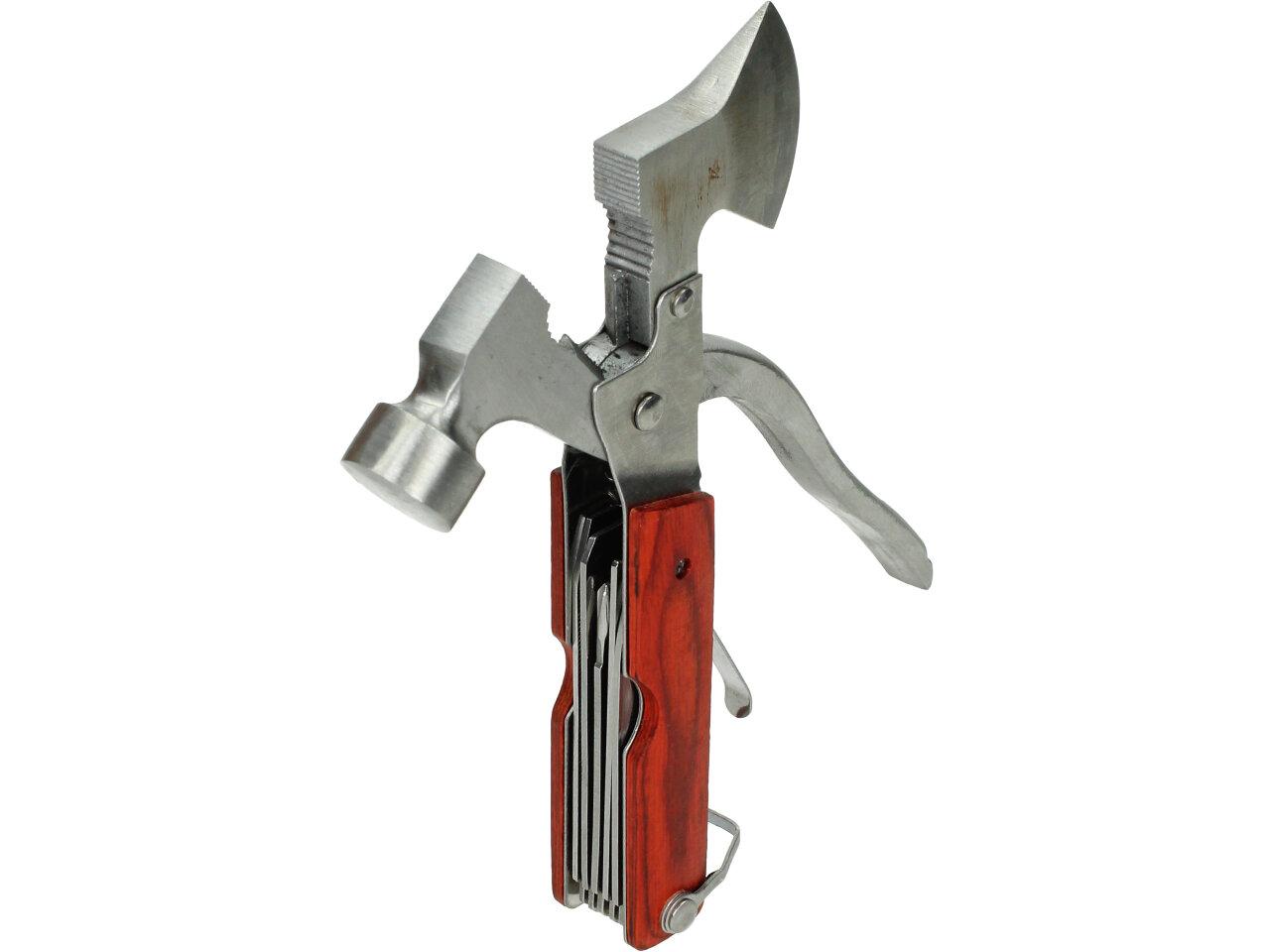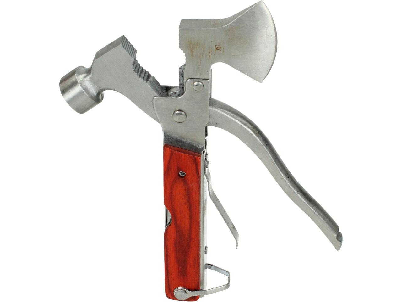 Multifunkční kladívko 18 v jednom - ocel. Povinnost pro každého dobrodruha, trempa, houbaře. Ideální i jako nouzová výbava do vašeho auta. Kladívko je zároveň i multifunkční Švýcarský nůž, tak jak ho všichni už dobře známe.Hodí se ke každé příležitosti, pokud si ho zabalíte cestou pod stan do batohu, nebudete muset zatloukat kolíky dřevem. Díky své kompaktní velikosti a přiměřené váze to není žádná přítěž. Pohodlný úchop díky plastové protiskluzové rukojeti. Obsahuje: kladivo, kleště, štípací kleště, sekerku, samozřejmě nůž, 3 druhy šroubováků, 2druhy pilky, 4 typy klíčů,pilník, páčidlo, otvírák apod.