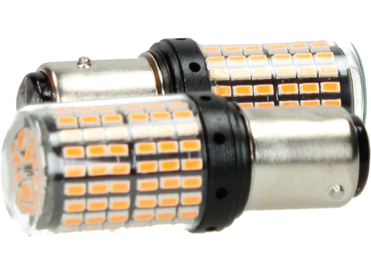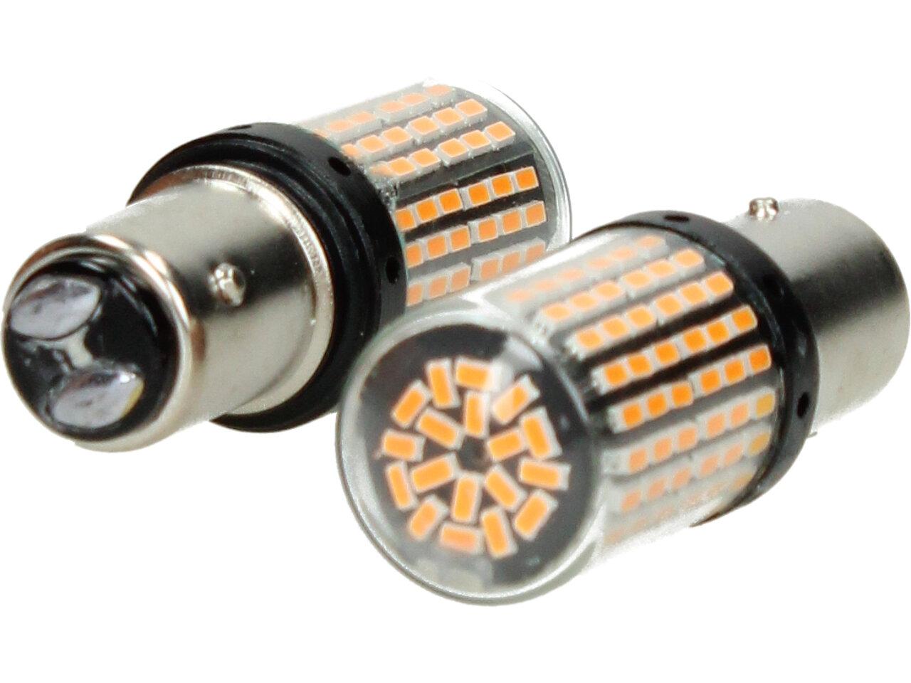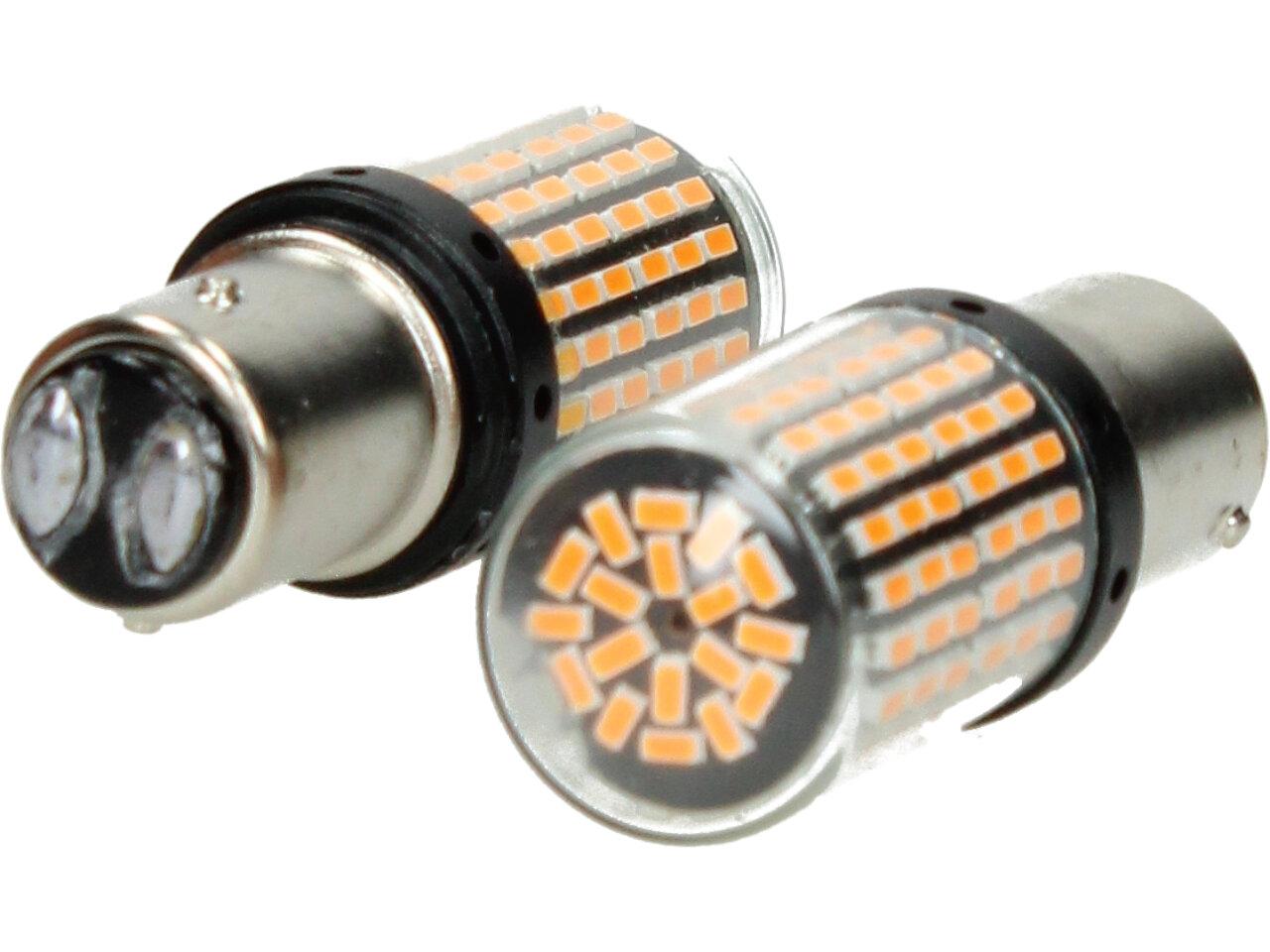 Oranžová LED žárovka do auta BAY15D sada 2ks dvoupólová je určena pro použití jako blinkr nebo ukazatel směru na vozidle. Tento typ žárovek je vyráběn s dvěma póly, což umožňuje použití jako blinkr, když se jeden pól používá jako světelný zdroj a druhý pól jako zdroj země.