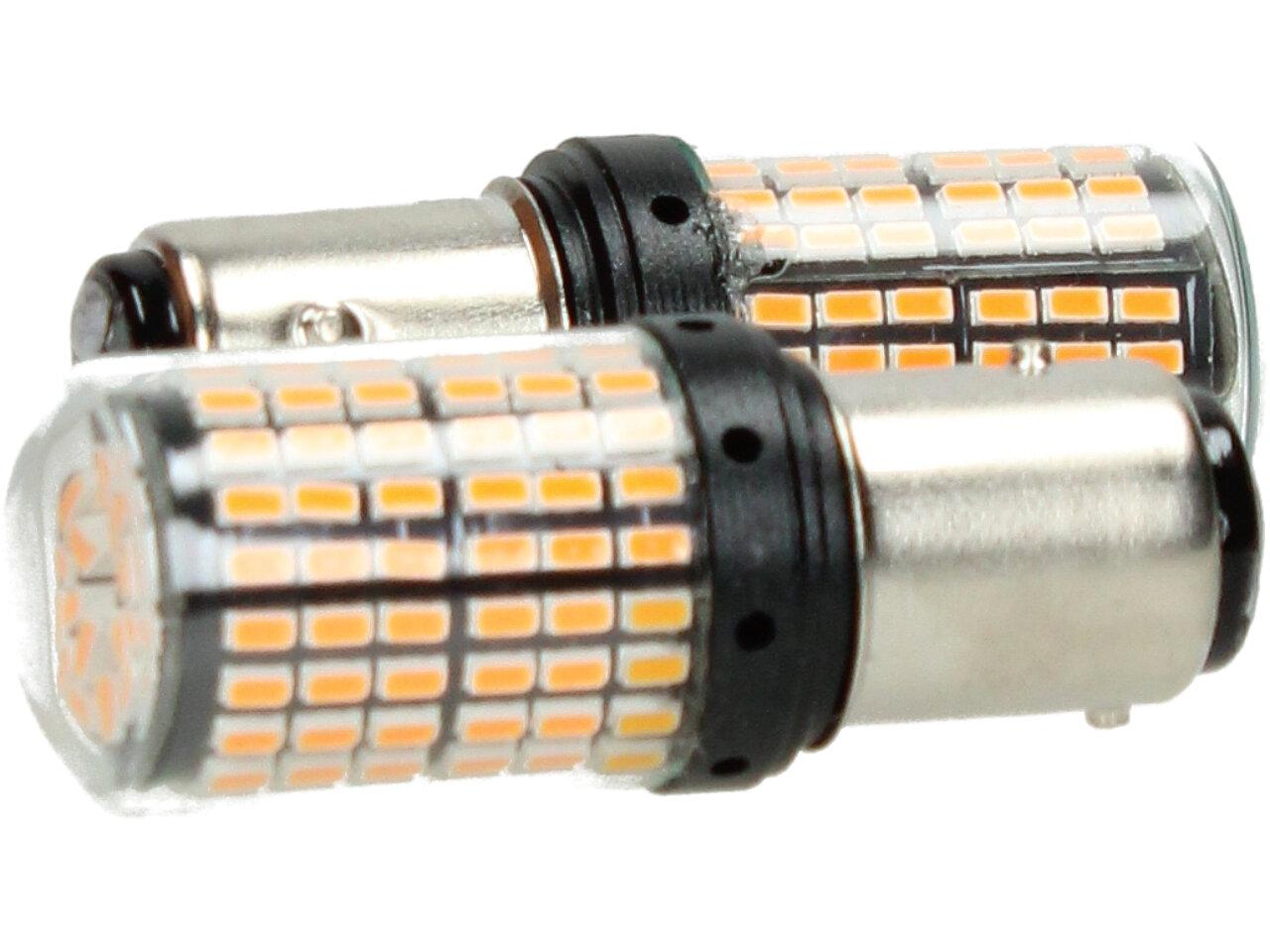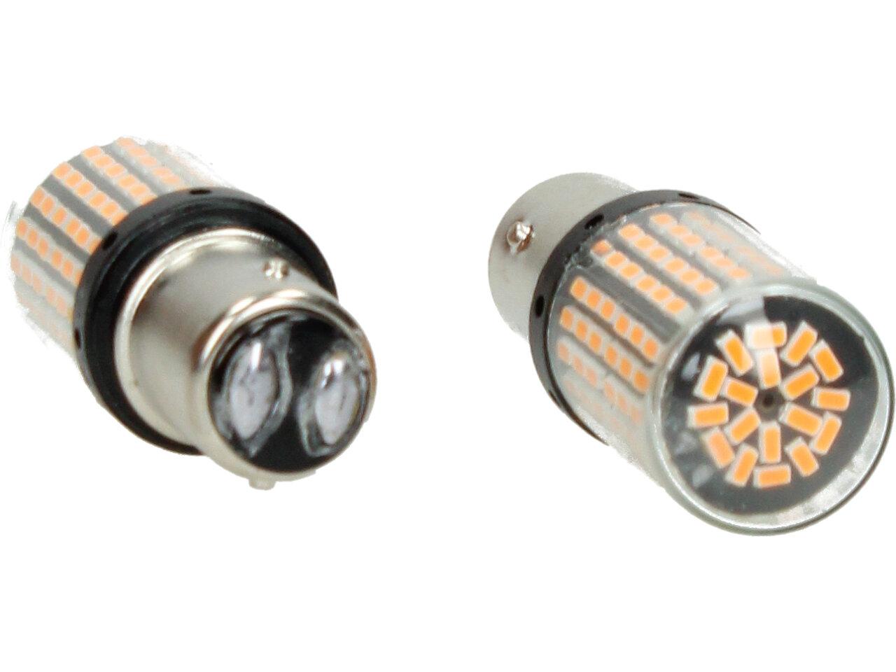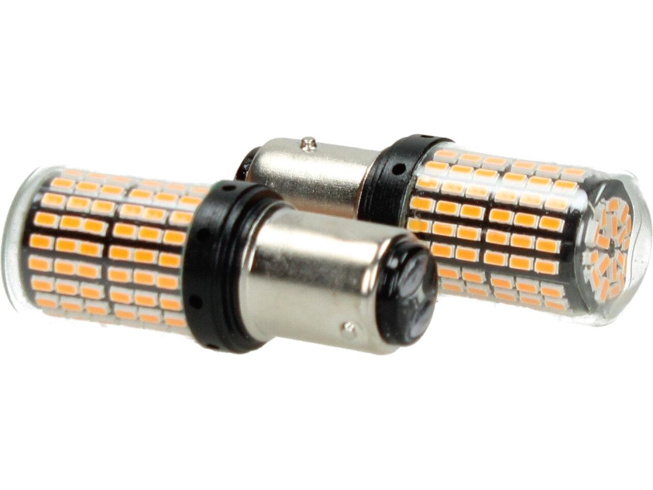 Oranžová LED žárovka do auta BAY15D sada 2ks dvoupólová je určena pro použití jako blinkr nebo ukazatel směru na vozidle. Tento typ žárovek je vyráběn s dvěma póly, což umožňuje použití jako blinkr, když se jeden pól používá jako světelný zdroj a druhý pól jako zdroj země.
