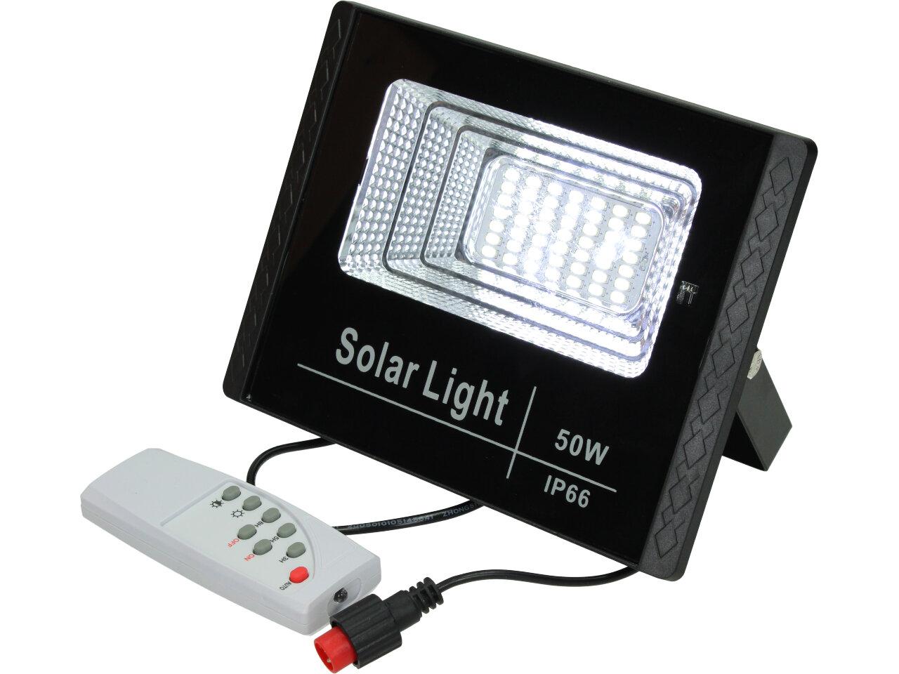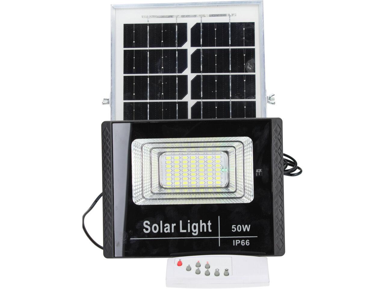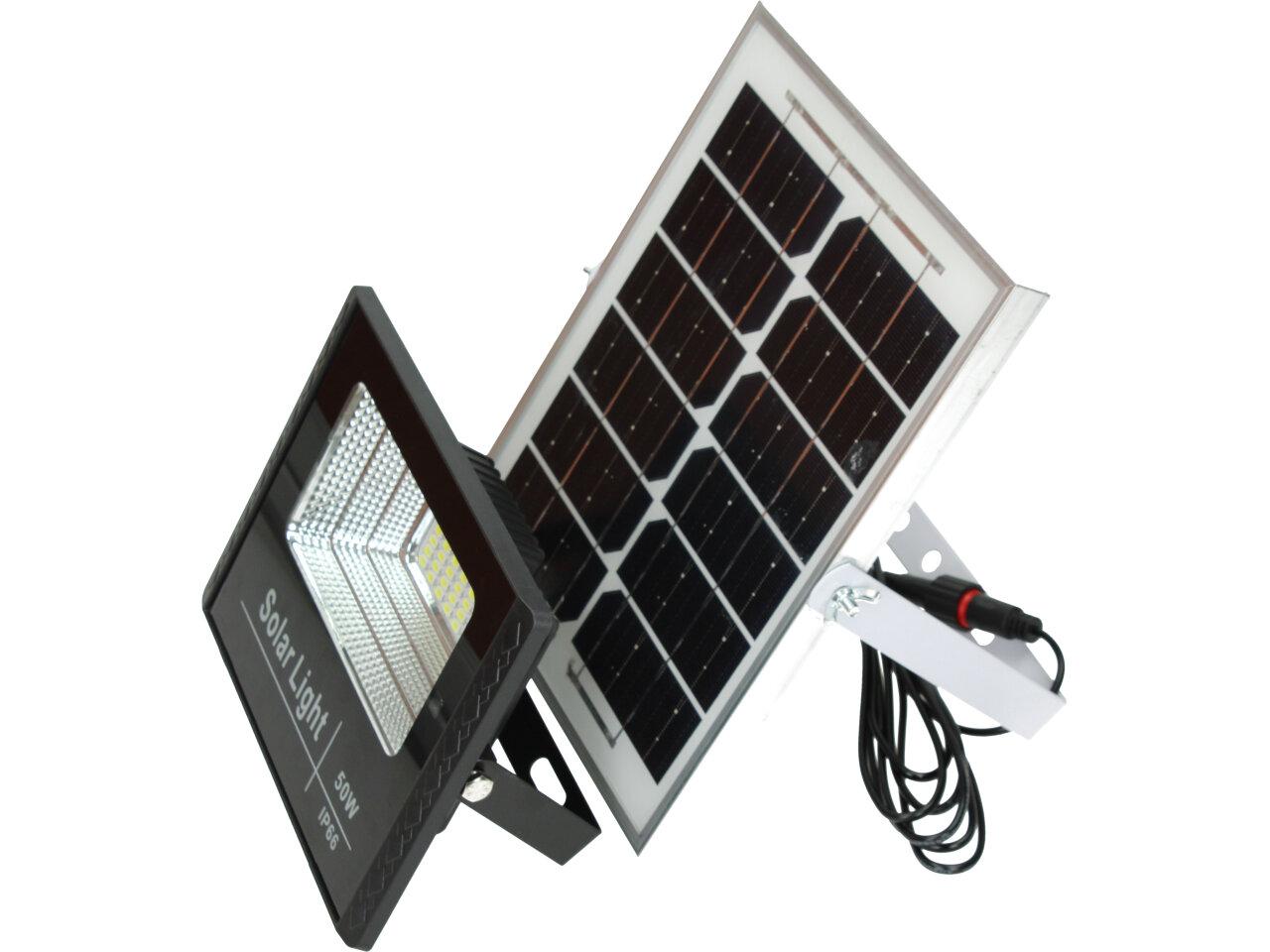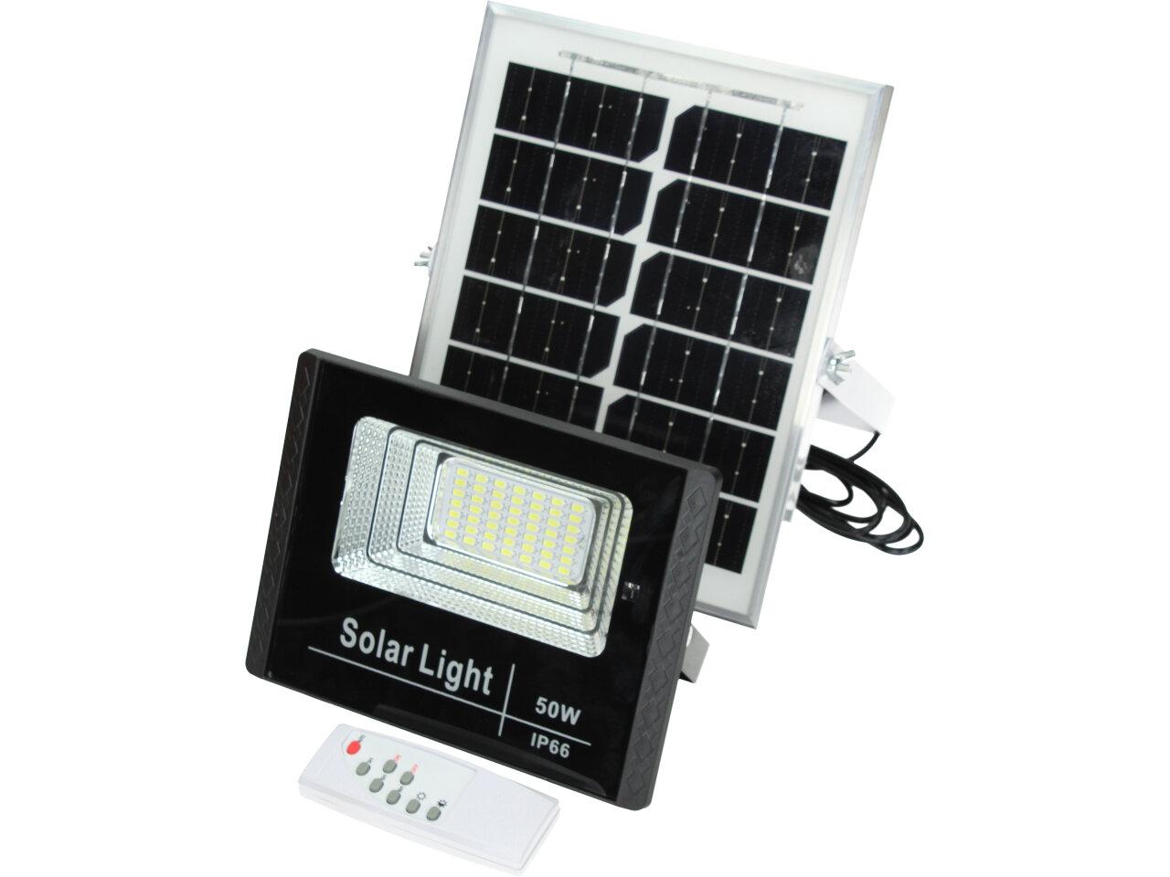 Solární osvětlovací LED technika Reflektor 50W se solárním panelem a dálkovým ovladačem. Díky oddělenému solárnímu panelu můžete používat třeba v karavanu, pod stanem, nebo vjezdové bráně. Solární reflektor o výkonu 50W svítí na vzdálenost cca 6 metrů. U solárního systému lze pomocí dálkového ovladače nastavit automatické zapnutí při setmění, stálé svícení a svícení na daný časový úsek. Pracovní doba na plné nabití cca 6-8 hodin. Spojovací materiál, držáčky a šroubky jsou součástí balení.