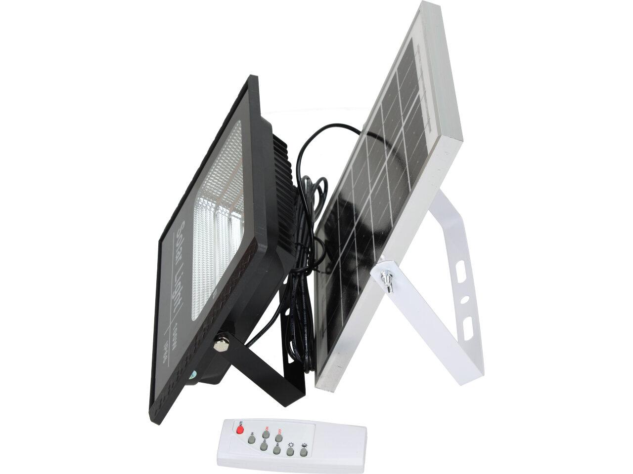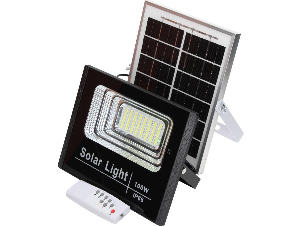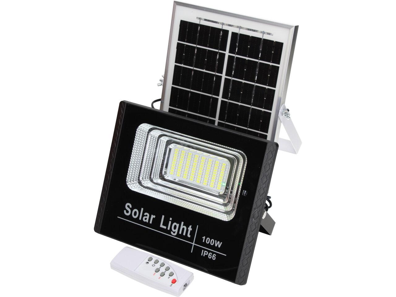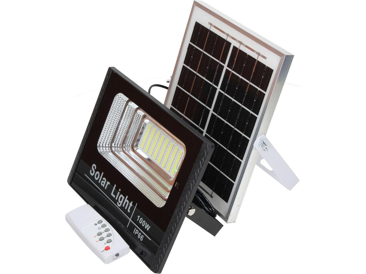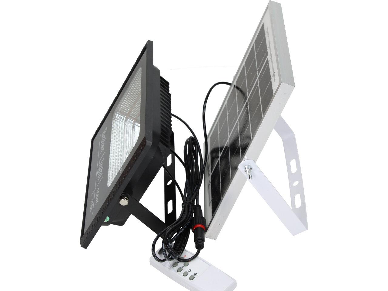 Solární osvětlovací LED technika Reflektor 100W se solárním panelem a dálkovým ovladačem. Díky oddělenému solárnímu panelu můžete používat třeba v karavanu, pod stanem, nebo vjezdové bráně. Solární reflektor o výkonu 1000W svítí na vzdálenost cca 6 metrů. U solárního systému lze pomocí dálkového ovladače nastavit automatické zapnutí při setmění, stálé svícení a svícení na daný časový úsek. Pracovní doba na plné nabití cca 6-8 hodin. Spojovací materiál, držáčky a šroubky jsou součástí balení.