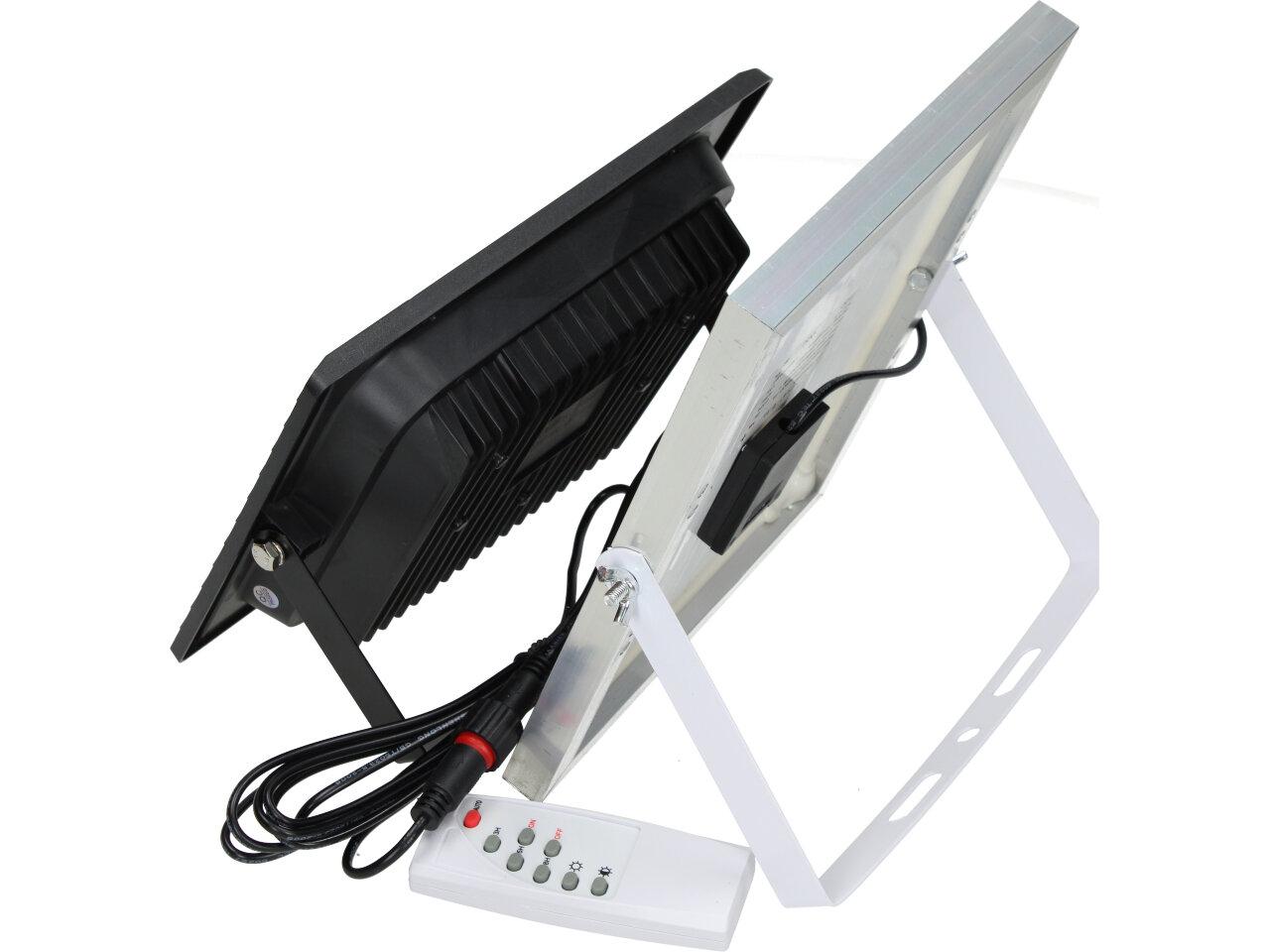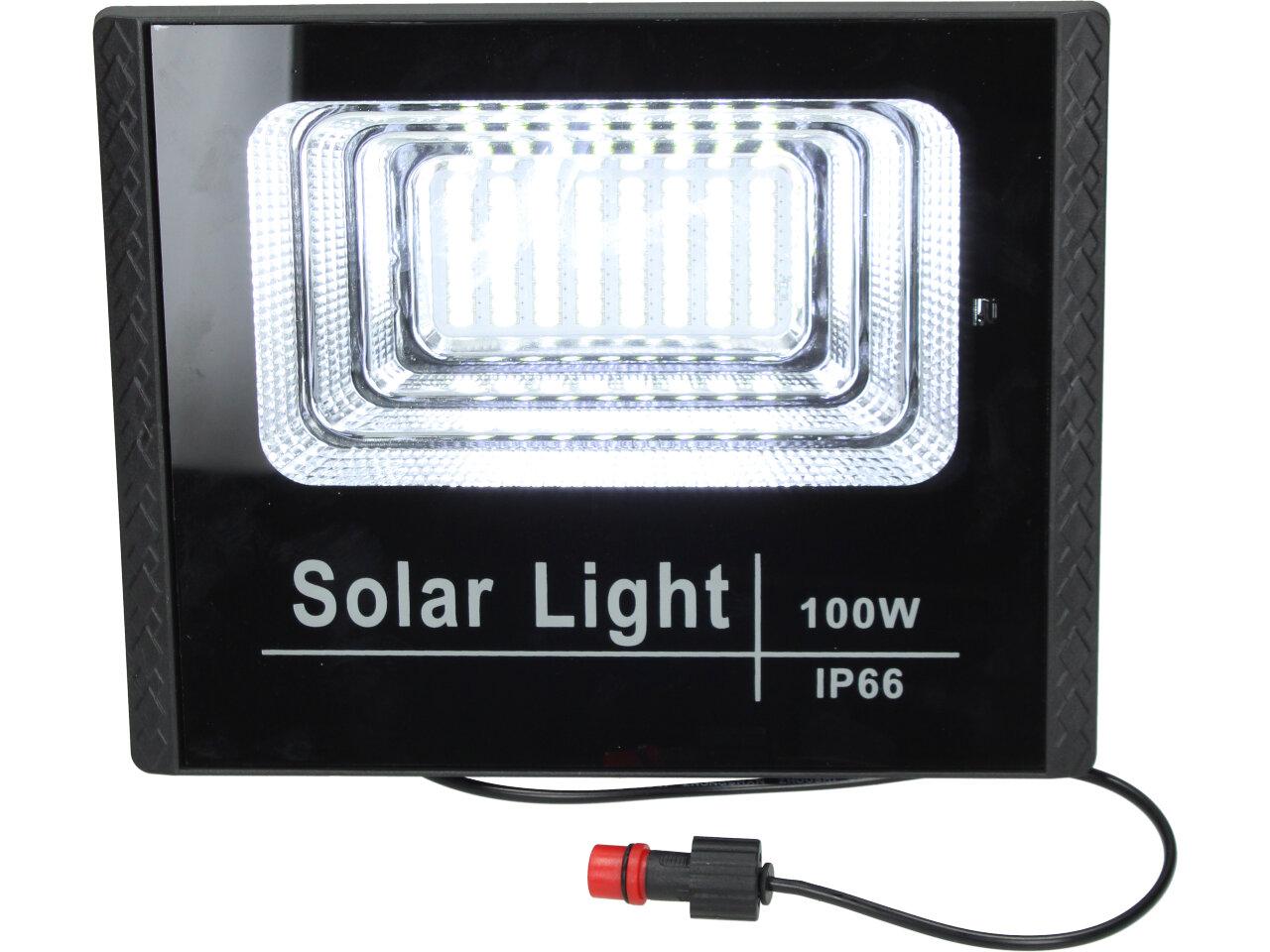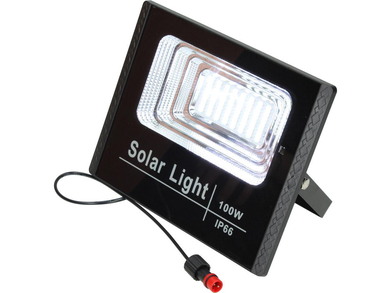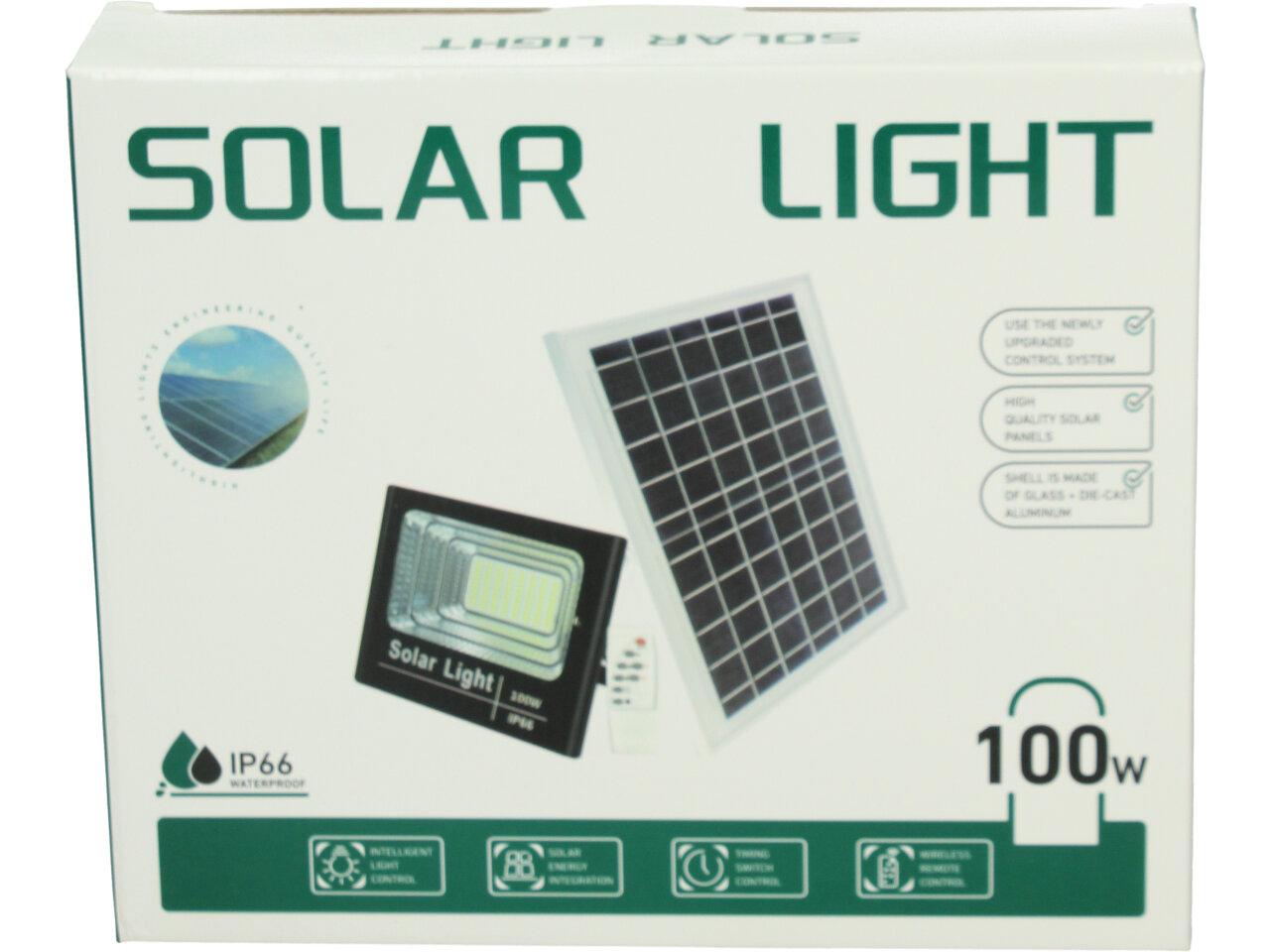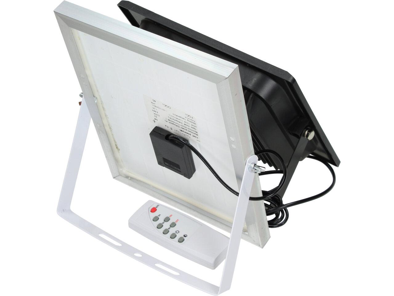 Solární osvětlovací LED technika Reflektor 100W se solárním panelem a dálkovým ovladačem. Díky oddělenému solárnímu panelu můžete používat třeba v karavanu, pod stanem, nebo vjezdové bráně. Solární reflektor o výkonu 1000W svítí na vzdálenost cca 6 metrů. U solárního systému lze pomocí dálkového ovladače nastavit automatické zapnutí při setmění, stálé svícení a svícení na daný časový úsek. Pracovní doba na plné nabití cca 6-8 hodin. Spojovací materiál, držáčky a šroubky jsou součástí balení.