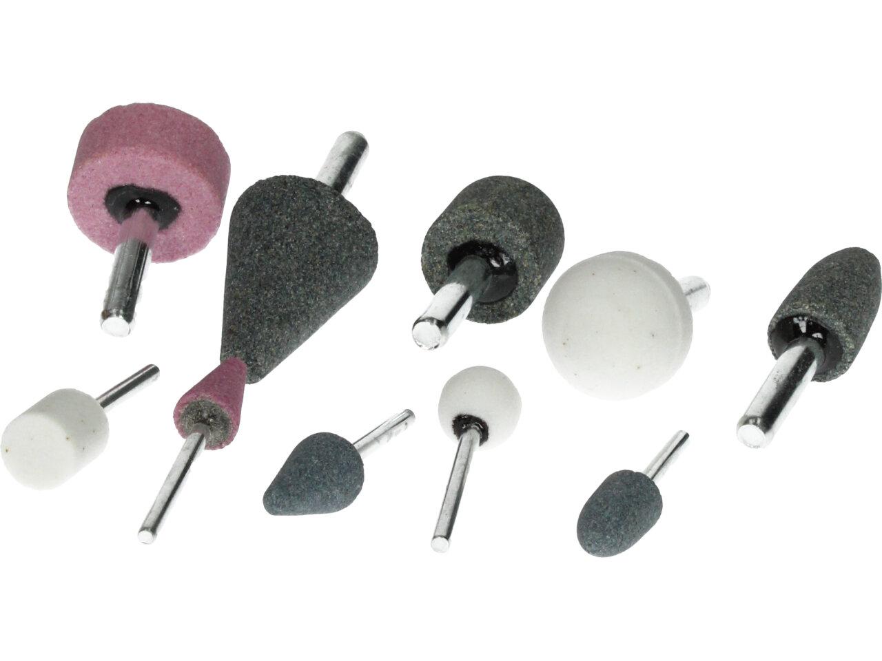 Brusná tělíska pro přímé brusky s vřetenem pro uchycení stopky 6 mm a vrtačky. Sada 10 kusů obsahuje brusná tělíska různých tvarů a barev, která se ideálně hodí k broušení např. keramiky, skla nebo kovu. Brusná tělíska mají upínání 1/4", 1/8". Též lze použít upnutím ve vrtačce, ale s nižší účinností. Sada se skládá z: Tělíska válcové s kuželem, Tělíska kulaté, Tělíska válcové, Tělíska ploché, Tělíska kuželové.
