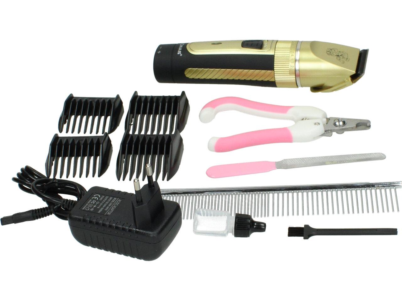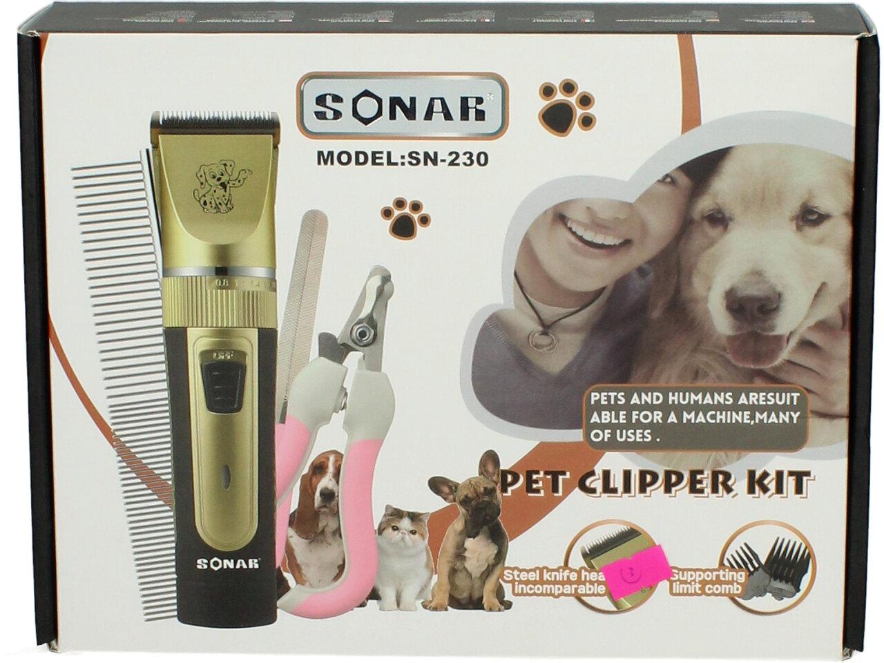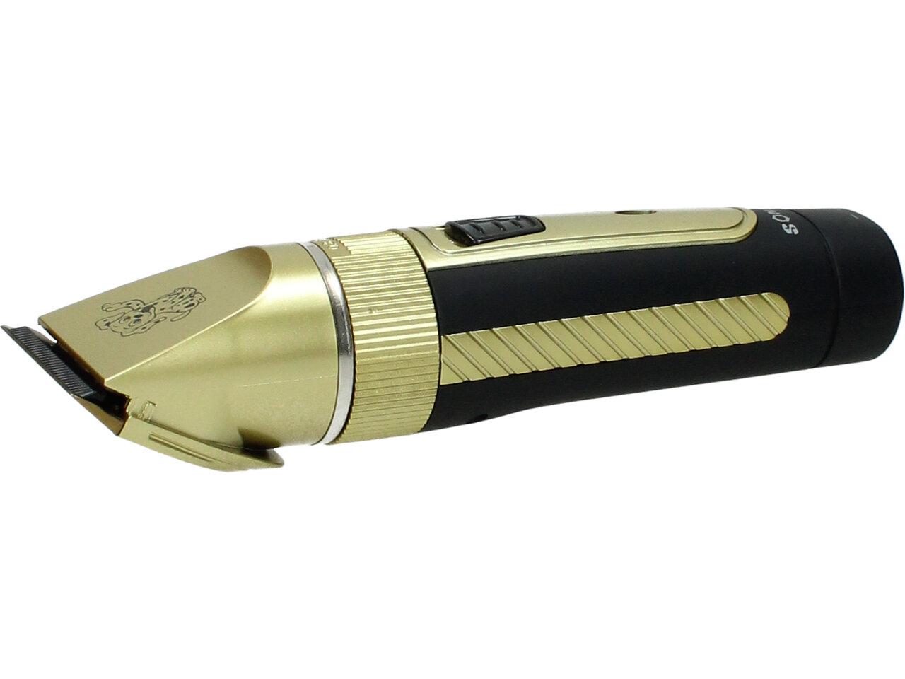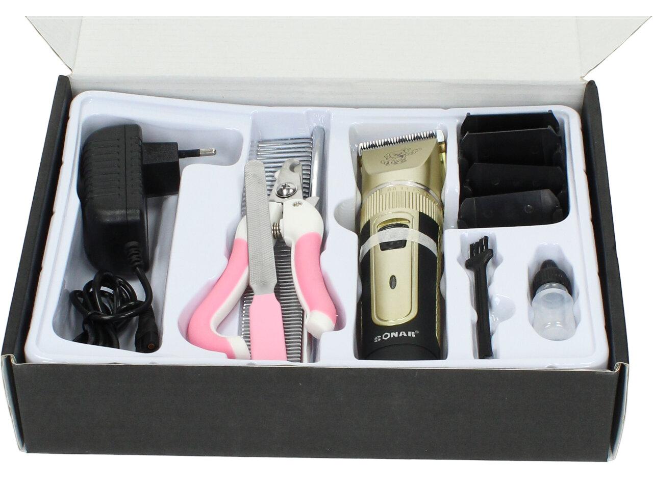 Kvalitní do ruky padnoucí holící strojek Sonar Animal ve zlaté barvě v kombinaci s chromem. Stříhací strojek je nabíjecí a zárověň může být i napájený ze sítě 220V. V sadě naleznete 4 kusy nástavců, díky kterým nastavíte délku stříhání, kabel, díky kterému se strojek napájí, kleště na drápky a zesílený pilník.