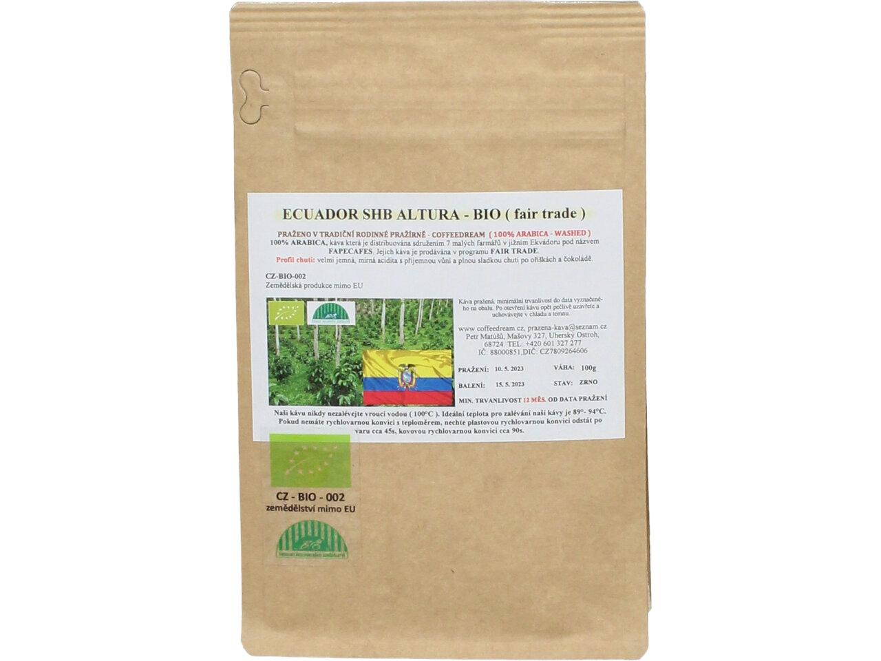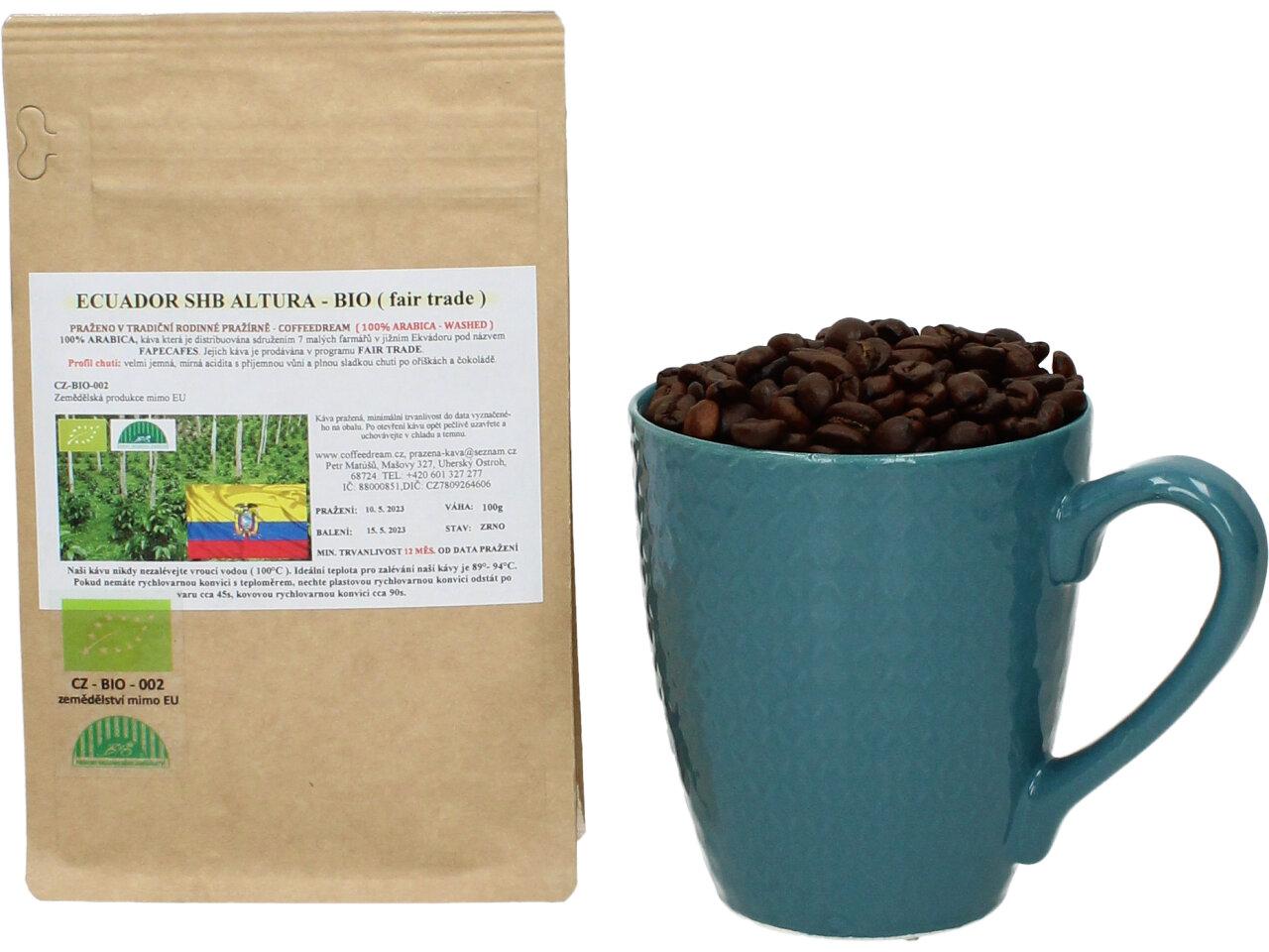 Zrnková Káva EKVADOR SHB ALTURA - BIO. Káva, která je distribuována sružením 7 malých farmářů v jižním Ekvádoru pod názvem FAPECAFES. Jejich káva je prodávána v programu FAIR TRADE. Chuť je velmi jemná, mírně kyselá s příjemnou vůní a plnou sladkou chutí po oříškách a čokoládě.