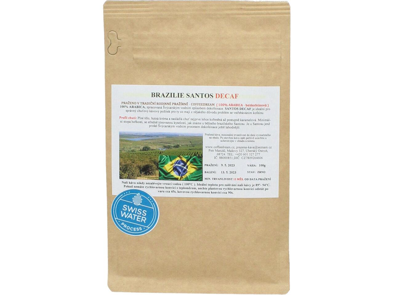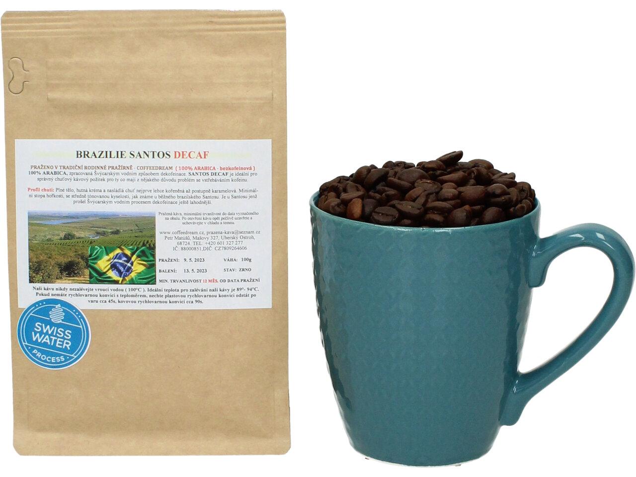 Zrnková Káva BRAZÍLIE SANTOS DECAF - 100% ARABICA, zpracovaná Švýcarským vodním způsobem dekofeinace. SANTOS DECAF je ideální pro správný chuťový kávový požitek pro ty co mají z nějakého důvodu problém se vstřebáváním kofeinu. Plné tělo, hutná kréma a nasládlá chuť nejprve lehce kořeněná až postupně karamelová. Minimální stopa hořkosti, se středně tónovanou kyselostí, jak známe u běžného brazilského Santosu. Je u Santosu jenž prošel Švýcarským vodním procesem dekofeinace ještě lahodnější.