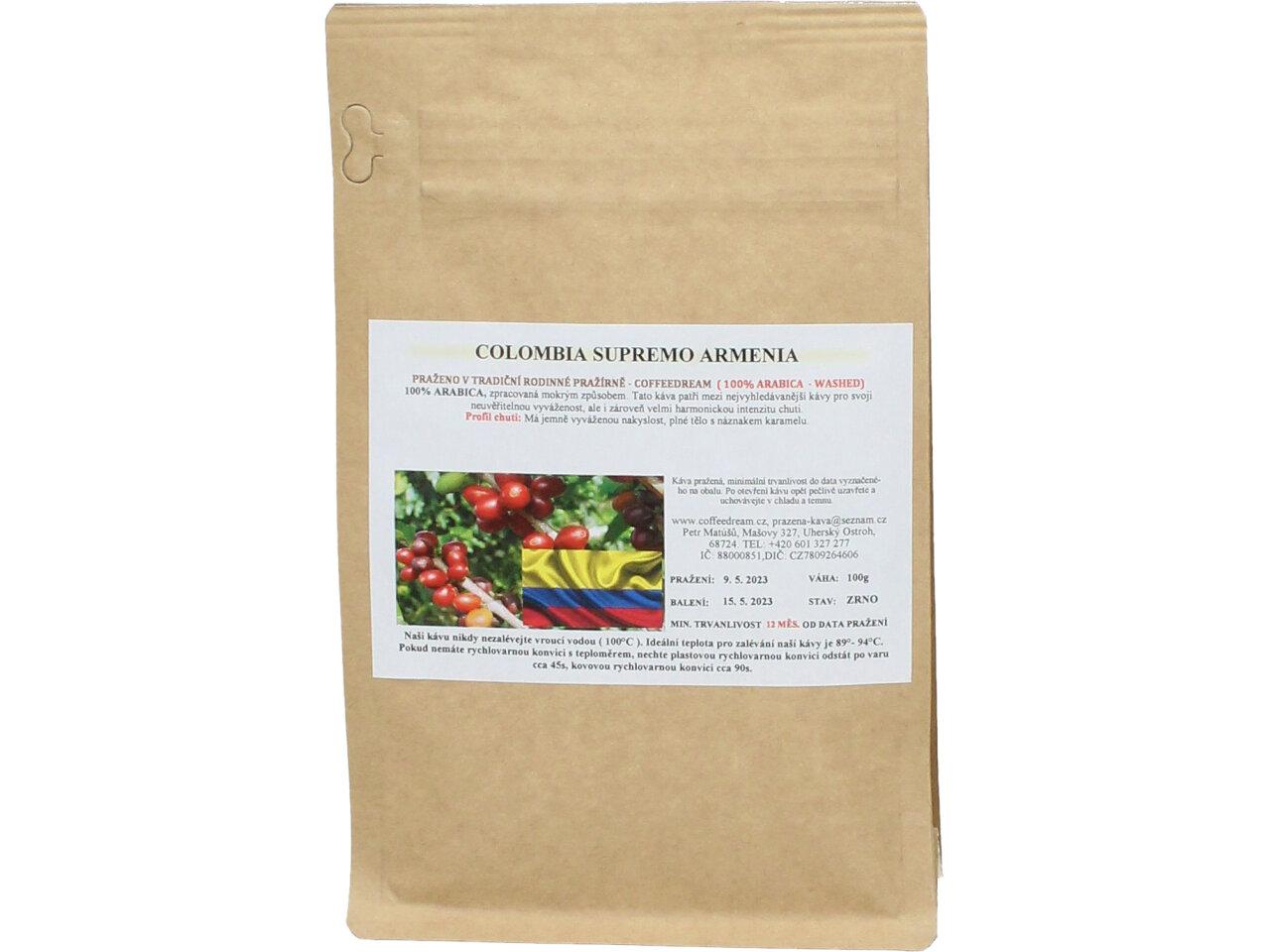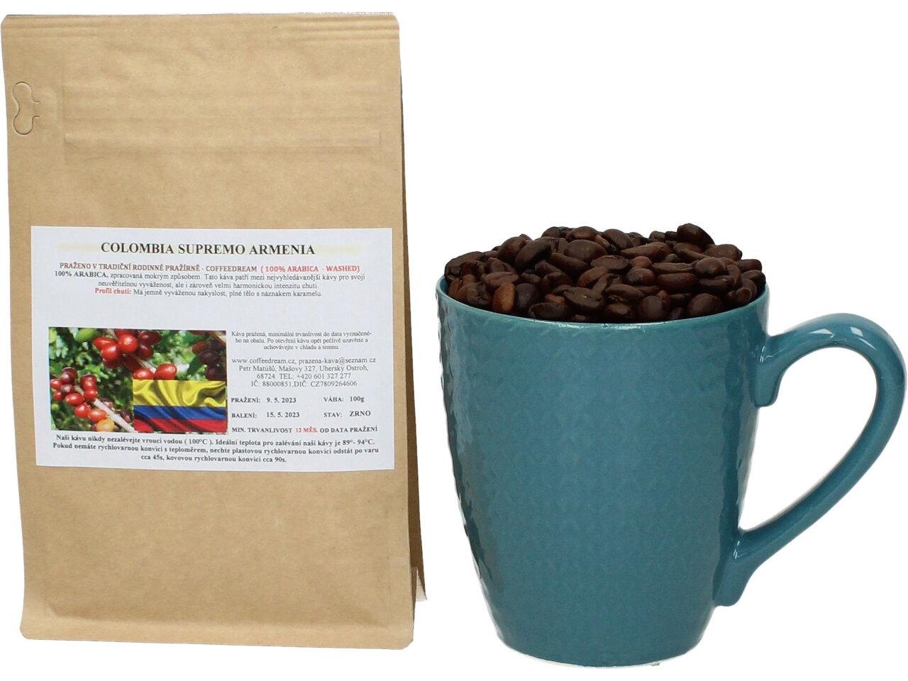 Zrnková Káva KOLUMBIE SUPREMO ARMENIA -zpracovaná mokrým způsobem. Má jemně vyváženou nakyslost, plné tělo s náznakem karamelu. Jedná se o jednu z nejvoňavějších kolumbijských káv.