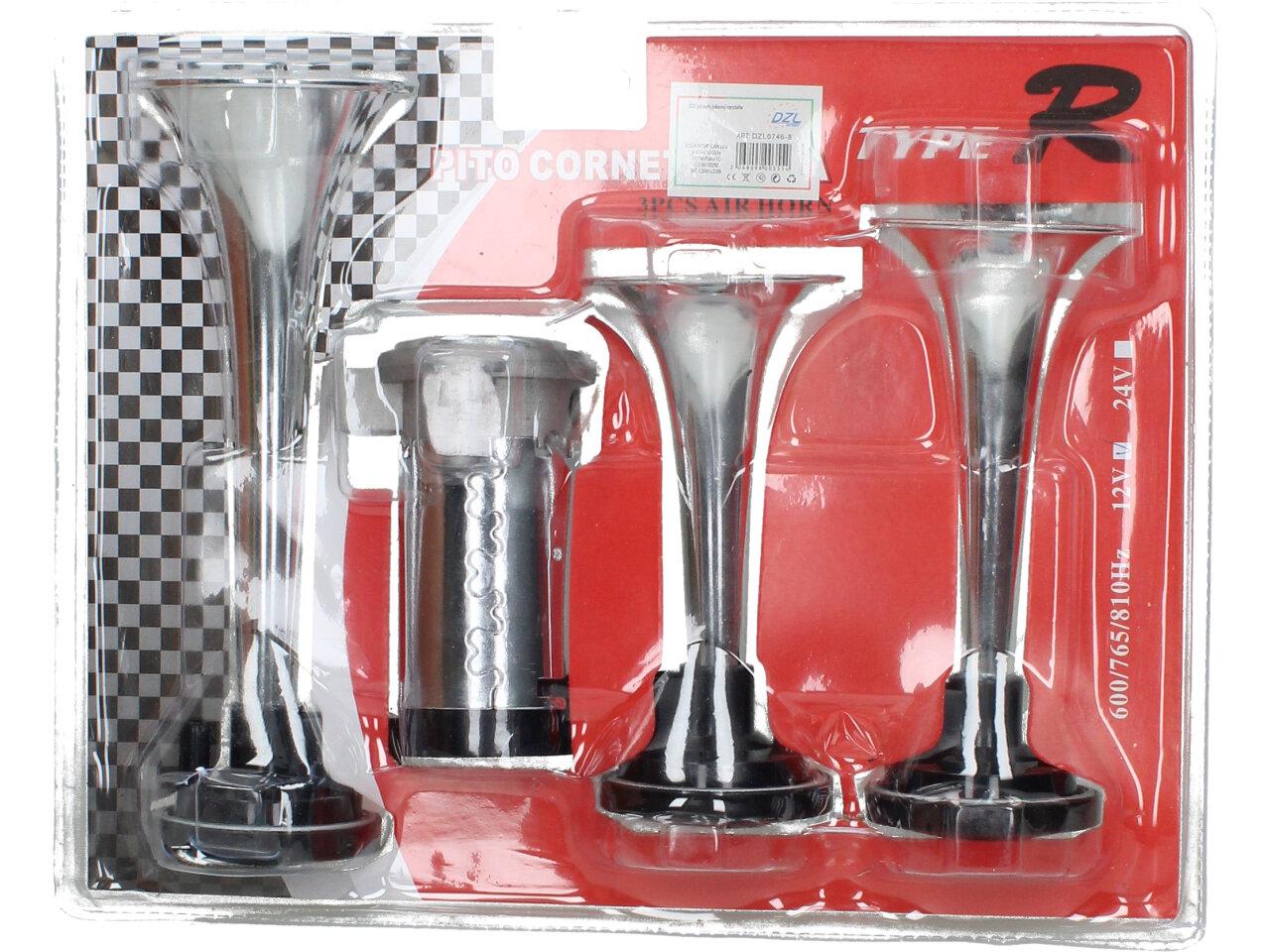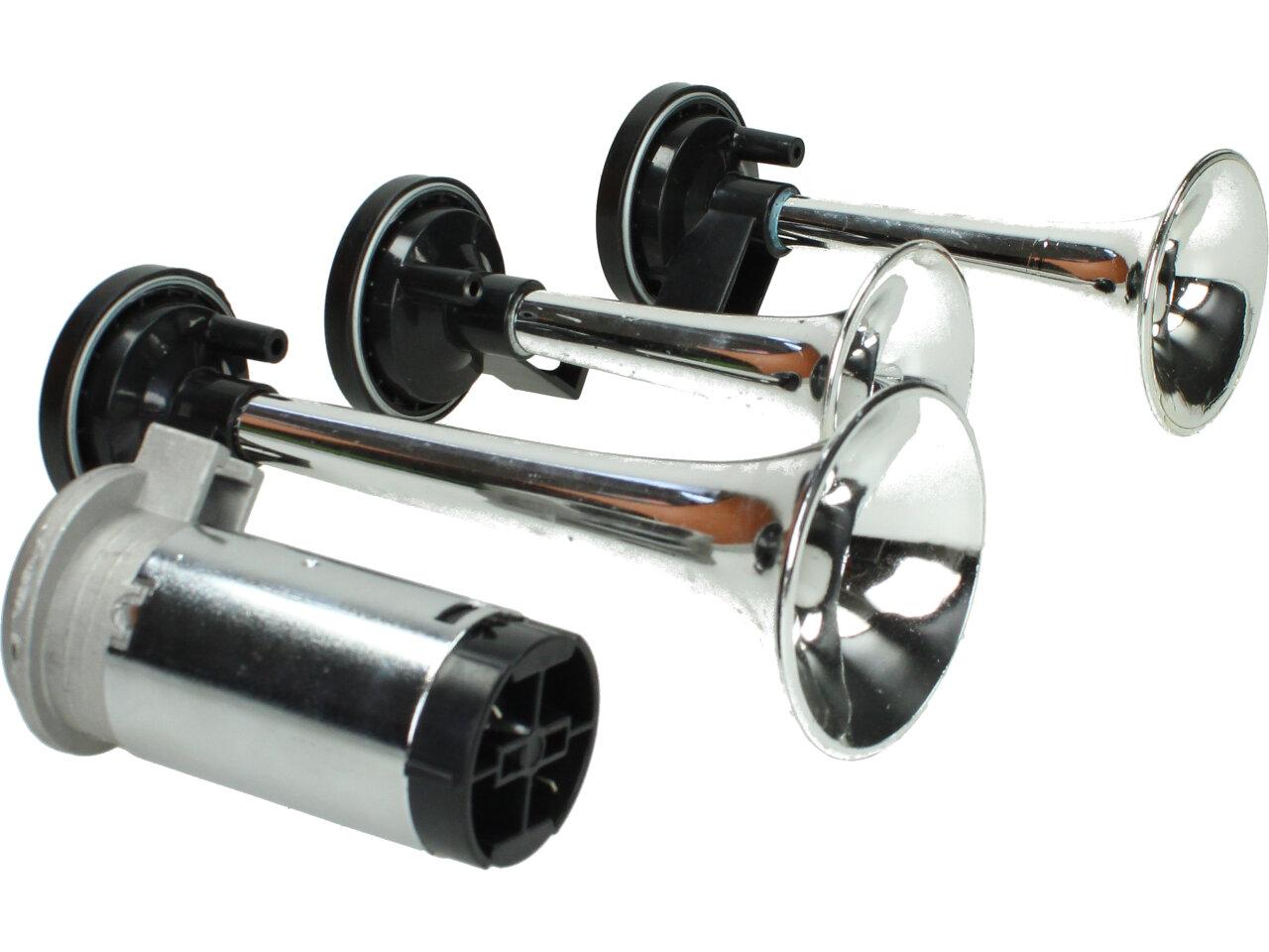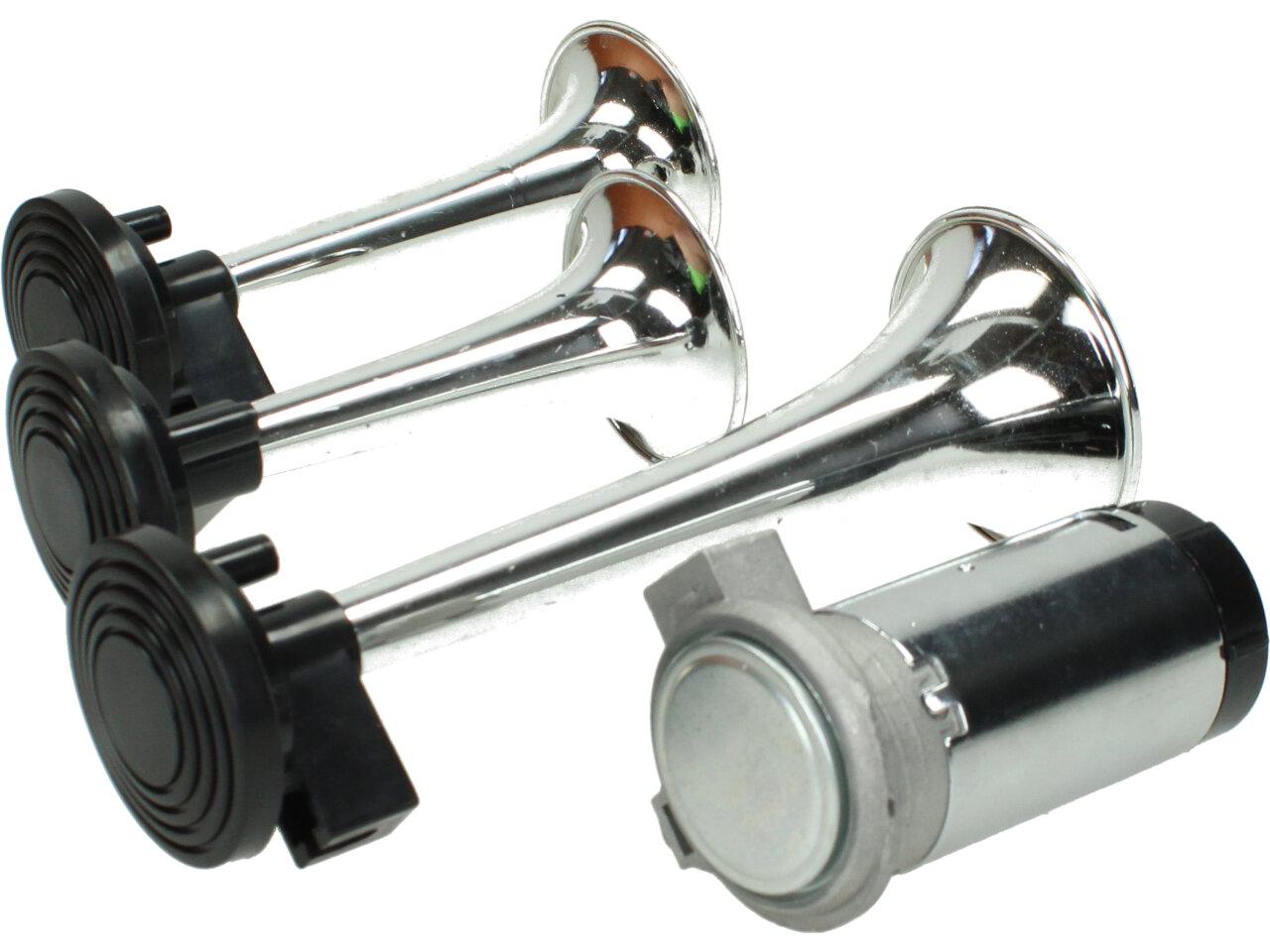 Klakson s kompresorem 12V vzduchový je velmi výkonný klakson v chromované úpravě vhodný do automobilu, nákladního vozu nebo na motocykl. Klakson s kompresorem vzduchový je vybaven spínacím relé, průhlednou vzduchovou hadicí, šrouby k přichycení. Tento klakson vydává opravdu mohutný zvuk, díky kterému si Vás každý všimne. Sada obsahuje 3 ks.