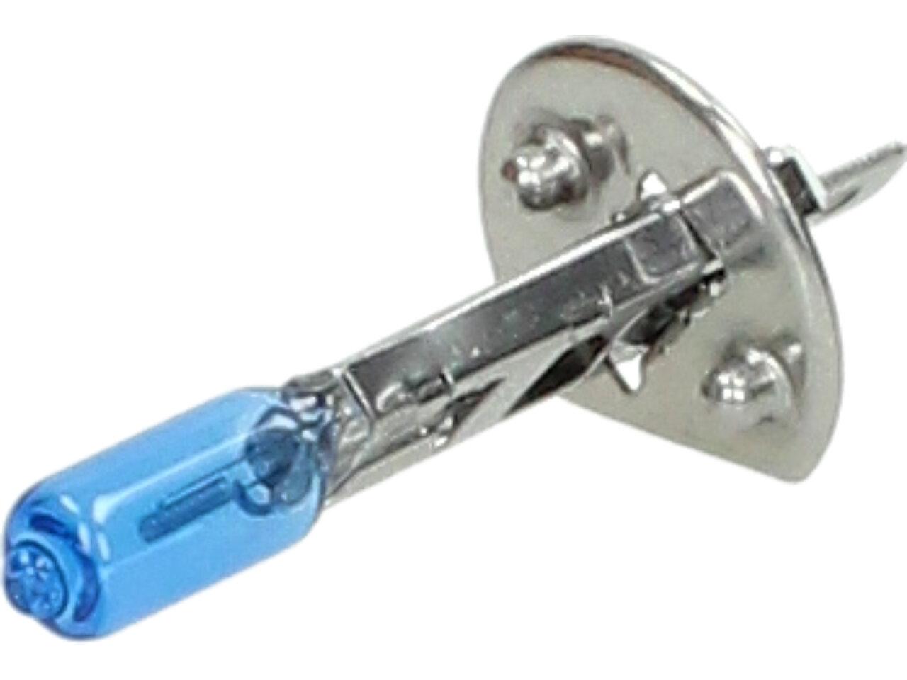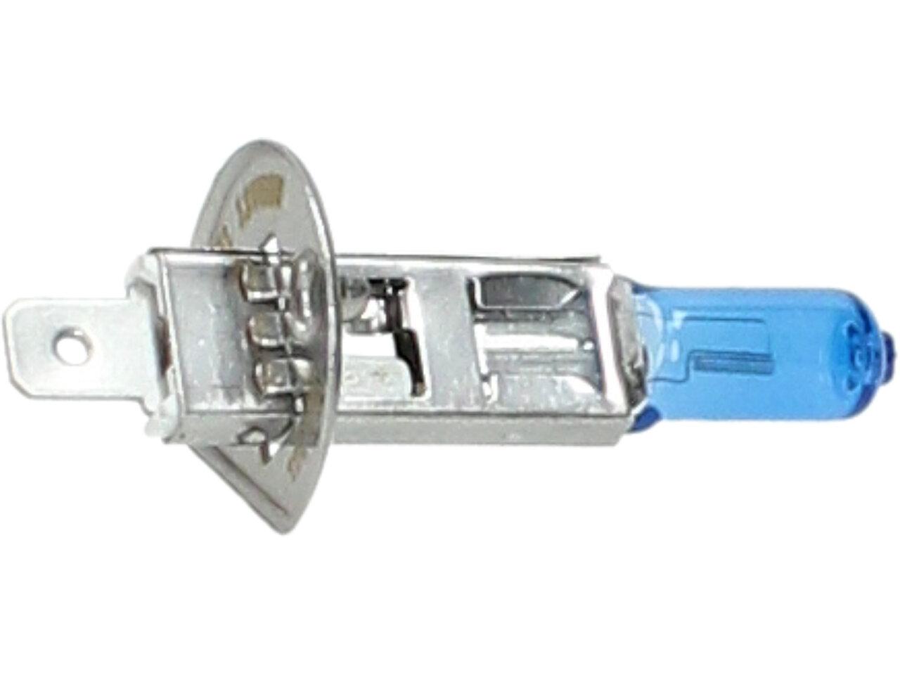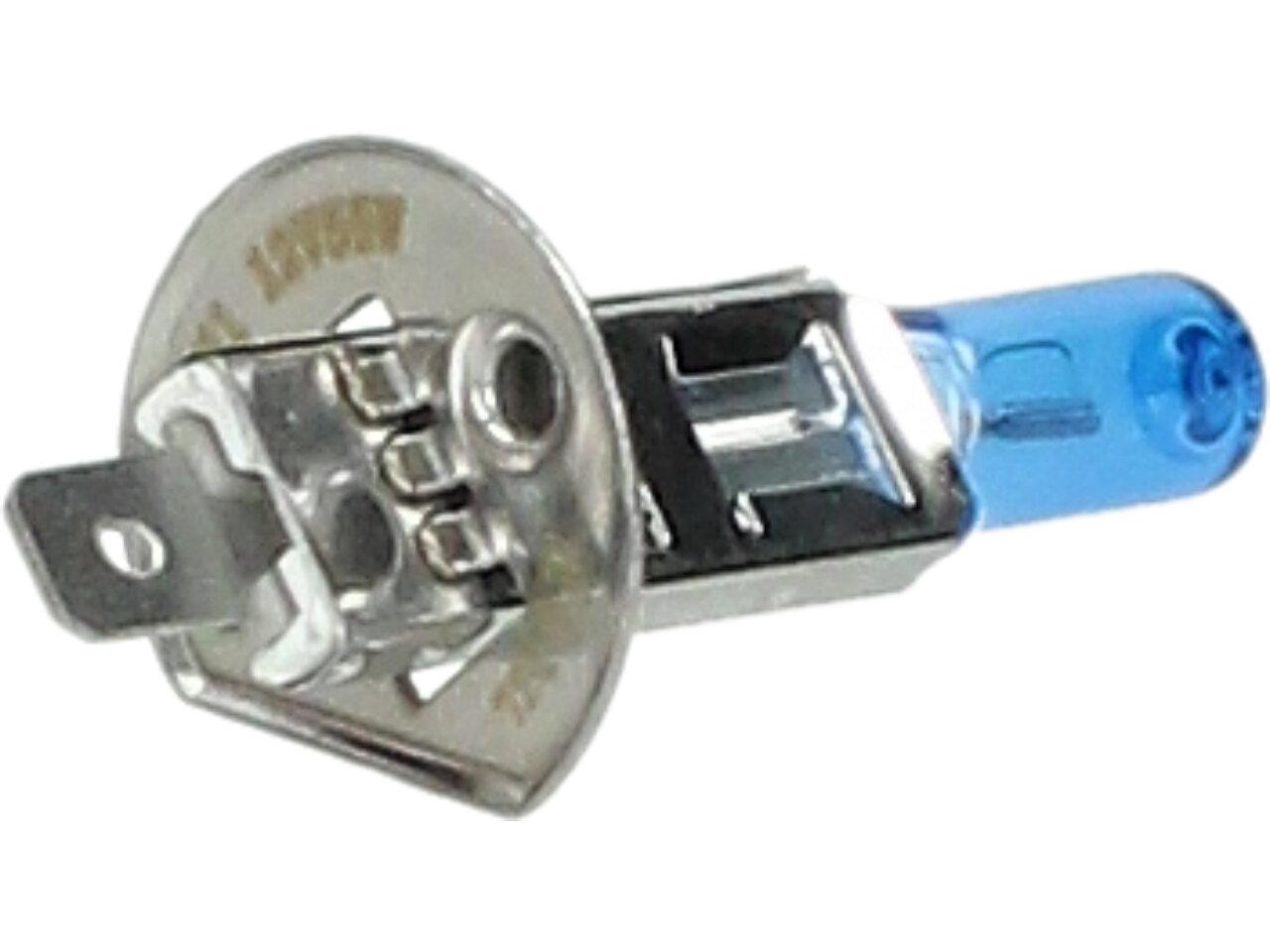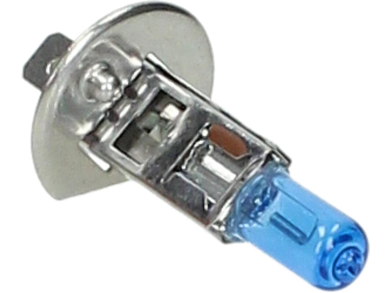 Velice odolná H1 žárovka s barvou světla 5500K (studená bílá) sada 2 kusy do světlometu do auta na 12V jako náhrada za klasickou nevýkonou žárovku H1.
