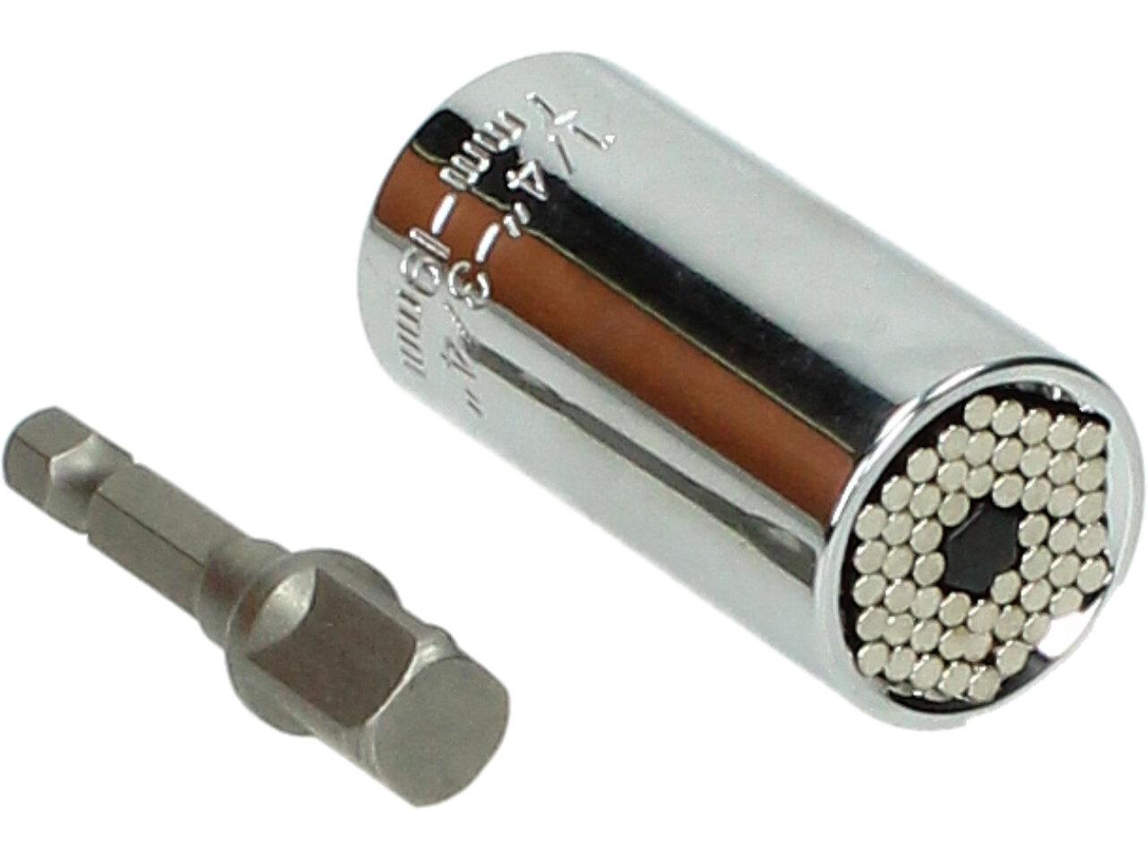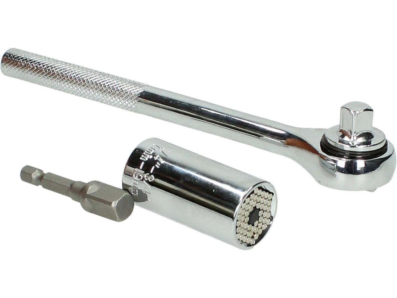 Univerzální nástrčná hlavice s ráčnou nahrazuje čtyř nebo vícehranné nástrčné hlavice. Není potřeba kupovat a skladovat sadu hlavic! Univerzální nástrčnou hlavici lze použít i na atypické tvary (skoby, křídlové matice, očka). Univerzální hlavice je vhodná na montáž šroubů s šestihrannou hlavou o velikosti 7 až 19 mm. Univerzální hlavice umí dotáhnout nebo povolit i šrouby s čtvercovou hlavou, osmihrannou hlavou, křídlové matice, oka a háky na šroubu atd. Neocenitelná je taky možnost povolit šrouby, ventily a další zařízení s poškozeným povrchem, které nelze již povolit standardními klíči. Nástrčnou hlavici lze nasadit na ráčnu 1/2 palce nebo přes redukci na aku šroubovák