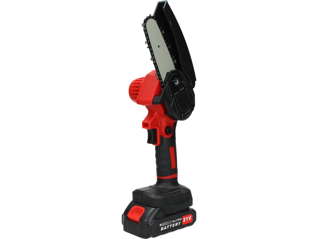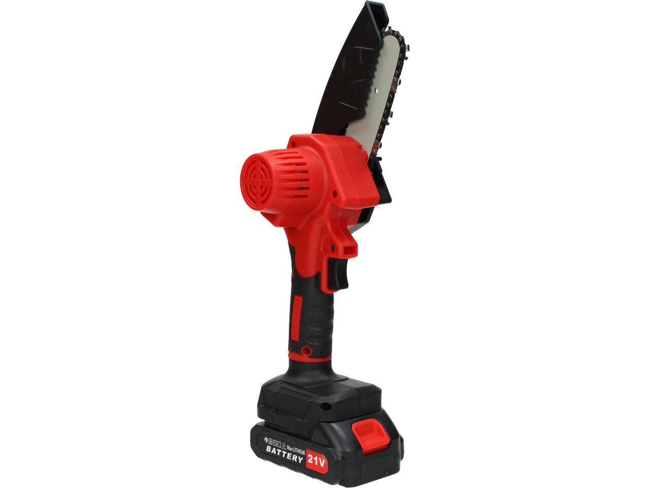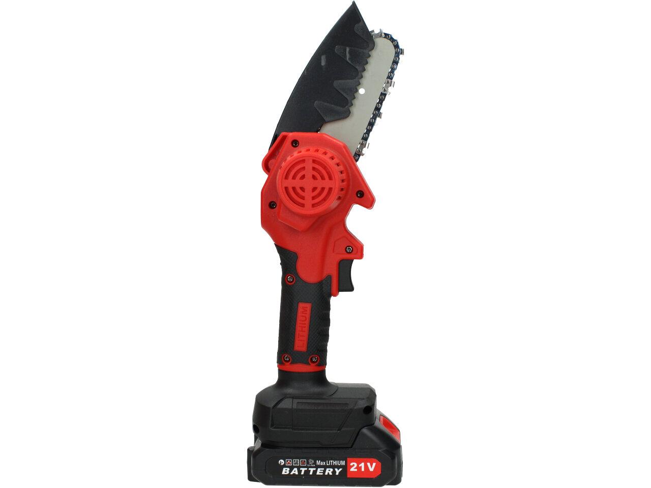 Elektrická ruční pila je vhodná pro zahradnictví a proto by neměla chybět v žádné kůlně. Snadno s ní prořezáte keře, tůje, odříznete větev a mnoho dalšího. Je zde přidané také tlačítko bezpečnostního zámku, které zabrání nechtěnému spuštění. Tato pila se vyznačuje vysokou tvrdostí řetězu a nízkou hmotností, díky které ji můžete používat pouze jednou rukou. Měděný motor zajistí silný výkon a nižší spotřebu energie, to následně zvyšuje efektivitu Vaší práce. Ergonomicky tvarovaná rukojeť poskytne pohodlné a pevné uchopení. Můžete si také nastavit i rychlost řezání, klasickým stlačováním spíneče. Spolu s pilou obdržíte v balení 1x Li-ionovou baterii 21V.