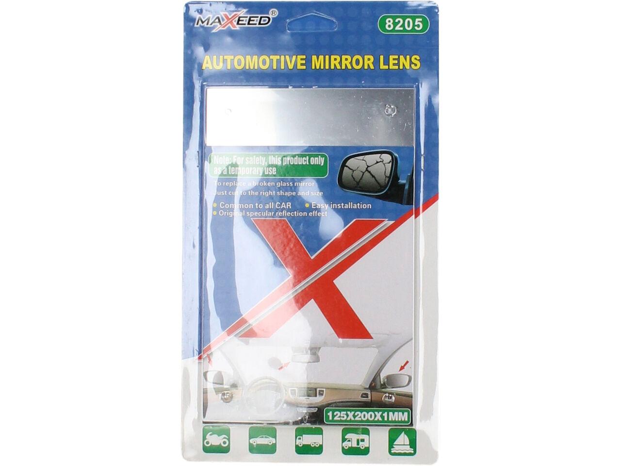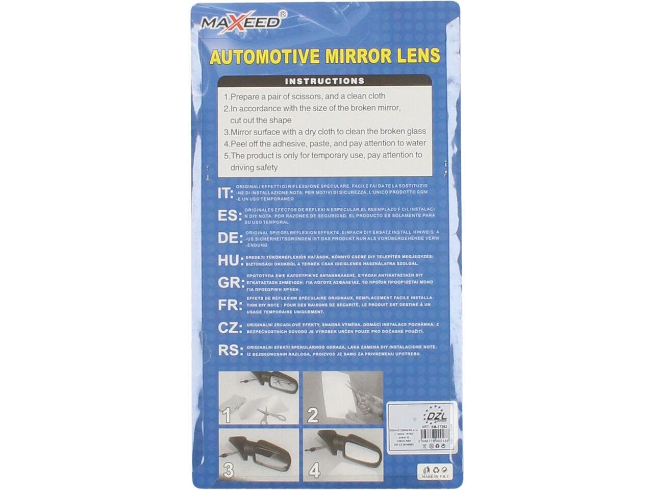 Speciální samolepící fólie s vysoce odrazivým zrcadlovým povrchem pro rychlou opravu všech typů běžných zpětných zrcátek, pro venkovní i vnitřní použití, rozměr 17.5x25cm, možnost vystřihnout do libovolného tvaru, použitelná i na vypouklá zrcátka. Snadno se upraví na požadovanou velikost nůžkami. Neslouží pro dlouhodobou náhradu sklíčka.