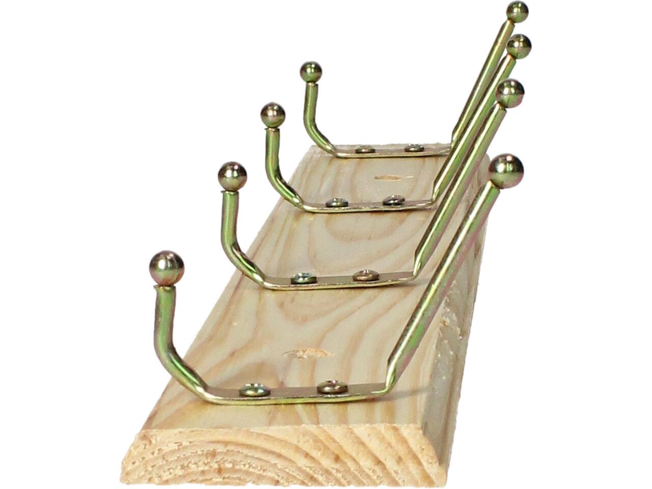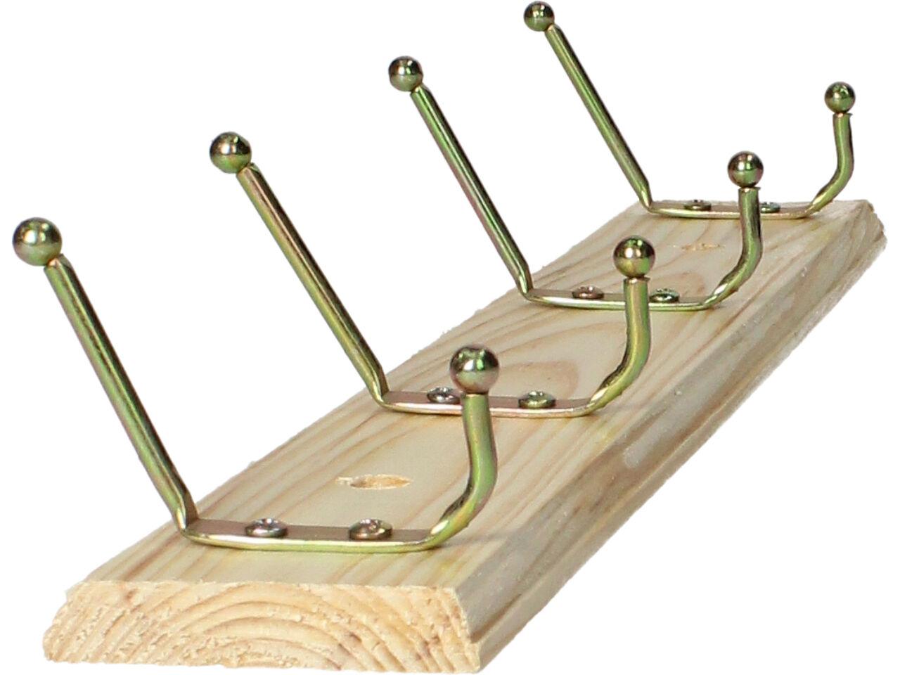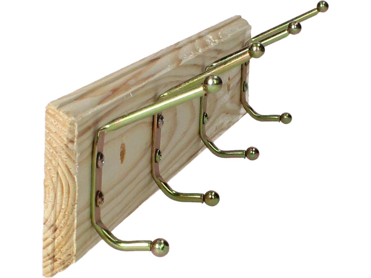 Dřevěná opracovaná lišta ze smrkového dřeva se třemi kovovými věšáky, každý se dvěma poutky, ve zlaté barvě je decentní, vkusný a malý věšák. Na těle má již dva předvrtané otvory na šrouby k přichycení na stěnu či dvěře. Instalace je jednoduchá, součástí balení jsou i dvě hmoždinky a šroubky pro přichycení. Tento věšák najde své uzplatnění nejen doma na předsíni, ale i v koupleně, v kuchyn, dílně, garáži atd.