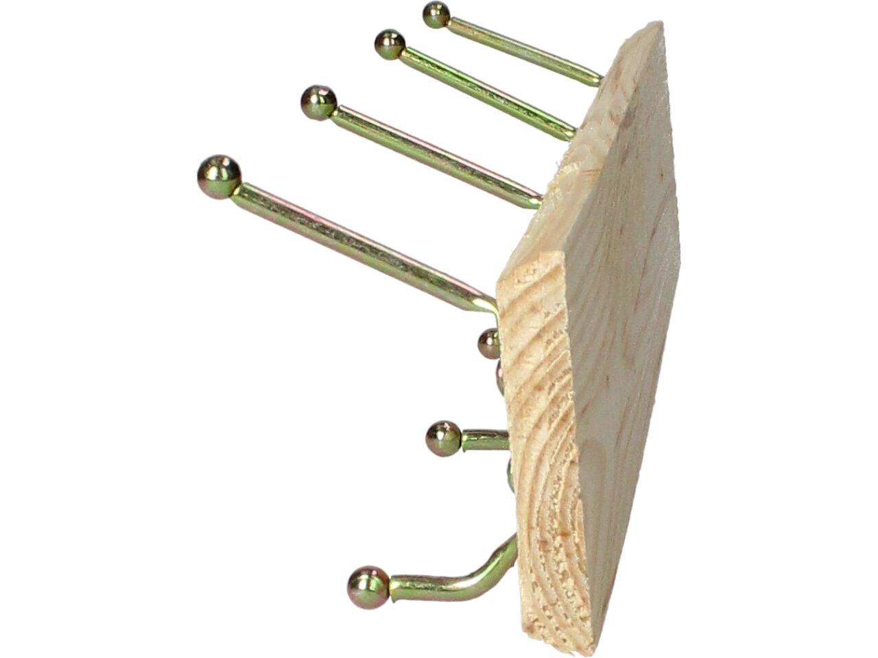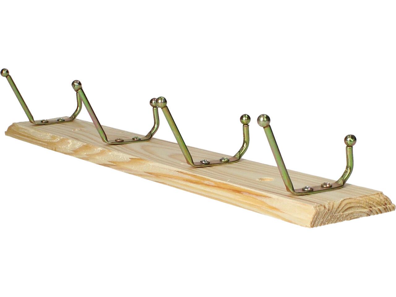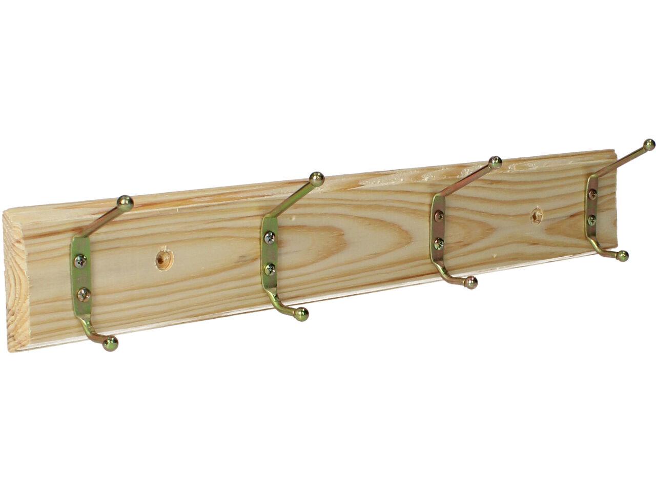 Dřevěná opracovaná lišta ze smrkového dřeva se třemi kovovými věšáky, každý se dvěma poutky, ve zlaté barvě je decentní, vkusný a malý věšák. Na těle má již dva předvrtané otvory na šrouby k přichycení na stěnu či dvěře. Instalace je jednoduchá, součástí balení jsou i dvě hmoždinky a šroubky pro přichycení. Tento věšák najde své uzplatnění nejen doma na předsíni, ale i v koupleně, v kuchyn, dílně, garáži atd.