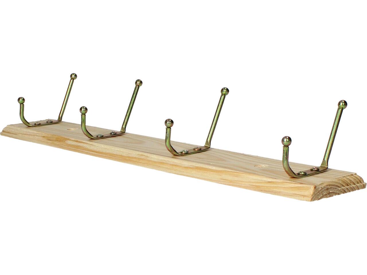 Dřevěný věšák na zeď - přírodní vzhled, dřevěná smrková lišta a tři věšáčky ve zlaté barvě to je vkusný, jednoduchý a praktický věšák za super cenu jen u nás - akce
