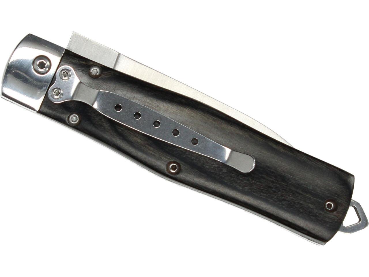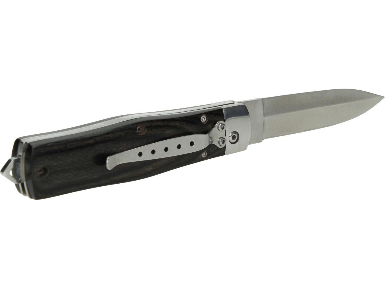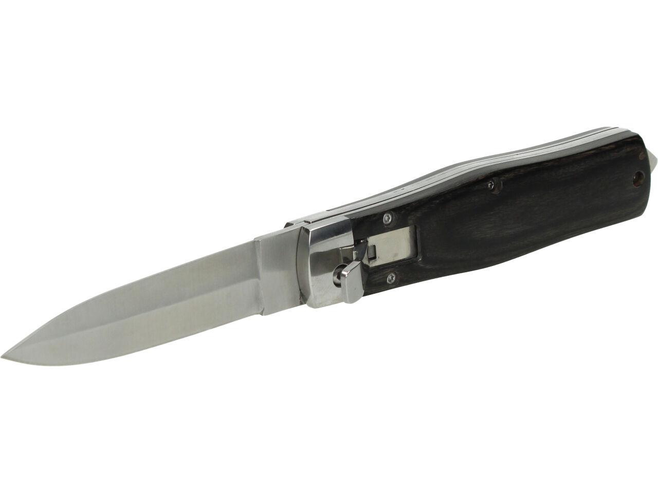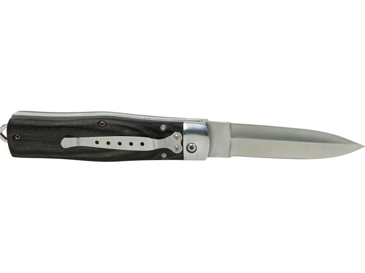 Kvalitní nůž od značky Nakida patří mezi vystřelovací noře s tmavou střenkou se zdařilou imitací dřeva a černými pruhy o délce 20cm v rozloženém stavu, pojistkou a poutkem na přichycení. Tento kapesní skládací vystřelovací nůž disponuje s silnou vystřelovací pružinou a spouštěcím mechanismem (tlačítko), umístěným na jedné straně nože.