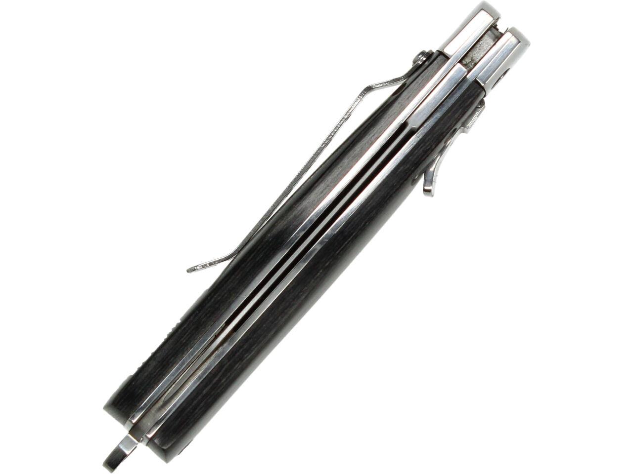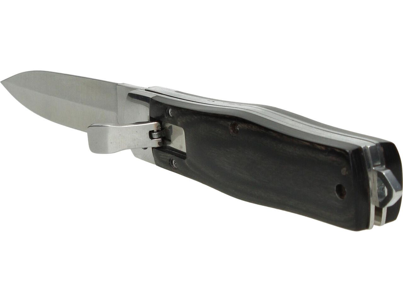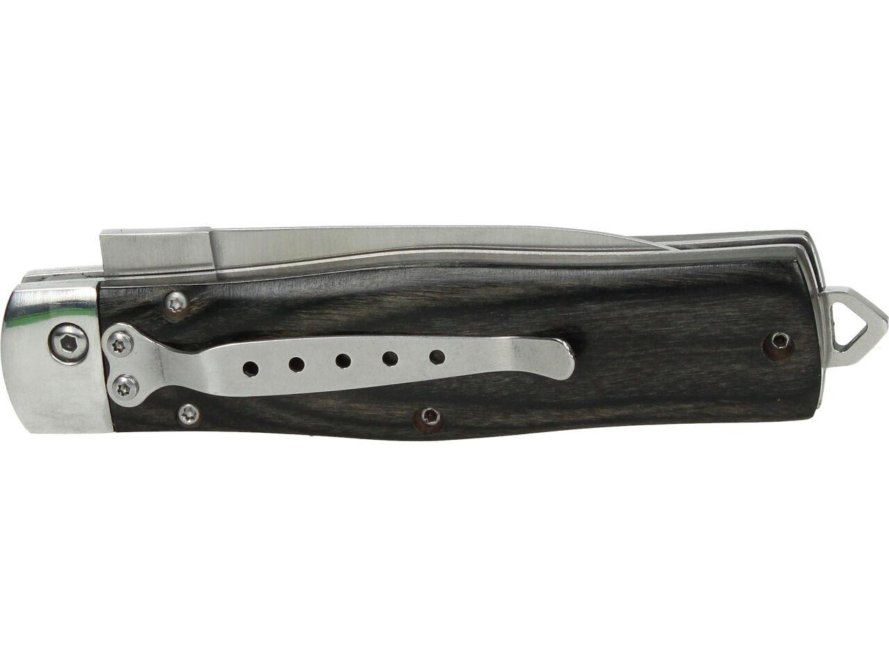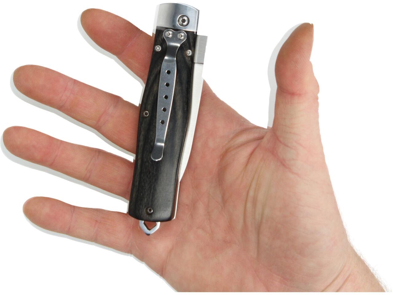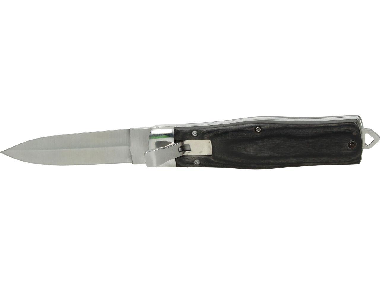 Kvalitní nůž od značky Nakida patří mezi vystřelovací noře s tmavou střenkou se zdařilou imitací dřeva a černými pruhy o délce 20cm v rozloženém stavu, pojistkou a poutkem na přichycení. Tento kapesní skládací vystřelovací nůž disponuje s silnou vystřelovací pružinou a spouštěcím mechanismem (tlačítko), umístěným na jedné straně nože.