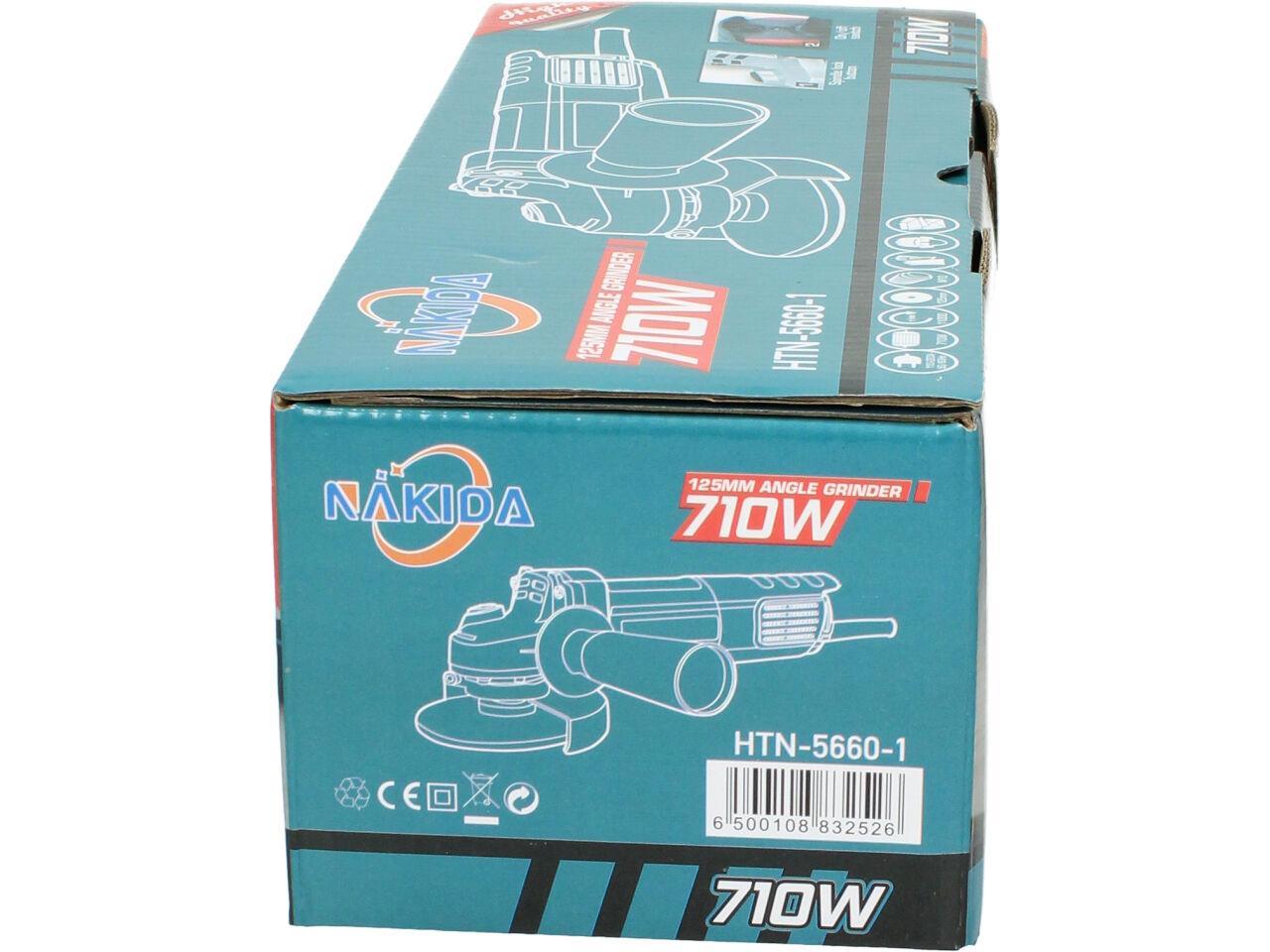 Nakida® Úhlová bruska 125mm 710W HTN-5660-1 s nastavitelným ochranným krytem a robusním držadlem s vysunovací mřížkou a ochranou motoru proti nešistotám. Bruska je dodávána s brusným kotoučem a náhradními uhlíky.