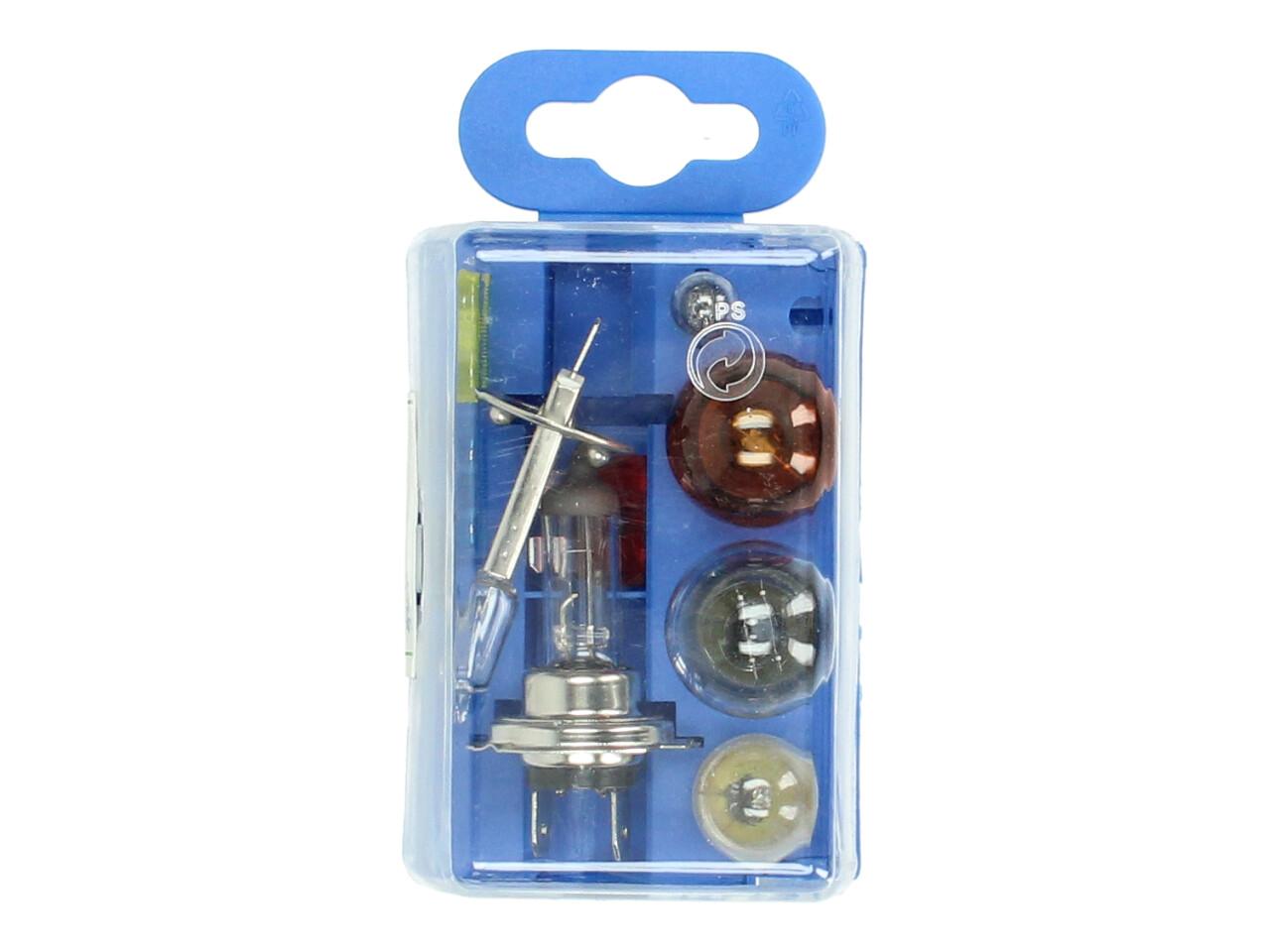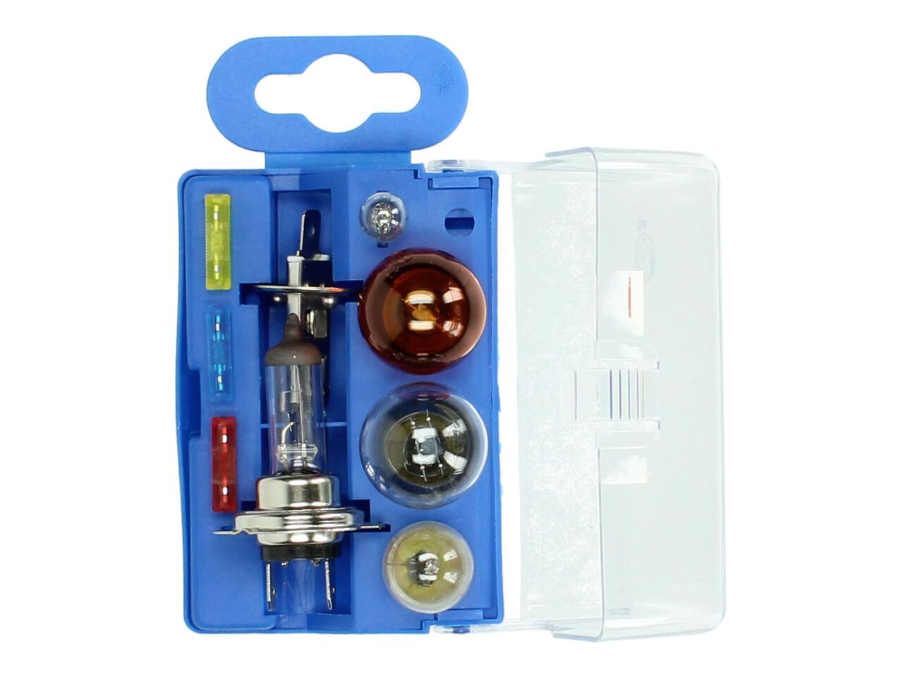 Sada žárovek v plastovém boxu celkem 9 kusů a to H1, H7, 5W, dvouývláknová 21a5W, oranžová 21W, pojistka žlutá, pojistka modrá a červená v praktickém boxu k zavěšení nebo vožení s sebou.