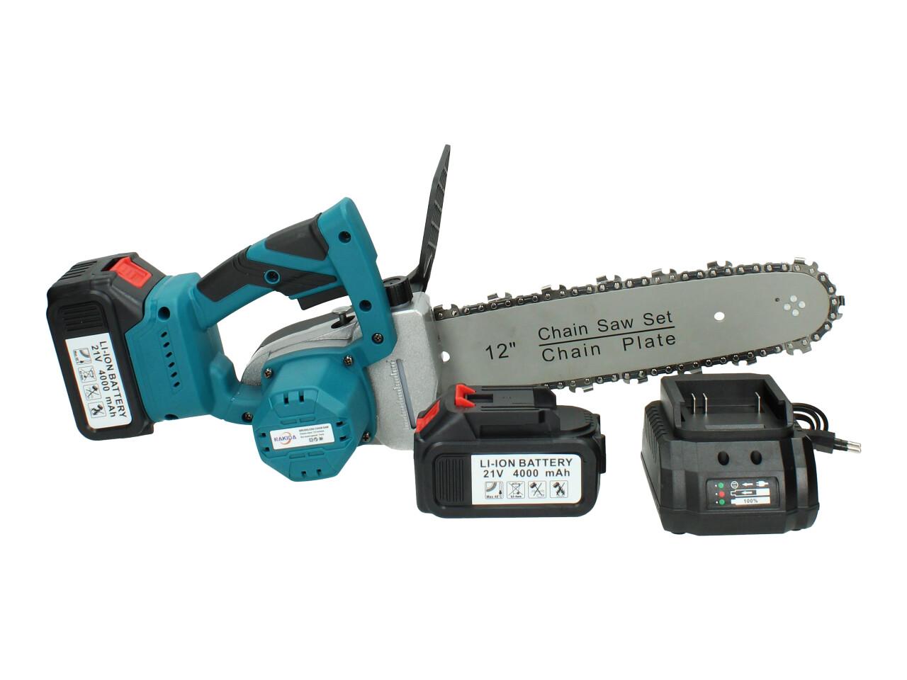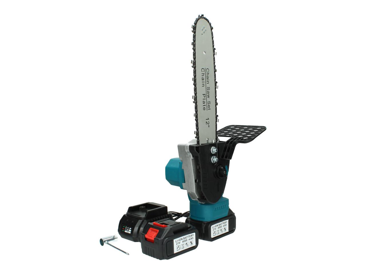 Pilka s lištou 12 palců pro řezání větších nebo špatně přístupných větví včetně 2 kusů akumulátorů, nabíječky a řetězu. Pila je vybavena bezklíčovým napínáním řetězu a přímazem lišty a řetězu tak, jako u profesionálních motových pil. Pilka je tak určena pro větší zátěž (nádobka na olej).