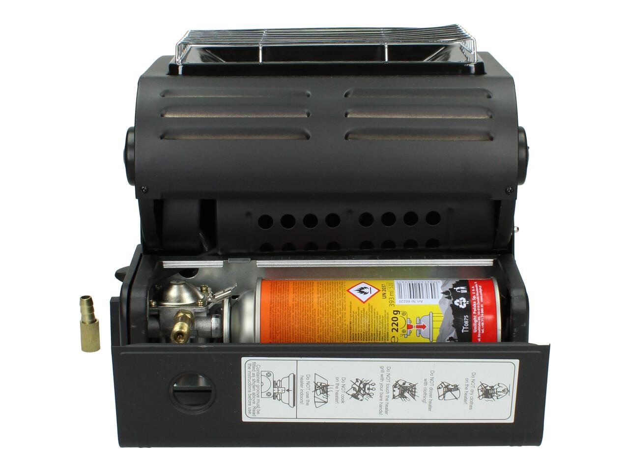 ➡ Vařič lze napájet jak plynem z Propan-butanové láhve do 3 kg nebo butanem z kartuše 400ml227g.