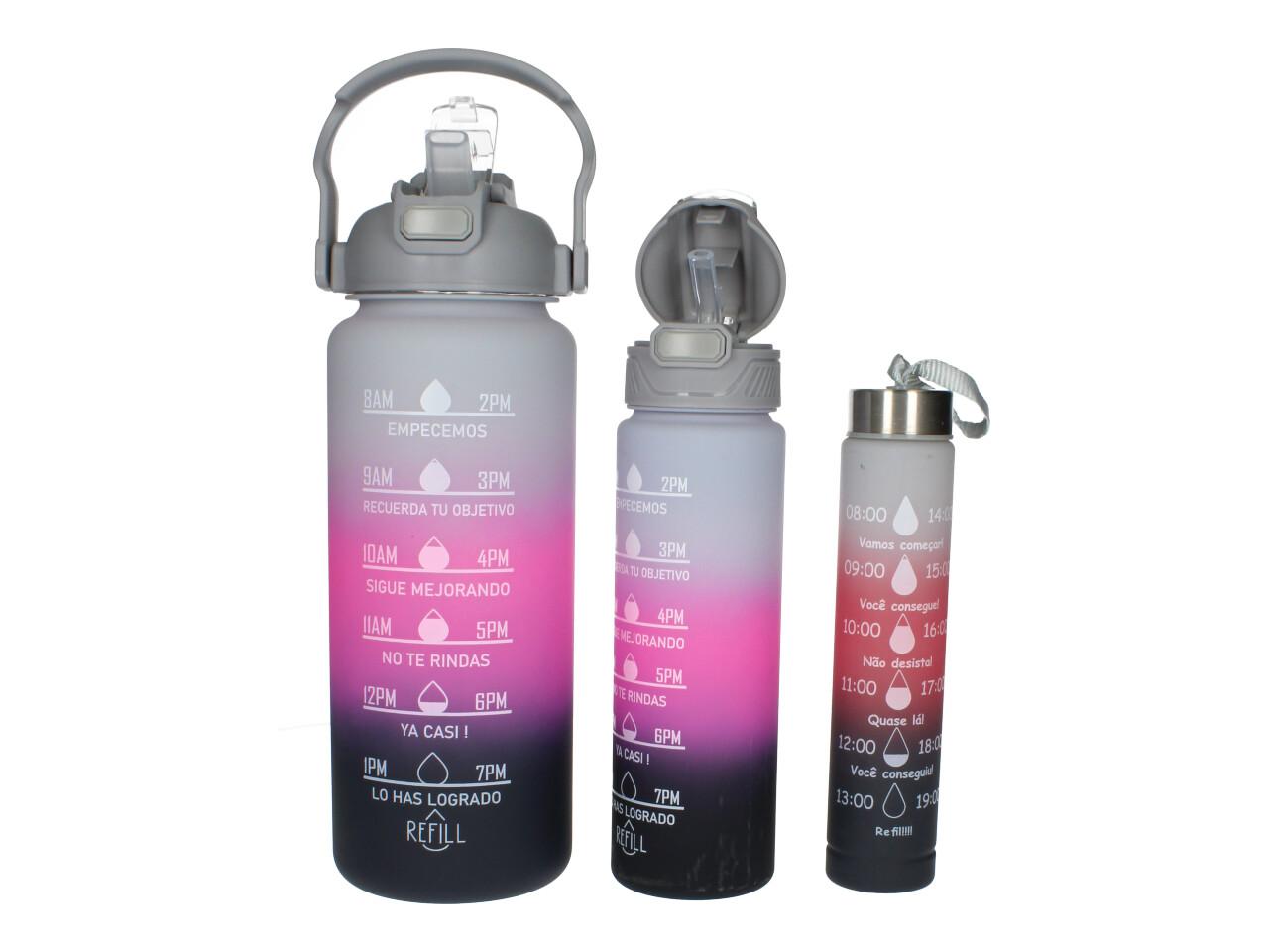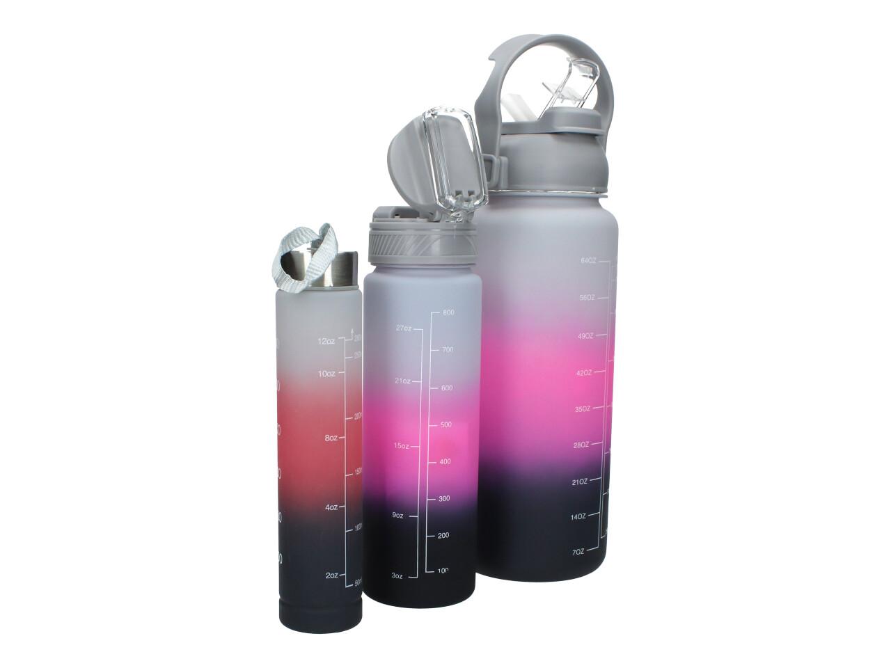 Každá z lahví má odměrku, která ukazuje, kolik vody bylo vypité. Přijměte výzvu k lepšímu zdraví!