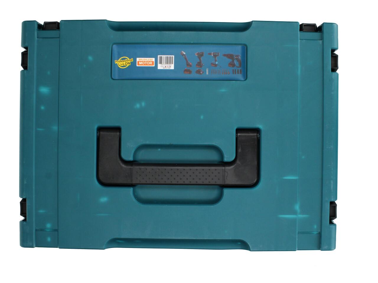Sada obsahuje kufr, aku flexu, aku bourací kladivo, aku vrtačku a aku rázový utahovák. Dále obsahue nástrčení klíče pro aku rázový utahovák, nabíječku, sadu magnetických bitů a popruh na rameno. Dále obsahuje 2x vrták SDS průměr 6 + 8 délka 15xm a poutko přes rameno.