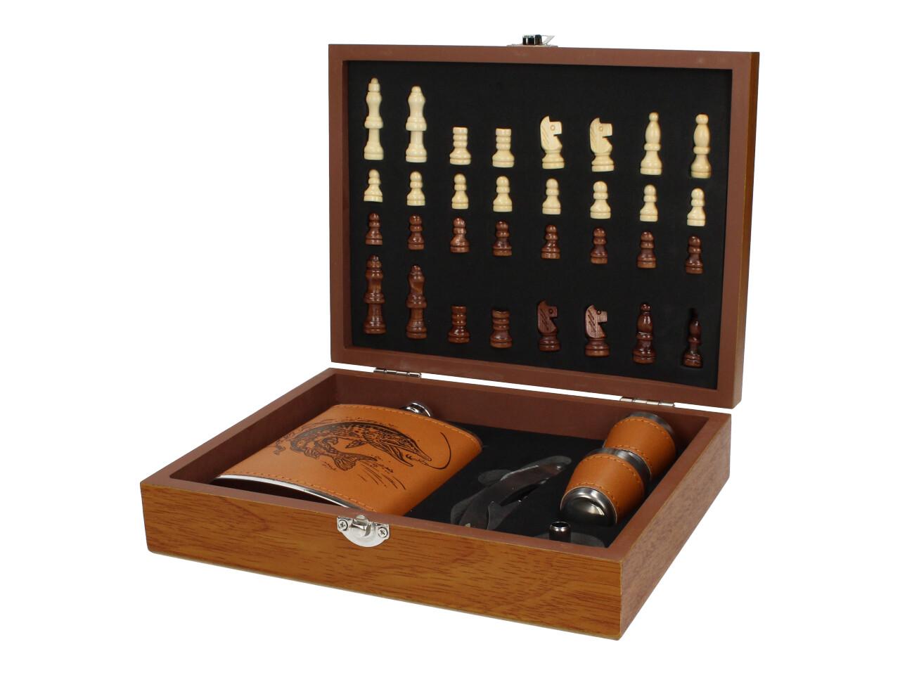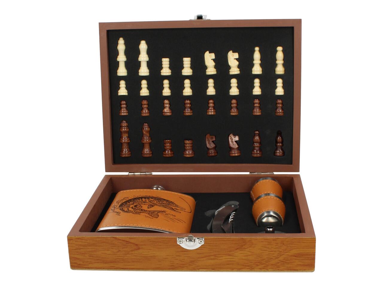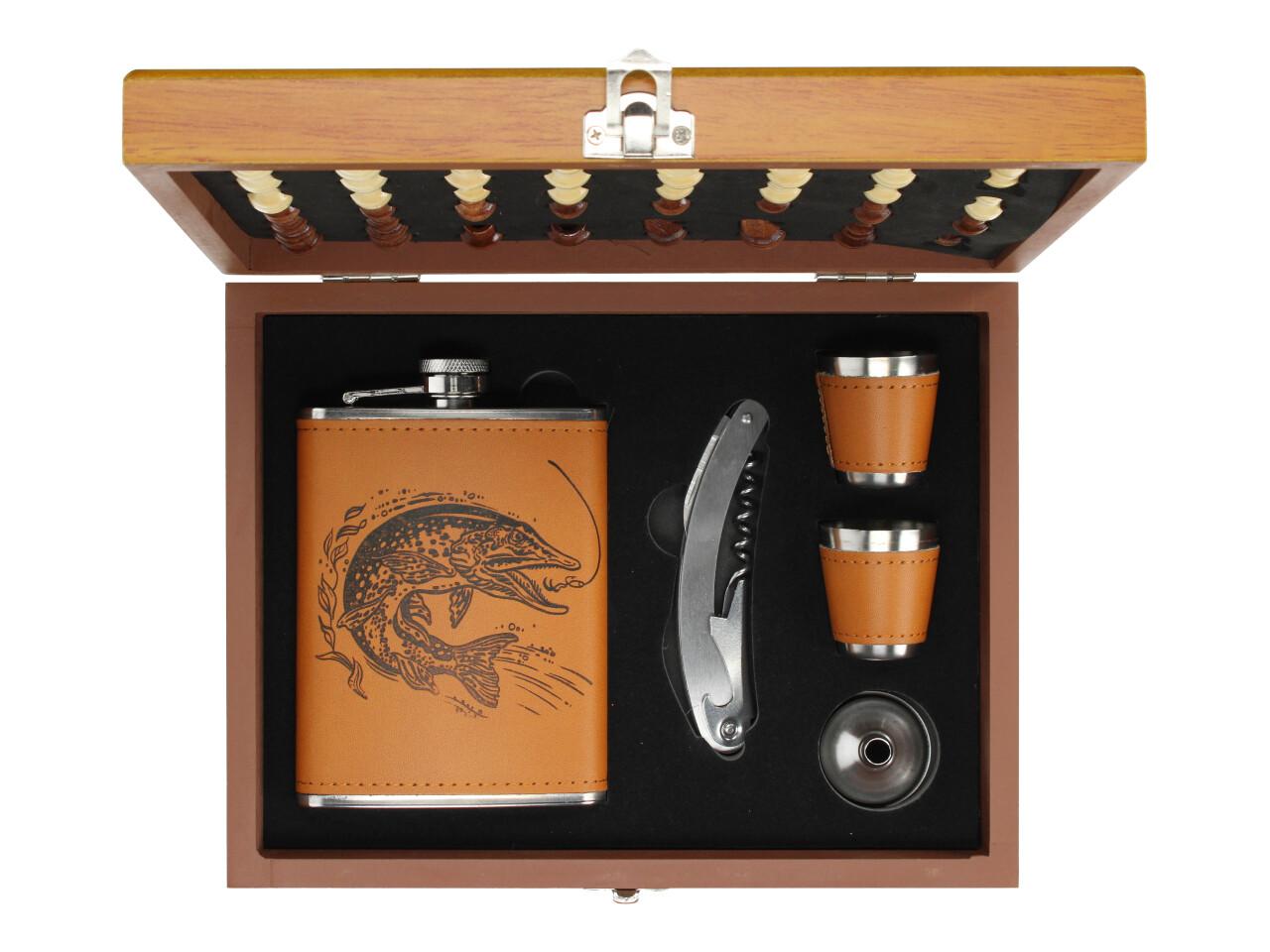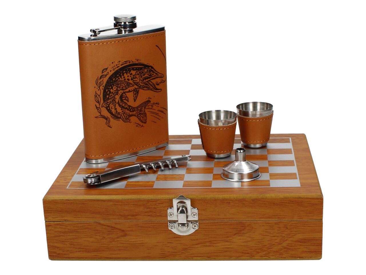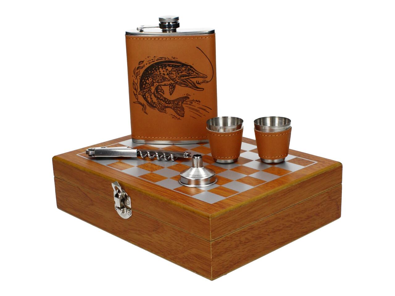 Stylová dárková sada pro milovníky přírody, rybářů i dobrodruhů! Tato sada obsahuje elegantní placatku, čtyři kovové panáky a praktický otvírák na láhve. Celý set je potažen kvalitní koženkou s unikátním motivem štiky, který podtrhne váš styl na každé výpravě.