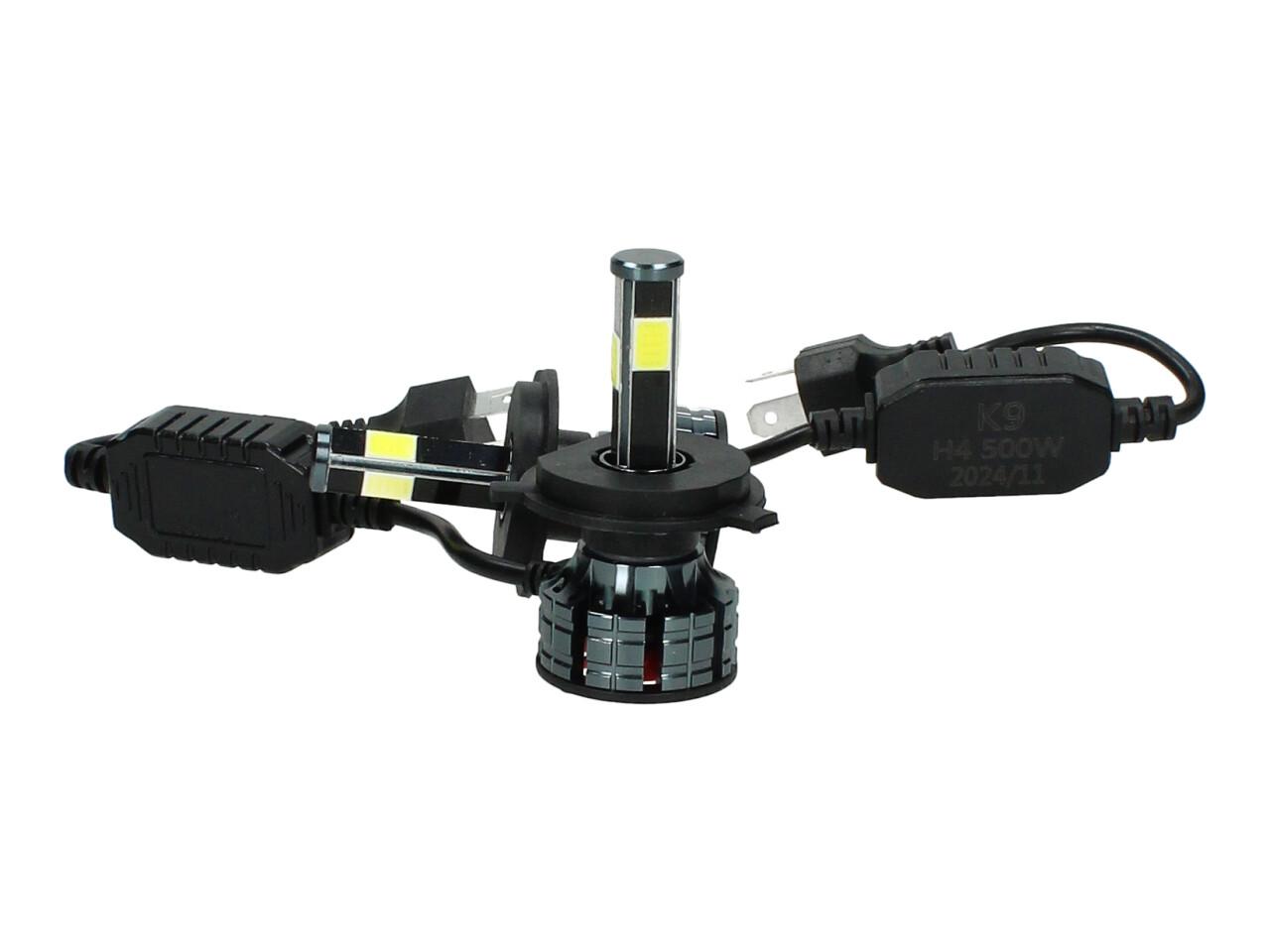 Sada LED H4 K9 autožárovek do předních světlometů o výkonu 2x250W v sadě 2kusů, barva světla 6000K - studená bílá, LED autožárovky s vysokou svítivostí, Chlazení ventilátorem, Svítivost 42500lm/žárovka (85000lm/pár) - klasická halogenová žárovka má cca 1100lm Výkon 2x250W, napájecí napětí DC 8V - 48V, ochrana IP65