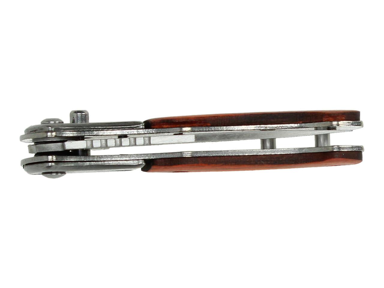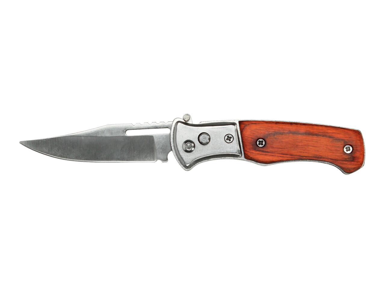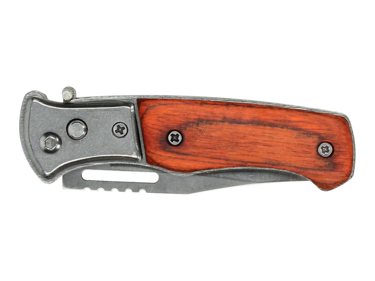 Špičkový vystřelovací nůž s dřevěnou střenkou o délce 15 cm v rozloženém stavu, pojistkou a poutkem na přichycení. Tento kapesní skládací vystřelovací nůž disponuje s velmi silnou vystřelovací pružinou a spouštěcím mechanismem, umístěným na jedné straně nože.