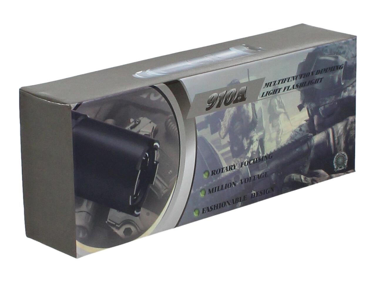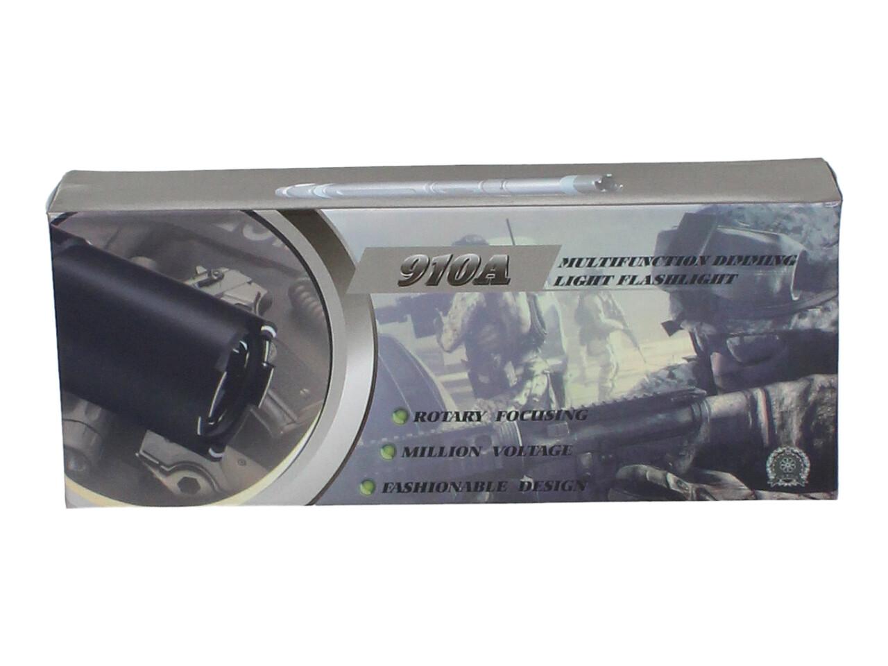 Baterka 910 A s výkonem diody 1 W poskytuje světelný tok 150 lm a zároveň slouží jako účinný paralyzér s napětím až 100 kV. Ovládání je maximálně jednoduché – dvoupolohový vypínač zapíná/vypíná svítilnu, zadní spínač odjišťuje paralyzér a aktivace se provádí stiskem tlačítka. Krátký kontakt vyvolá šok a odradí útočníka, delší způsobí ochromení a ztrátu orientace na několik minut.